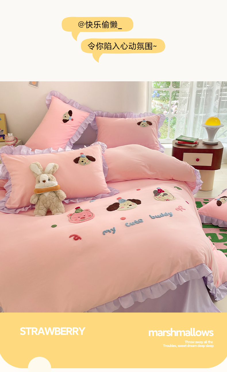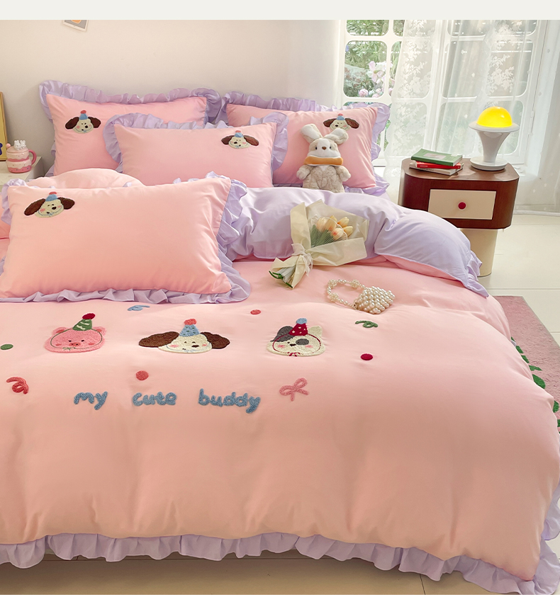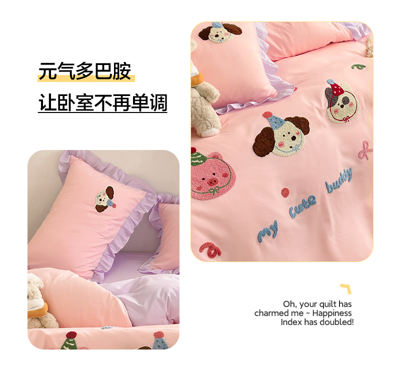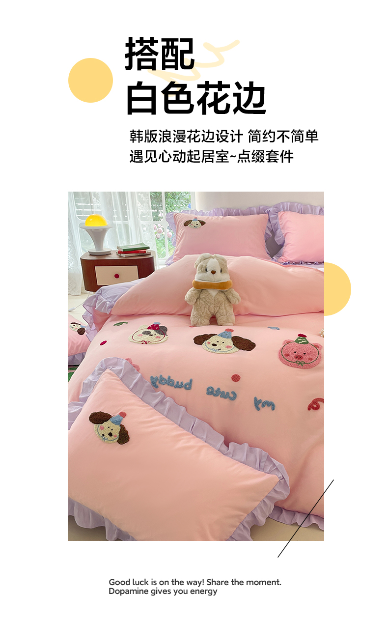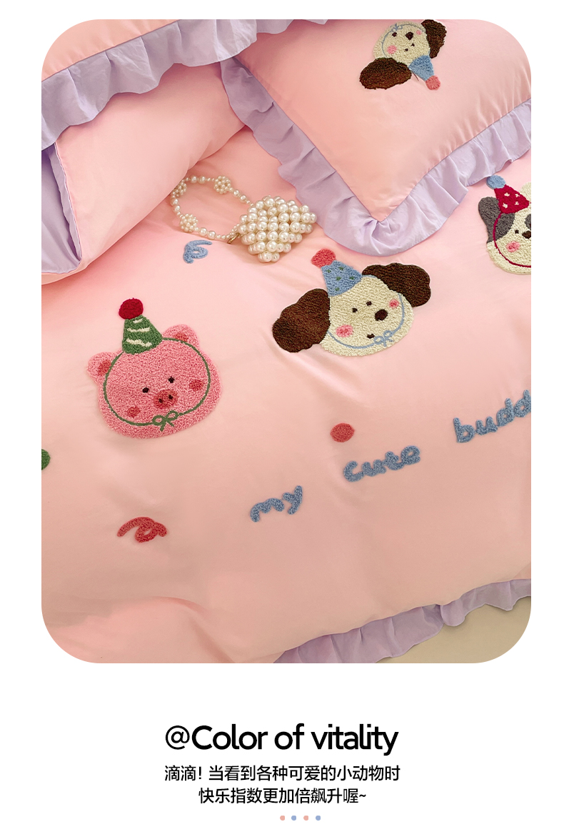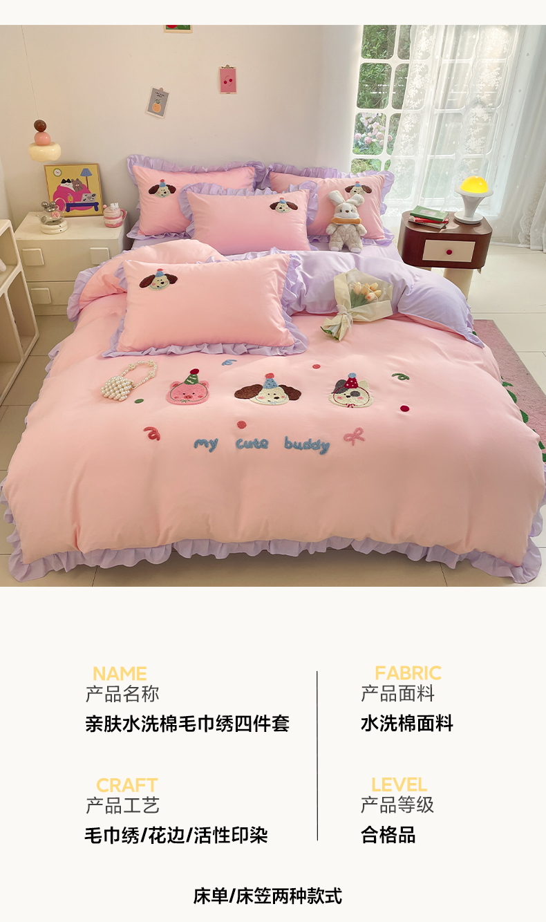 当前位置: 91家纺网 > 商品网购 > 床品套件 > 四件套 > 毛巾绣四件套 > 易禾家纺 2024新款专板花型亲肤水洗棉毛巾绣花边四件套-小伙伴 小伙伴-粉紫