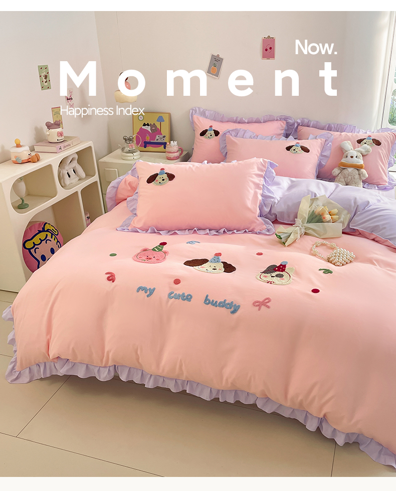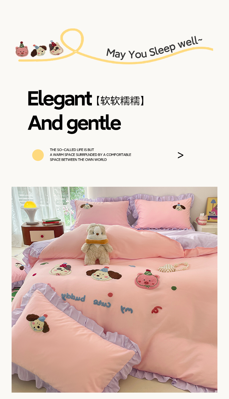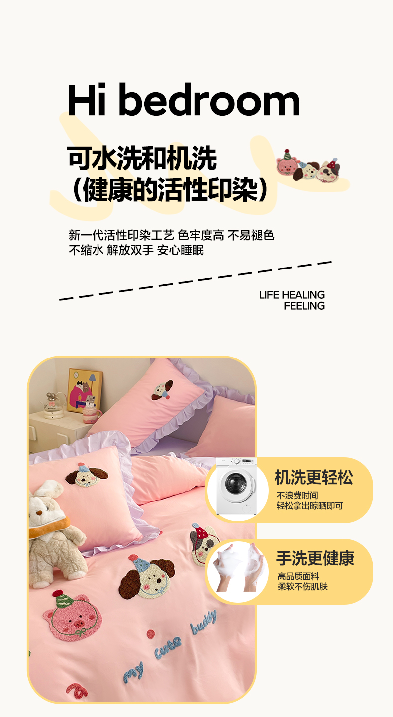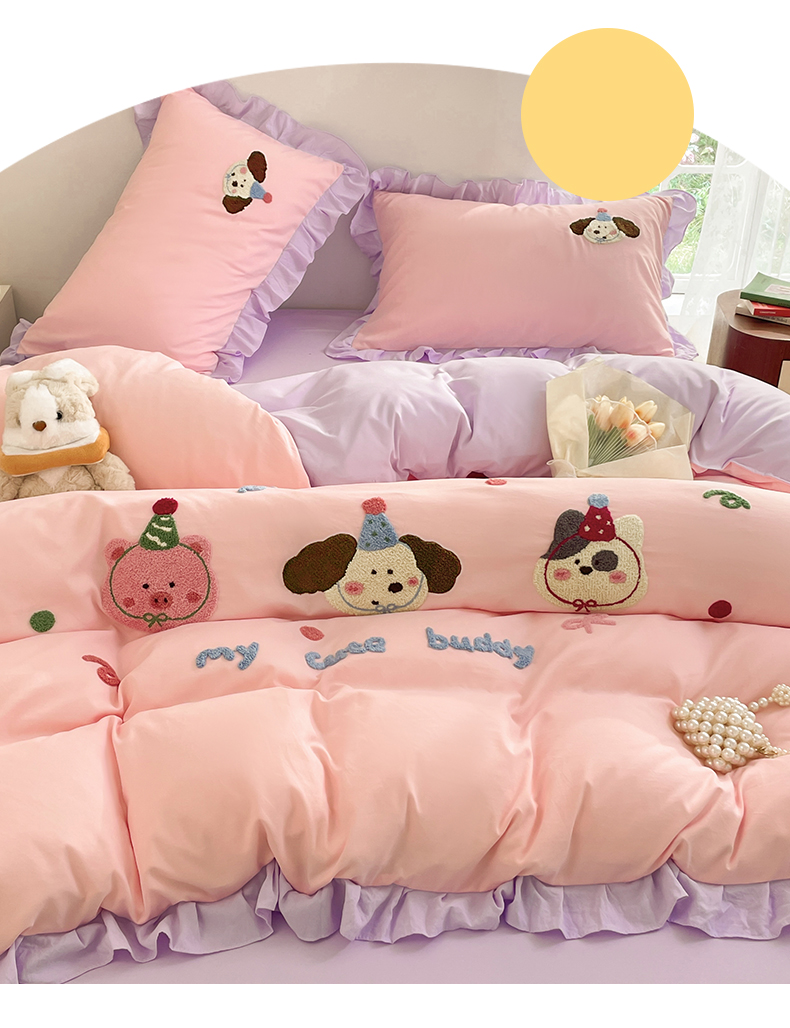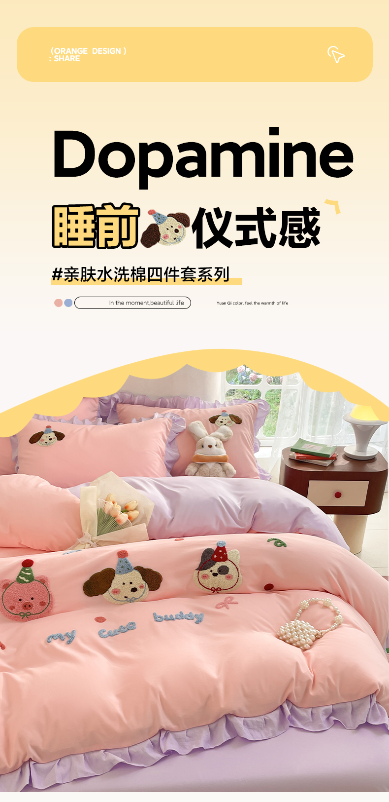当前位置: 91家纺网 > 商品网购 > 床品套件 > 四件套 > 毛巾绣四件套 > 易禾家纺 2024新款专板花型亲肤水洗棉毛巾绣花边四件套-小伙伴 小伙伴-粉紫