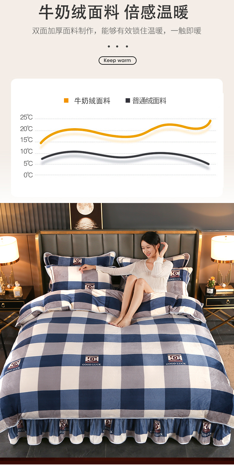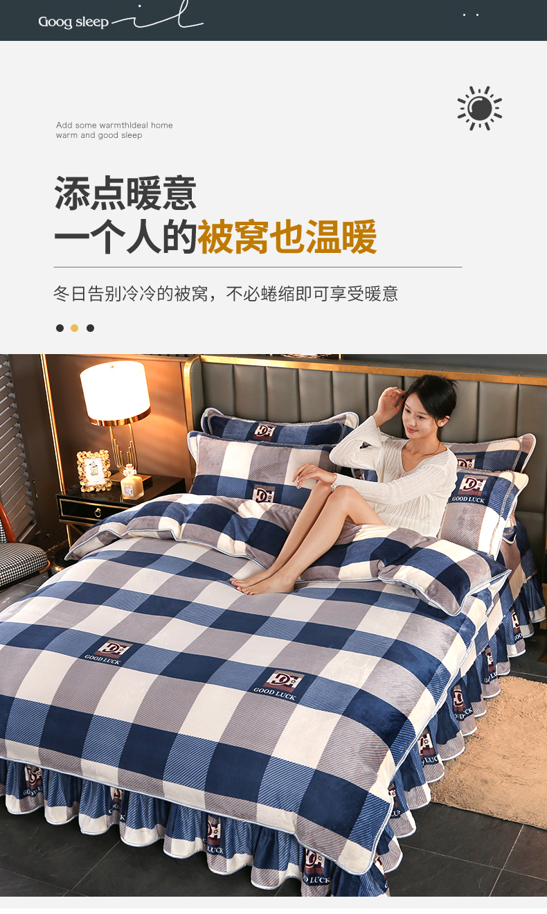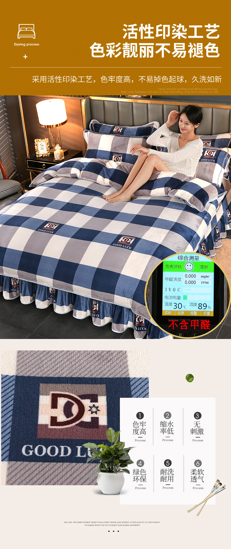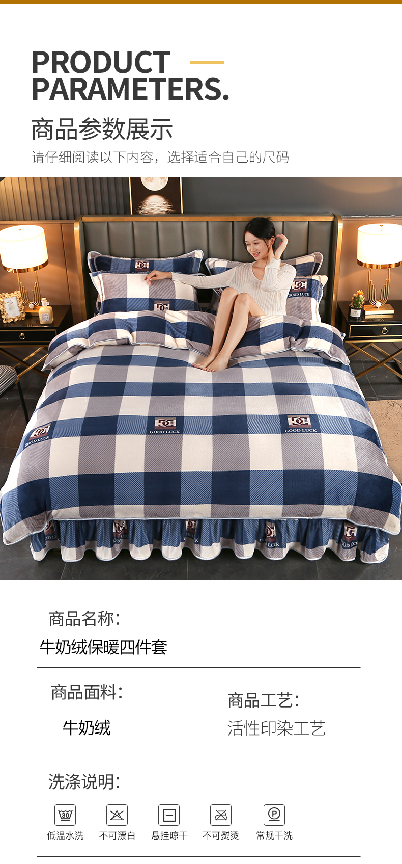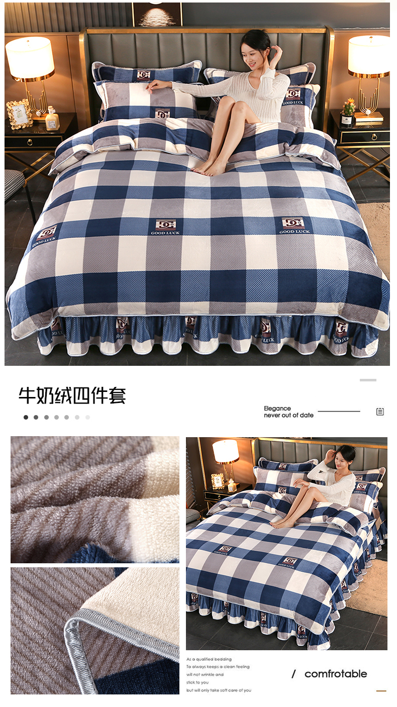 商品名称:代芙家纺 7斤重牛奶绒金貂四件套抗静电法莱绒珊瑚绒床裙 蓝大格