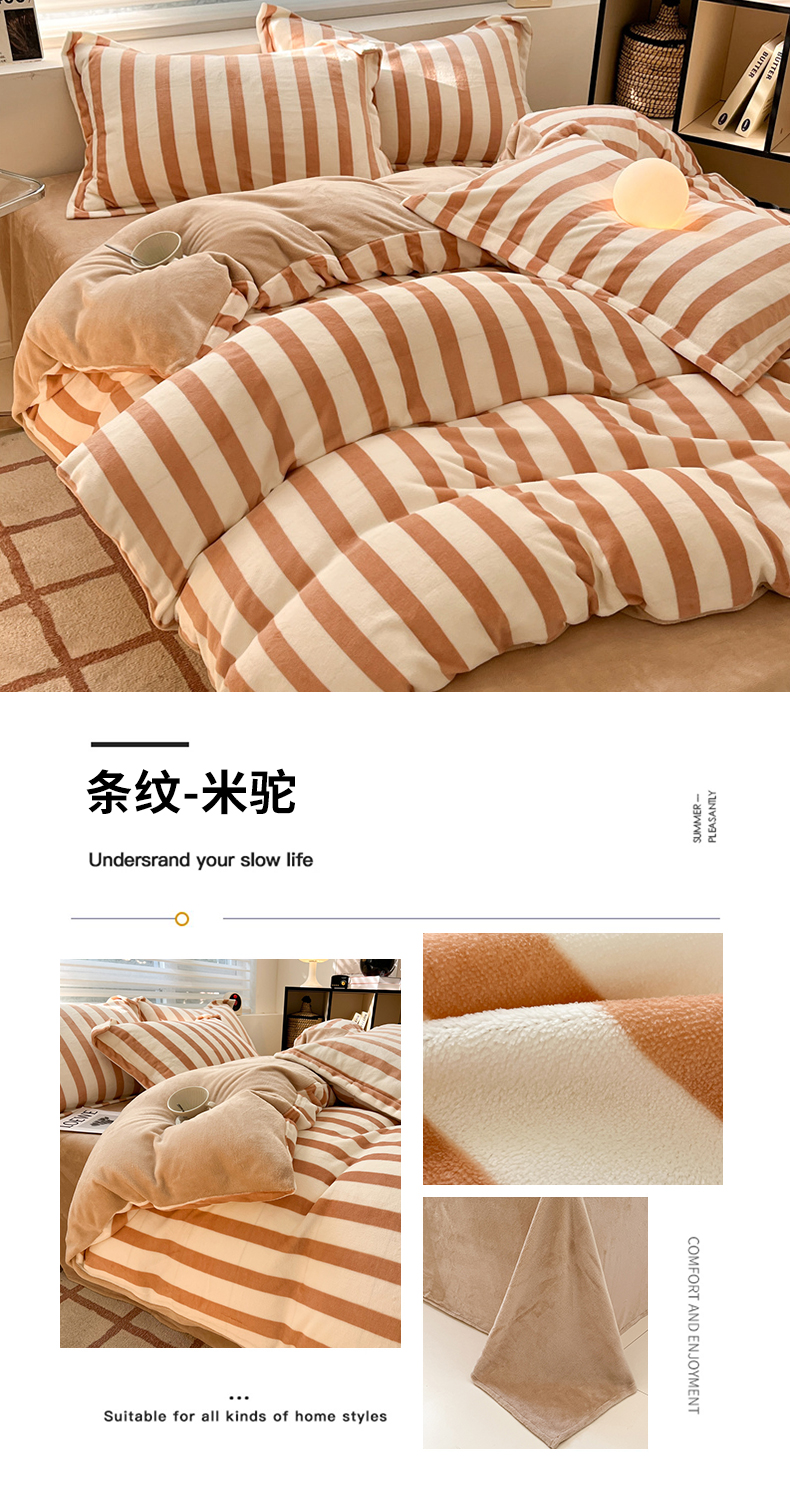 商品名称:启程家纺 2024新款无印风A类牛奶绒四件套 条纹-米驼