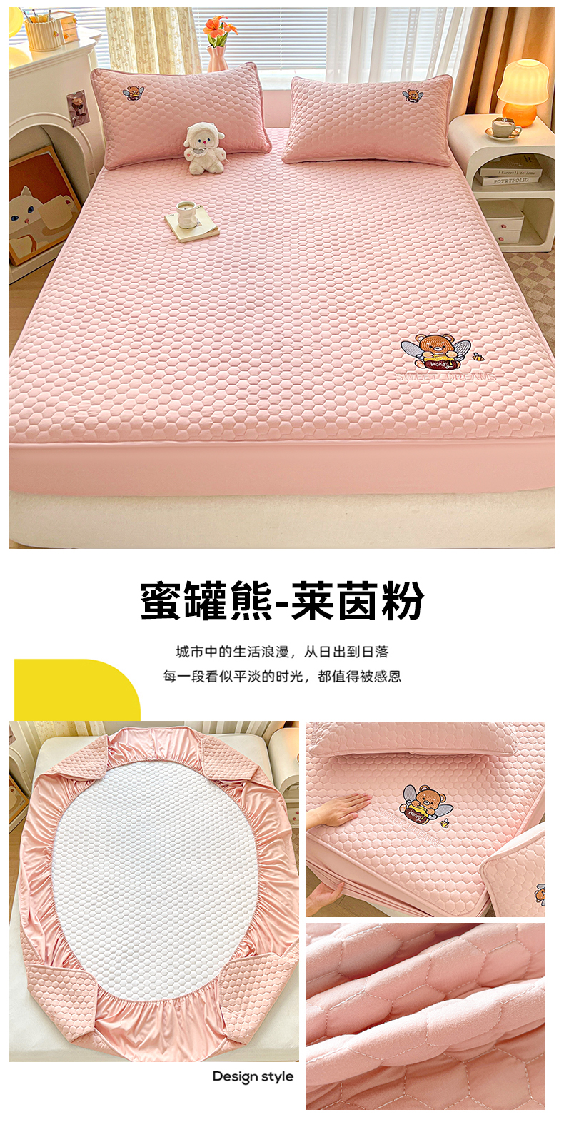 • 91家纺网 家纺一手货源 找家纺 九亭家纺 2024新款A类大豆刺绣夹棉床笠 蜜罐熊-莱茵粉