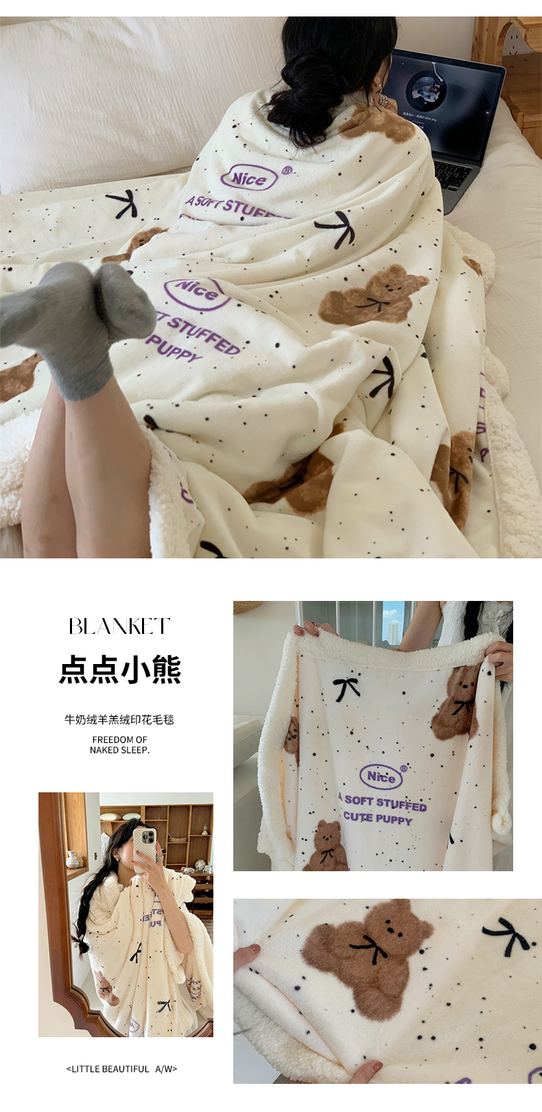 商品名称:桃喜 2024新款亲肤舒适牛奶绒羊羔绒毛毯 点点小熊