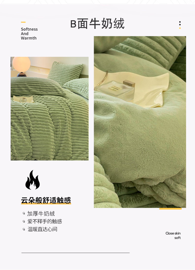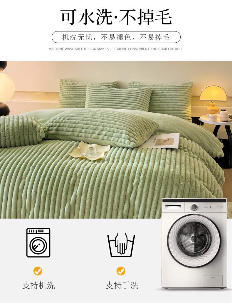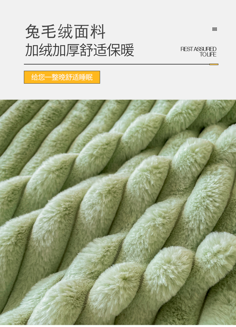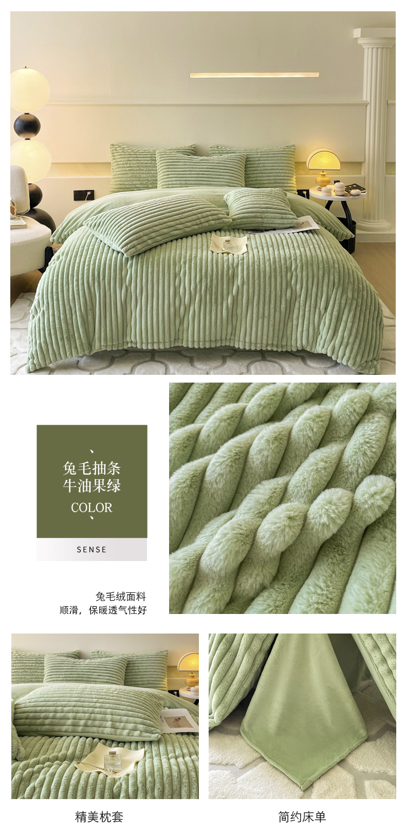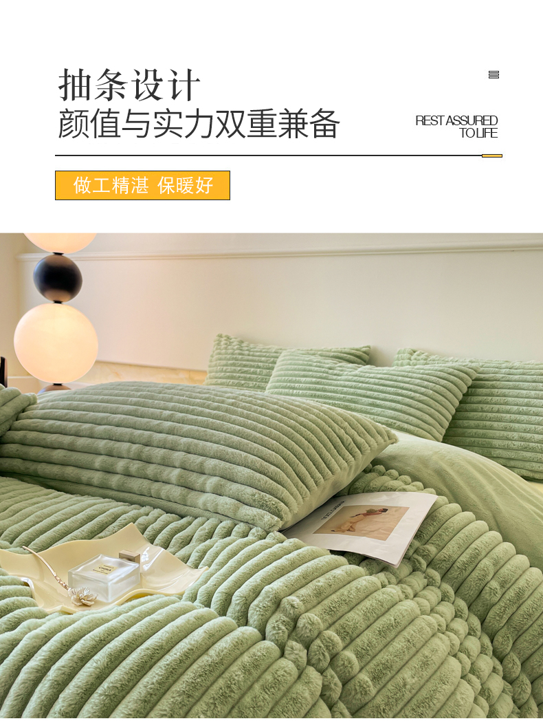 商品名称:2024新款全消光兔毛320克牛奶绒A类纯色立体四件套 兔毛抽条牛油果绿