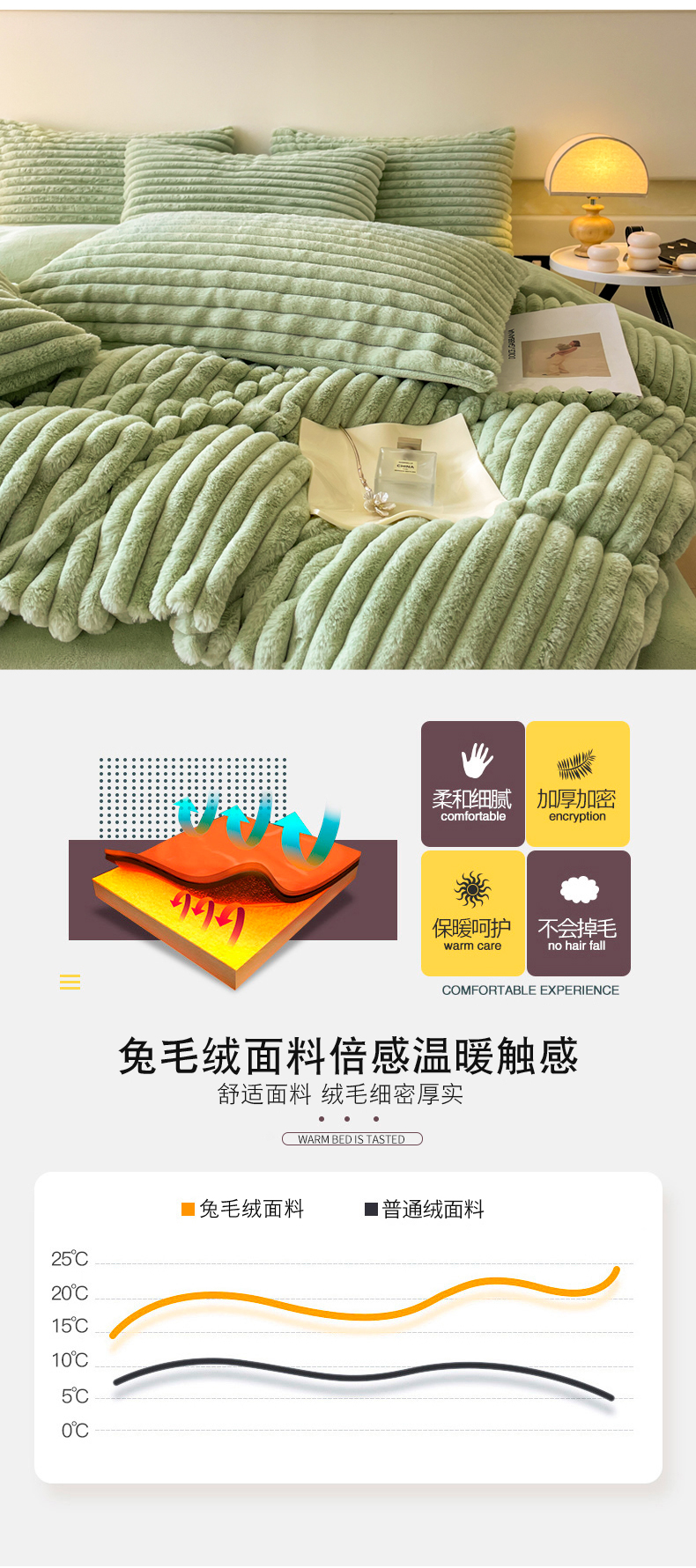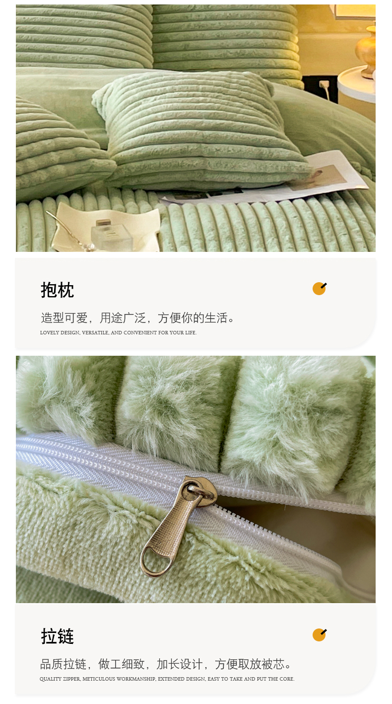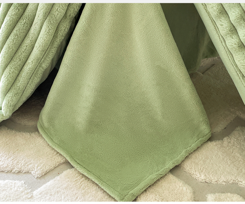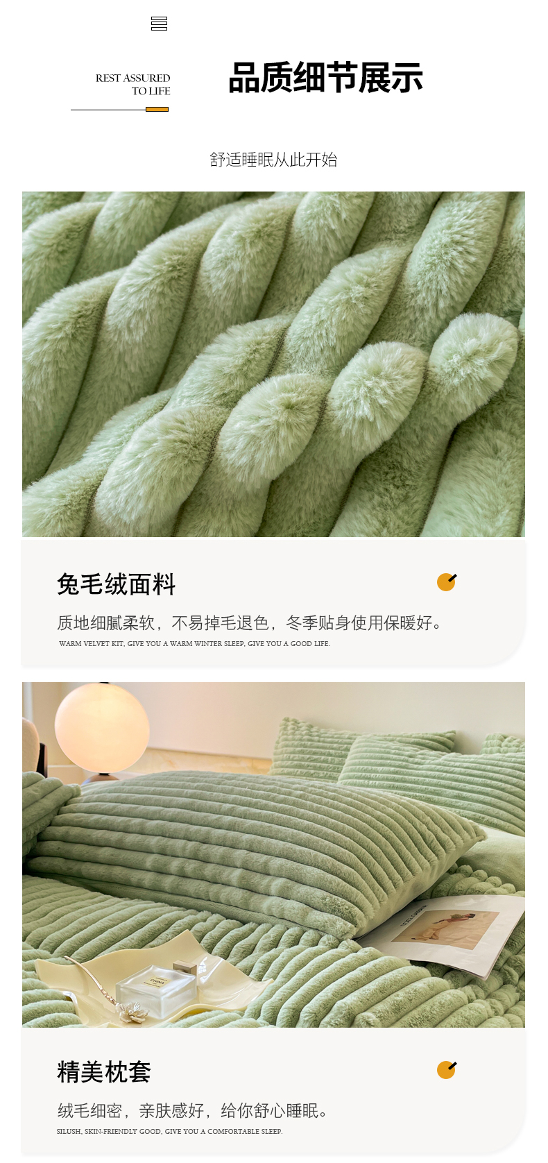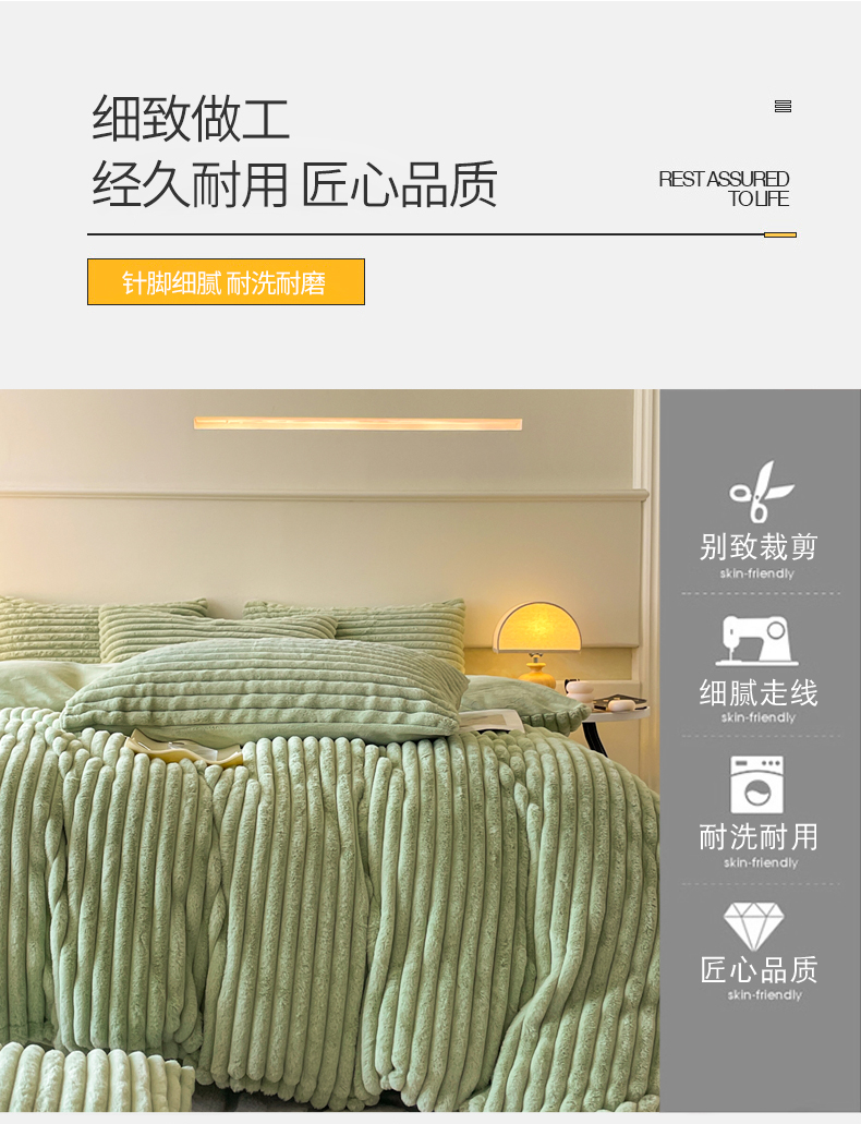 商品名称:2024新款全消光兔毛320克牛奶绒A类纯色立体四件套 兔毛抽条牛油果绿