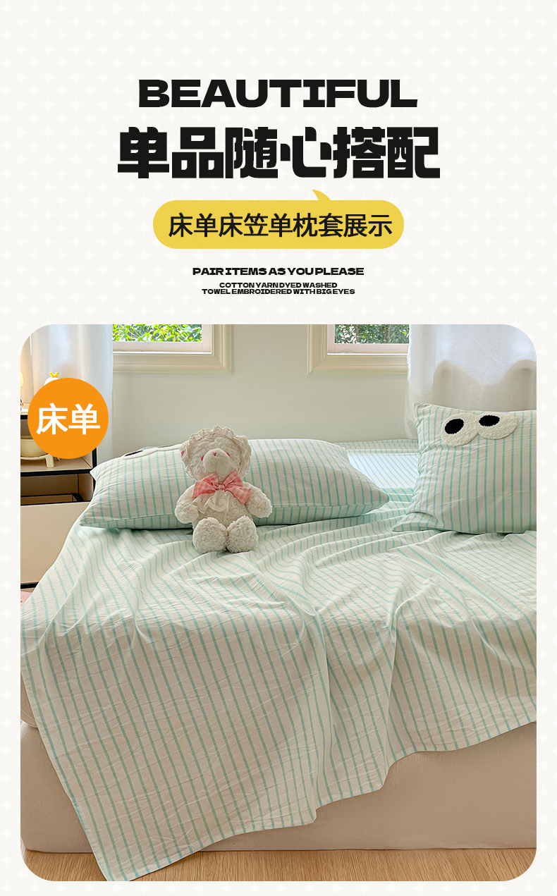 桃子 2024新款ins纯棉色织水洗毛巾绣大眼仔单床笠 色织水洗棉-大眼仔兰绿条