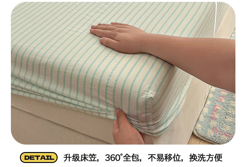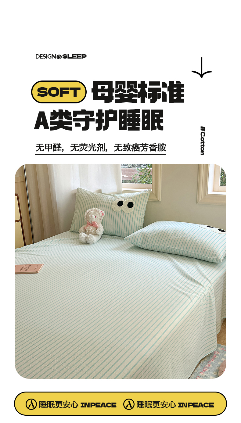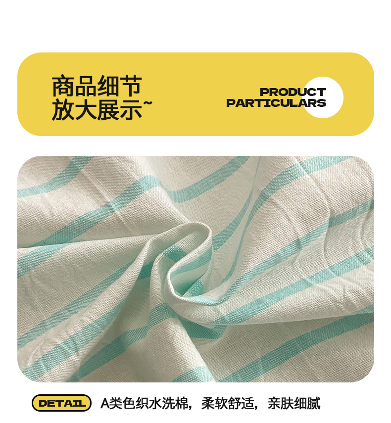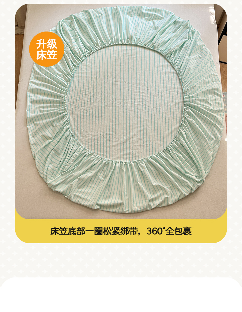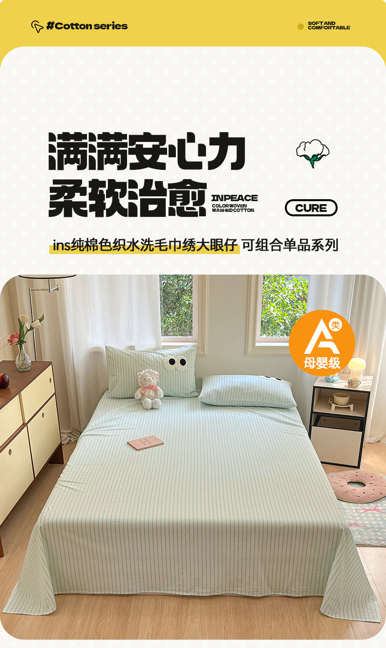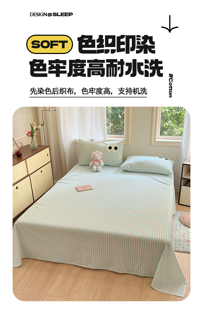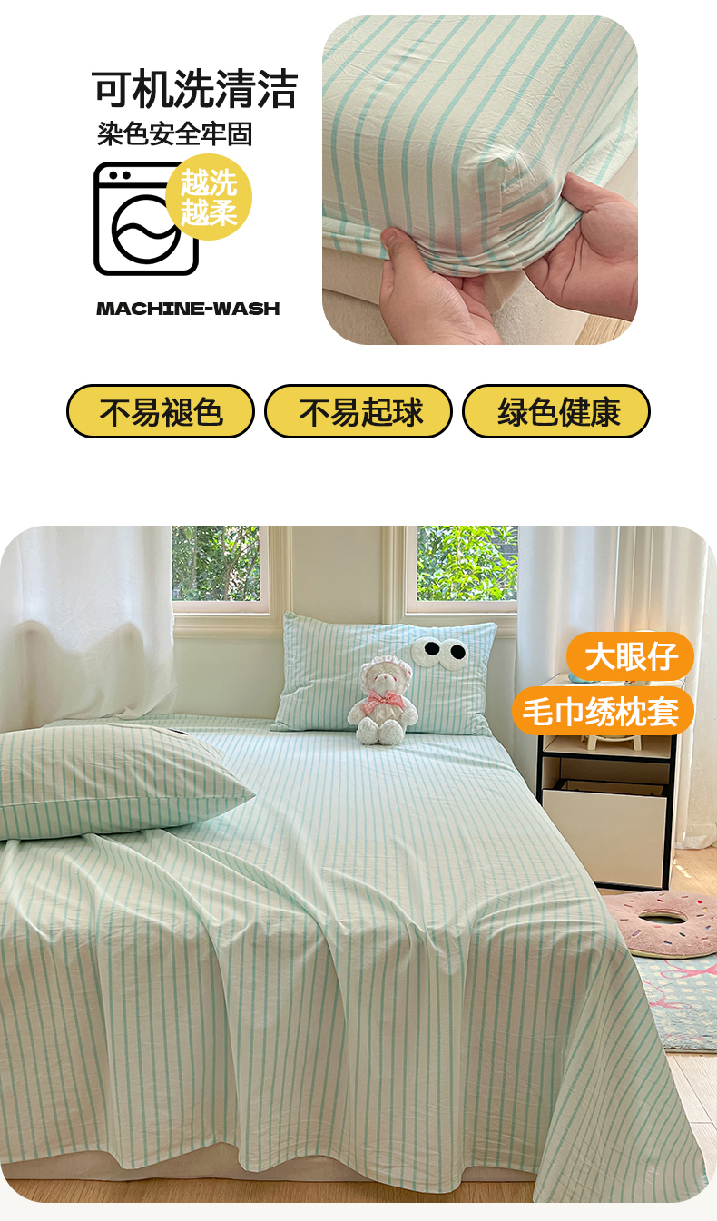 • 91家纺网 家纺一手货源 找家纺 桃子 2024新款ins纯棉色织水洗毛巾绣大眼仔单床笠 色织水洗棉-大眼仔兰绿条