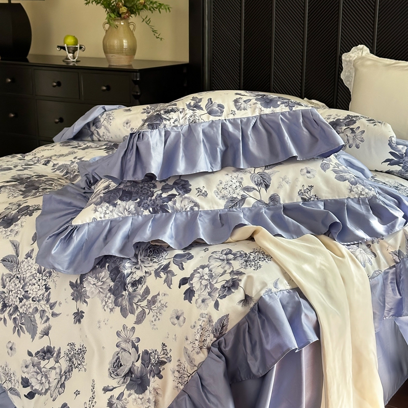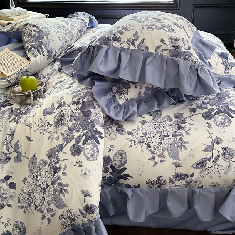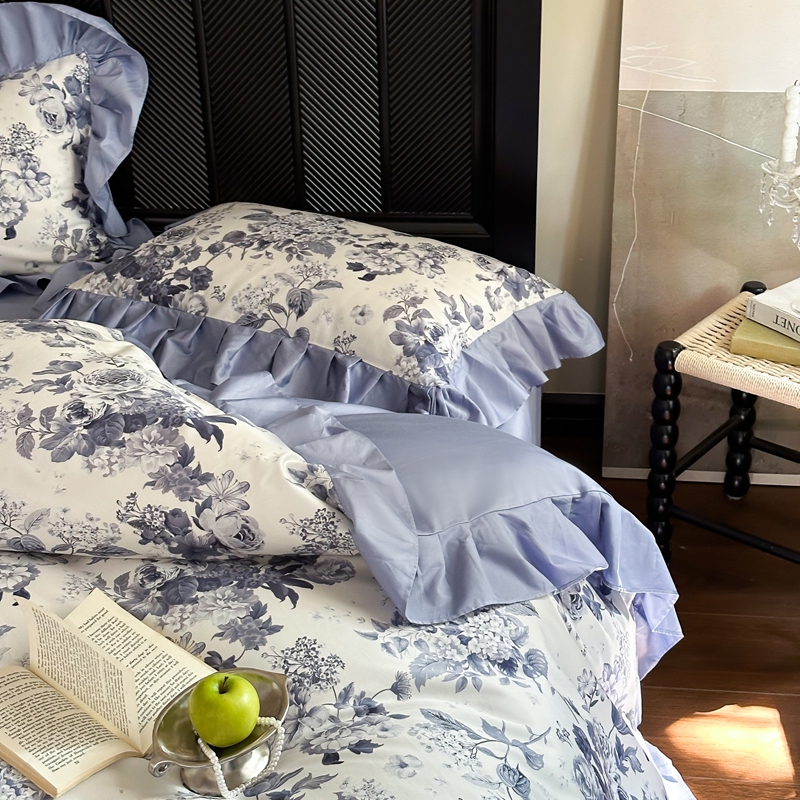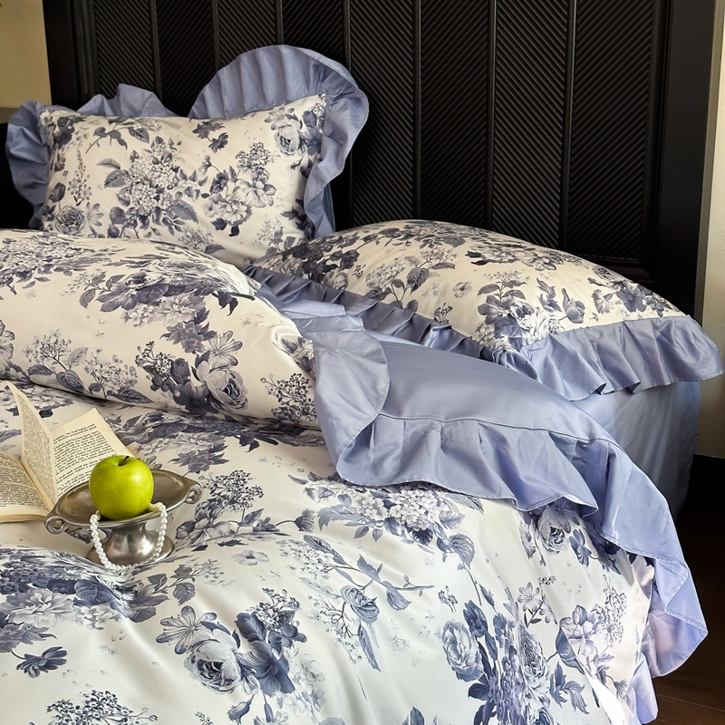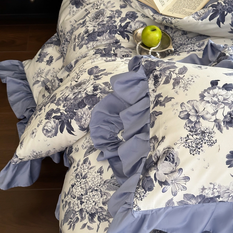 (总)窝米 2025新款数码印花100支长绒棉纯棉工艺花边款四件套-青花瓷,青花瓷