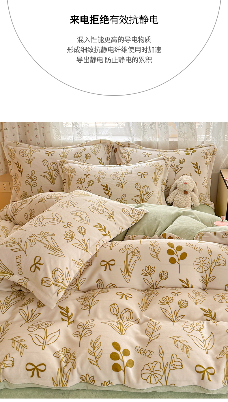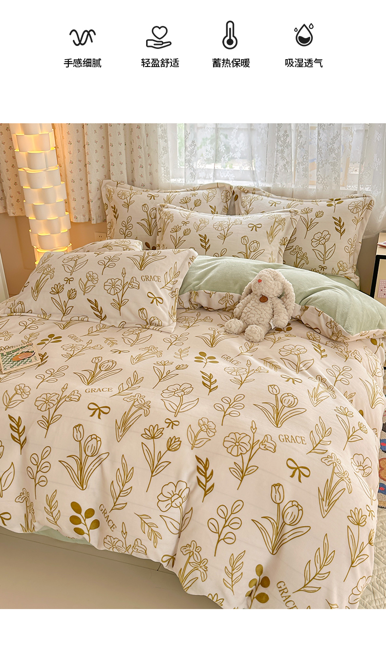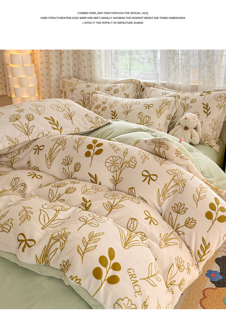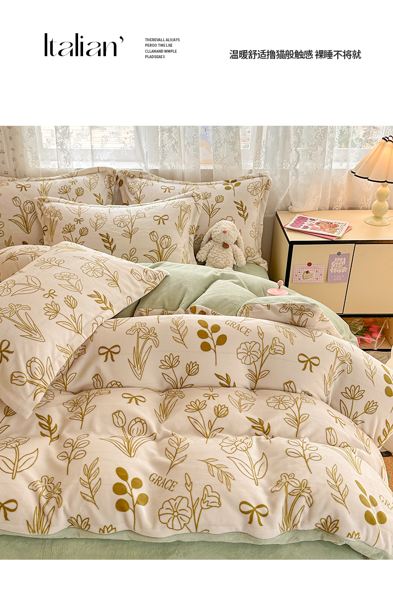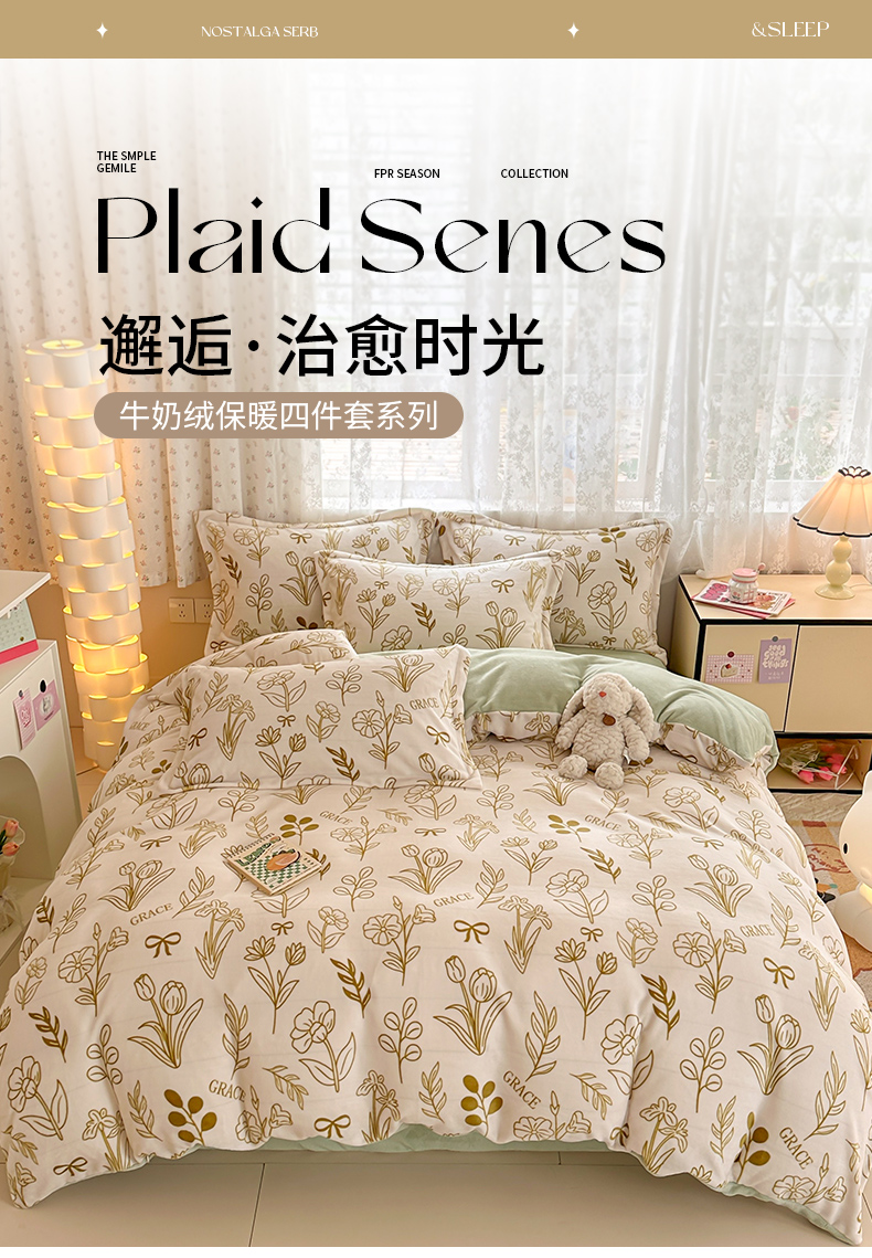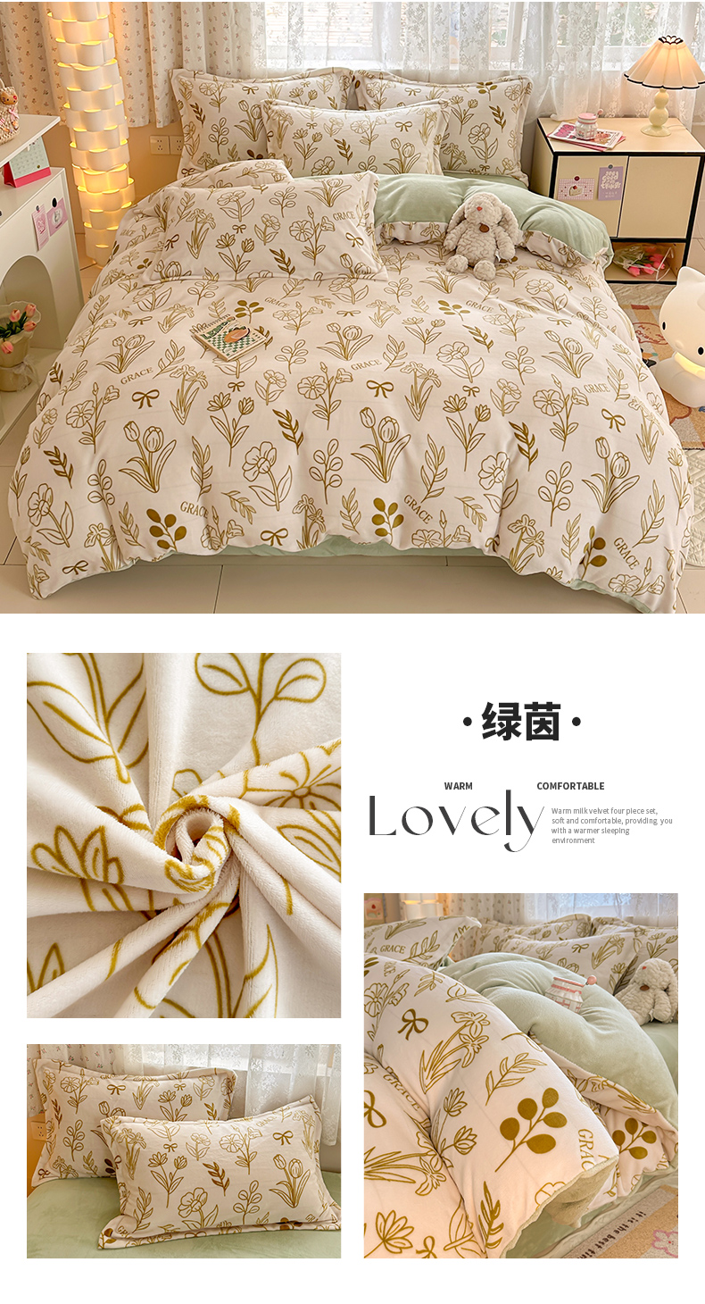 当前位置: 91家纺网 > 商品网购 > 床品套件 > 四件套 > 牛奶绒四件套 > 全季家居 2024新款A类小清新印花牛奶绒高克重加厚保暖四件套 绿茵