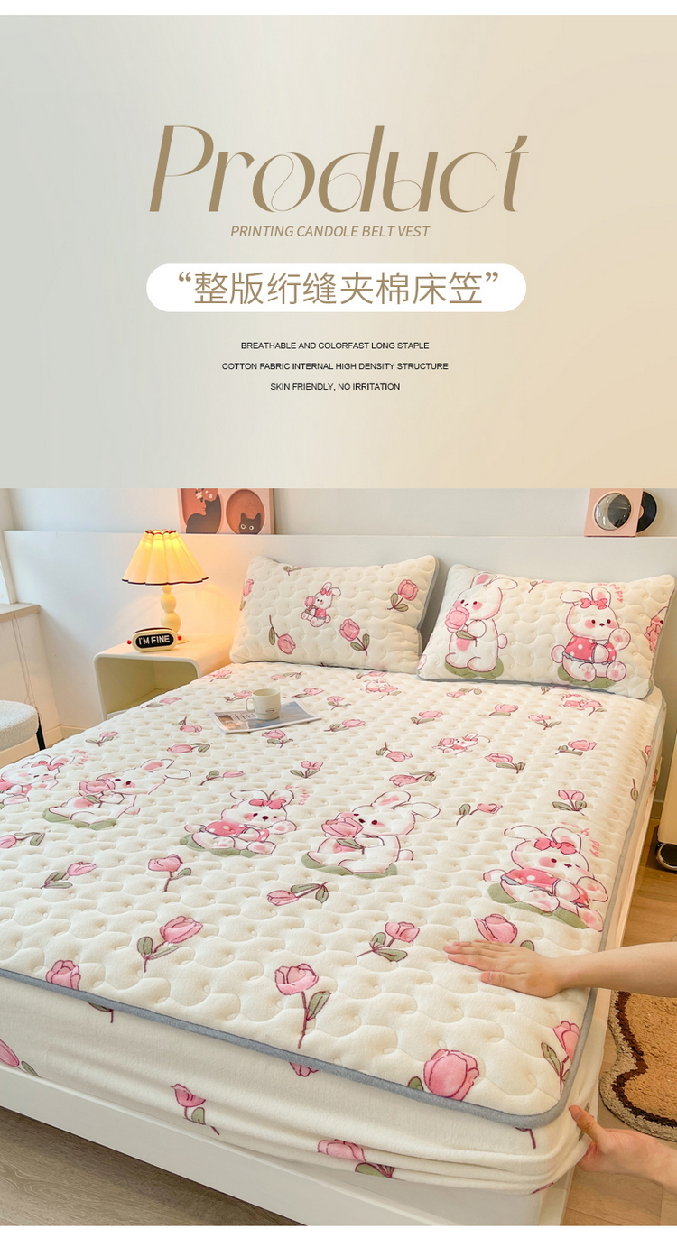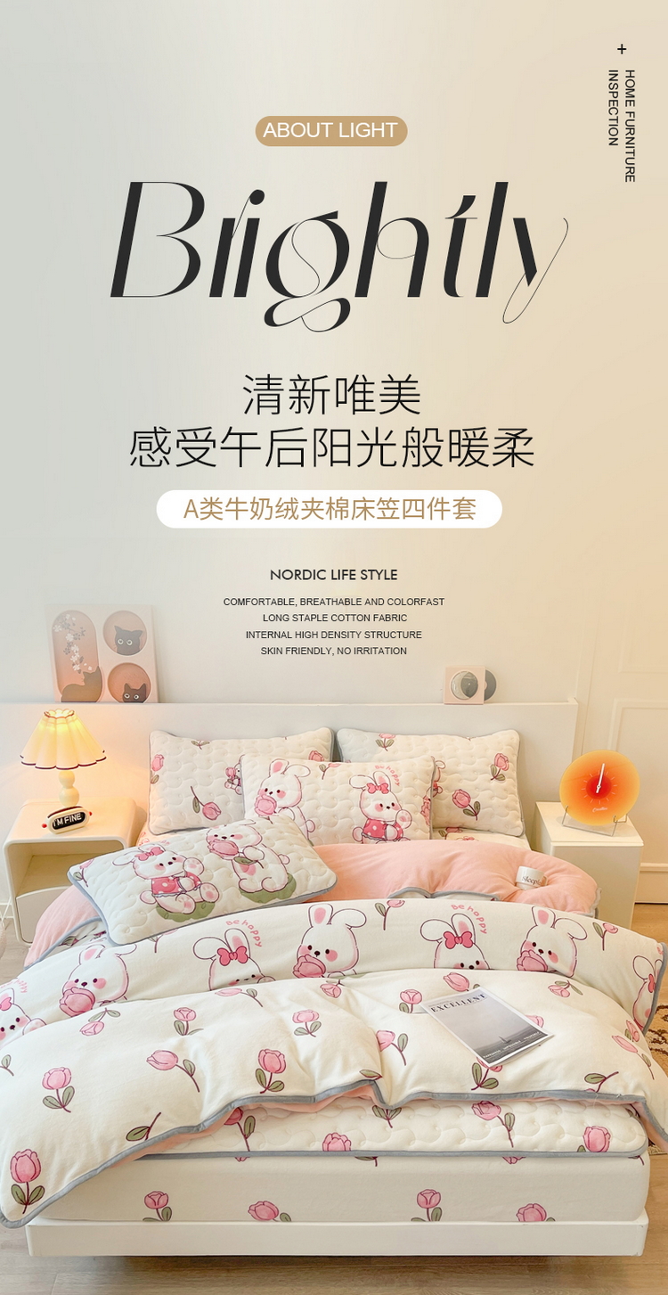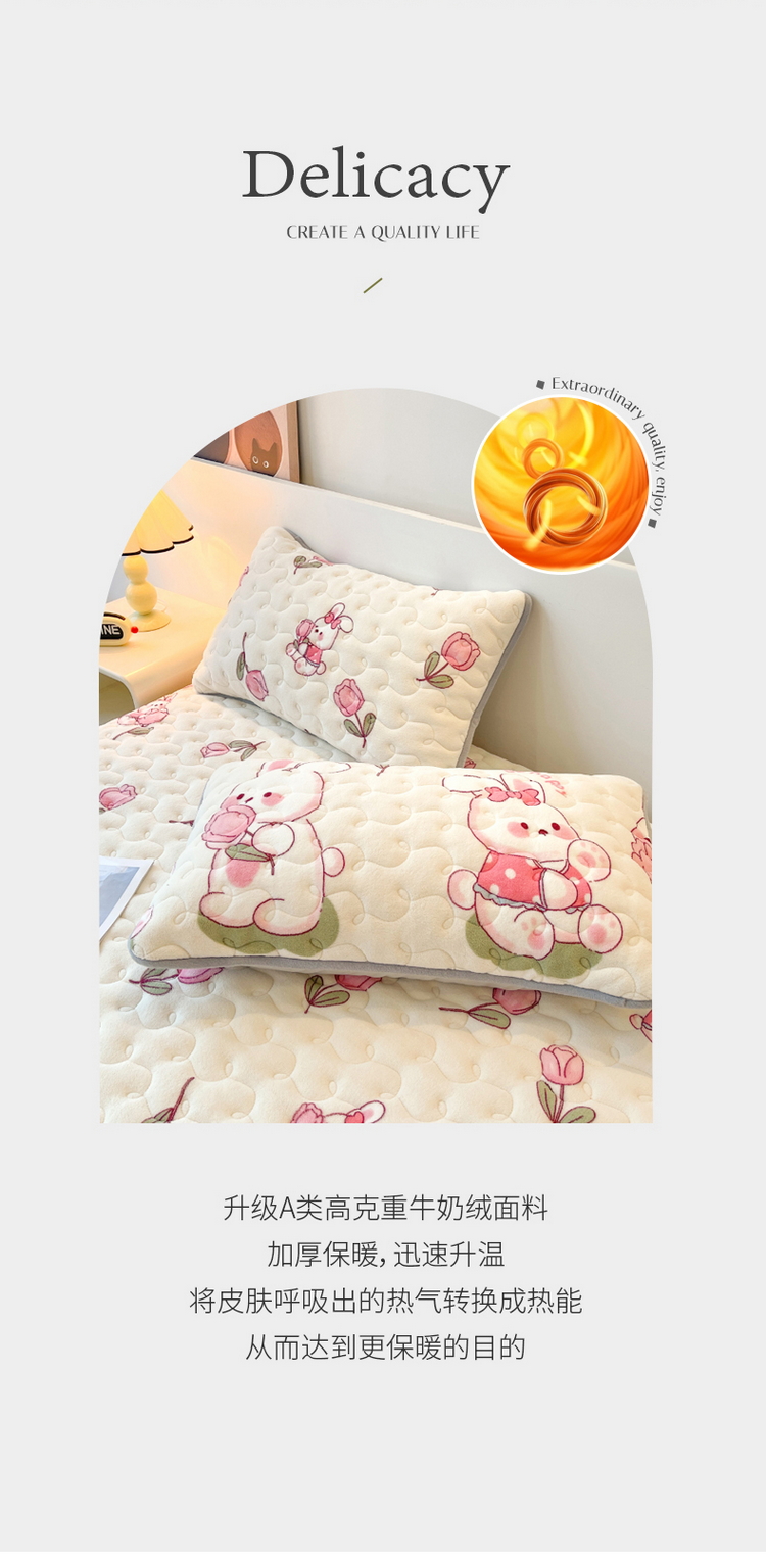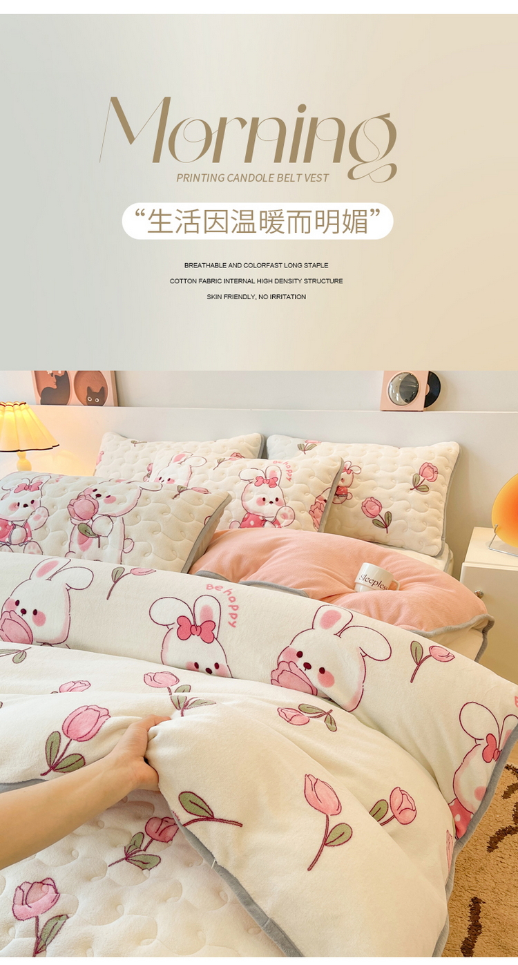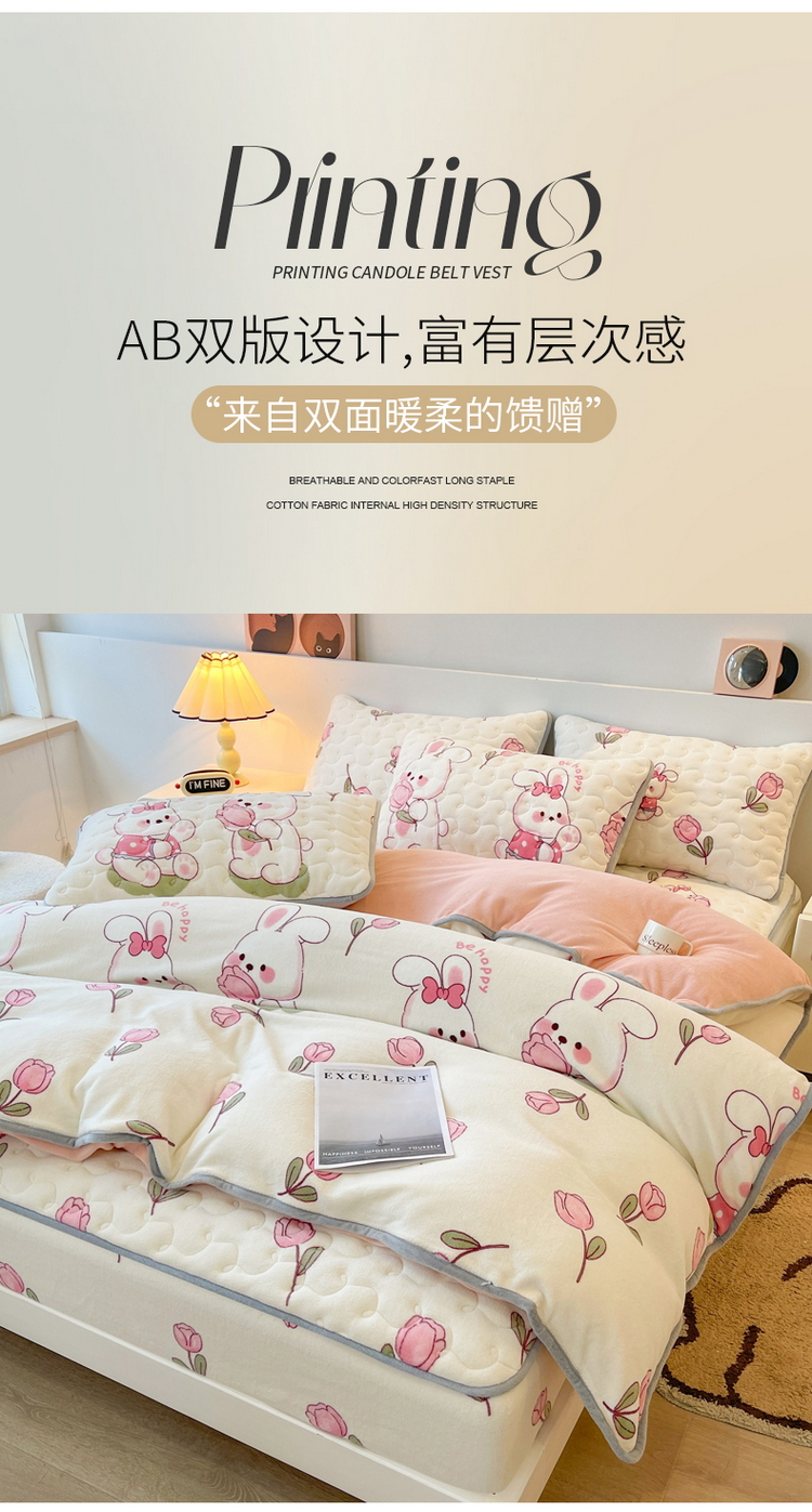 2024秋冬A类牛奶绒加厚夹棉床笠+牛奶绒被套四件套浪漫小兔