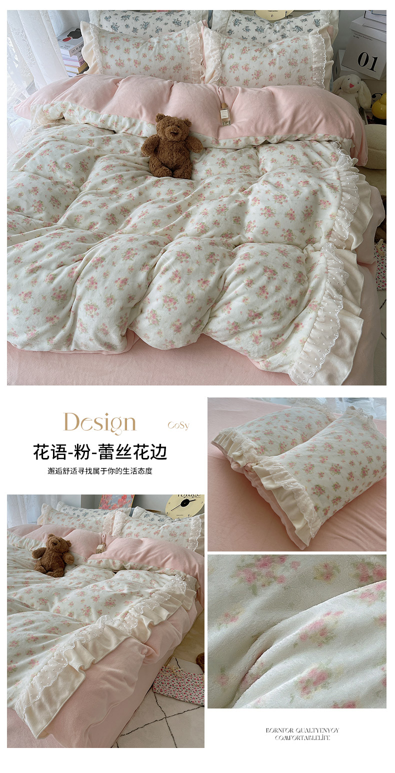 当前位置: 91家纺网 > 商品网购 > 床品套件 > 四件套 > 牛奶绒四件套 > 山茶家纺 2024新款碎花花边牛奶绒四件套 花语-粉-蕾丝花边