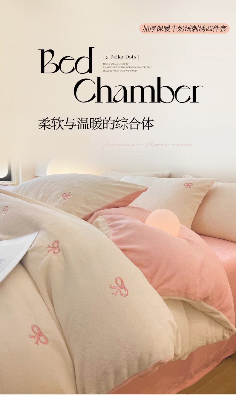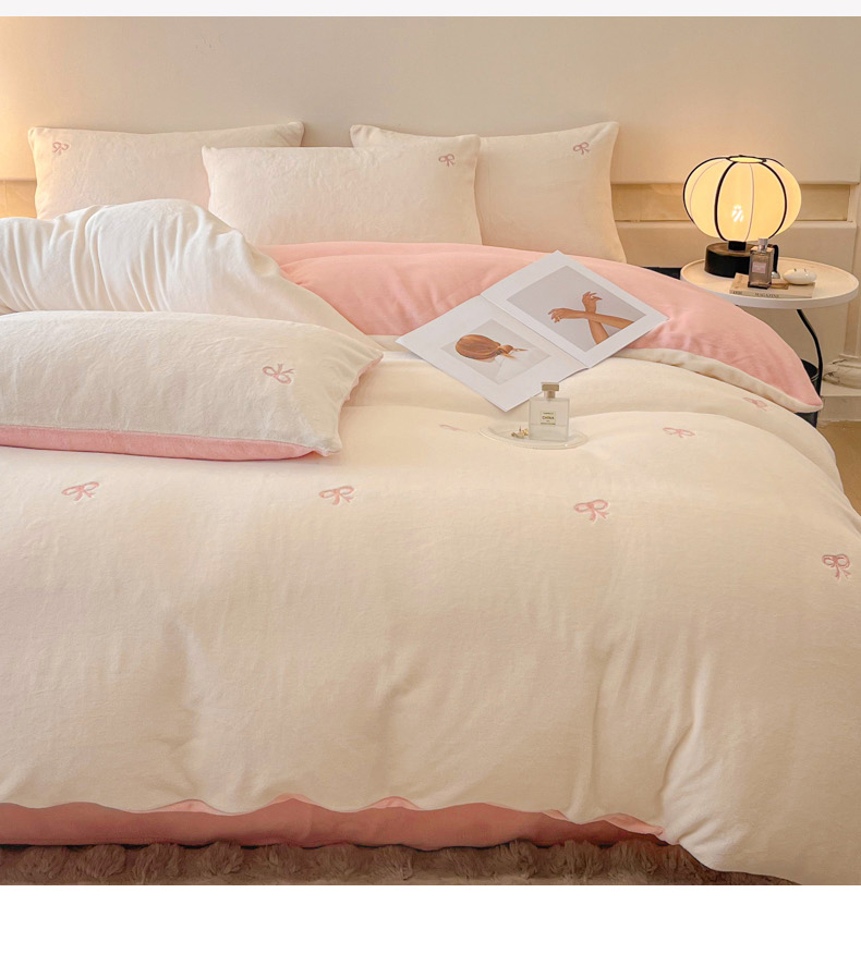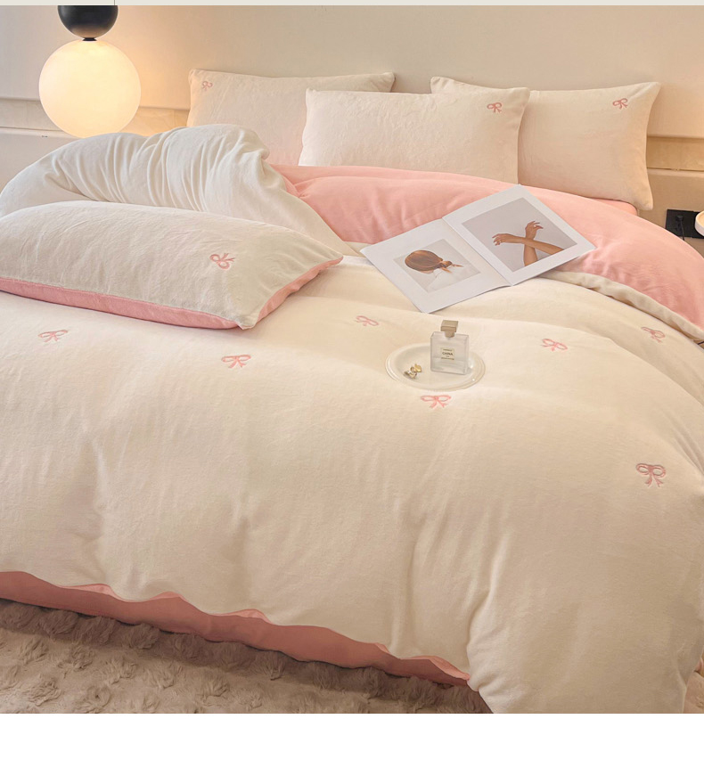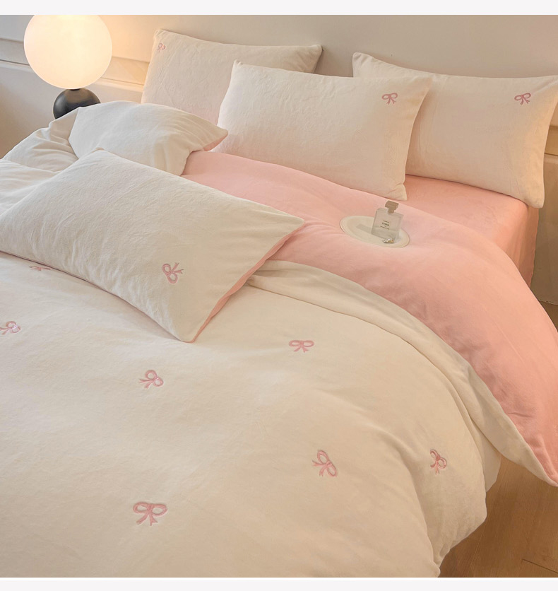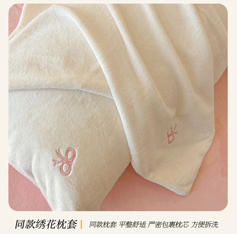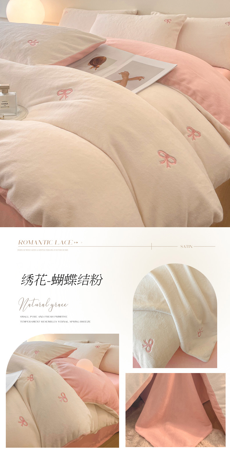 当前位置: 91家纺网 > 商品网购 > 床品套件 > 四件套 > 牛奶绒四件套 > 柒月 2024新款加厚保暖牛奶绒刺绣四件套 蝴蝶结粉