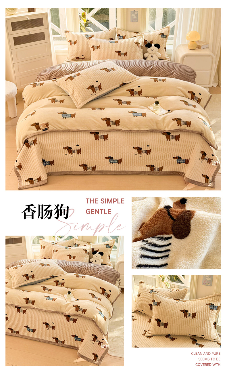 梦可莱家居 2024新款牛奶豆豆绒印花床盖四件套 香肠狗