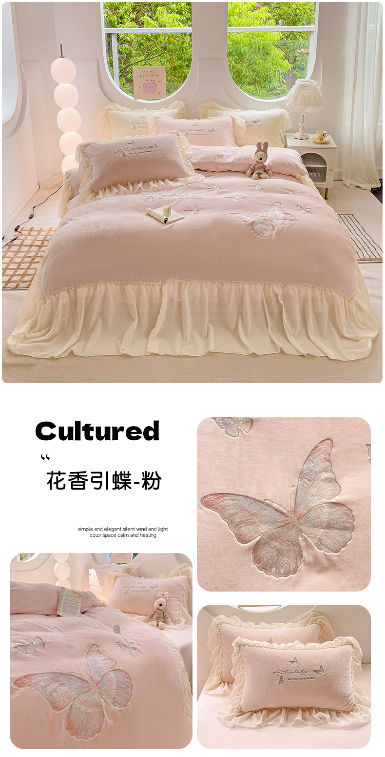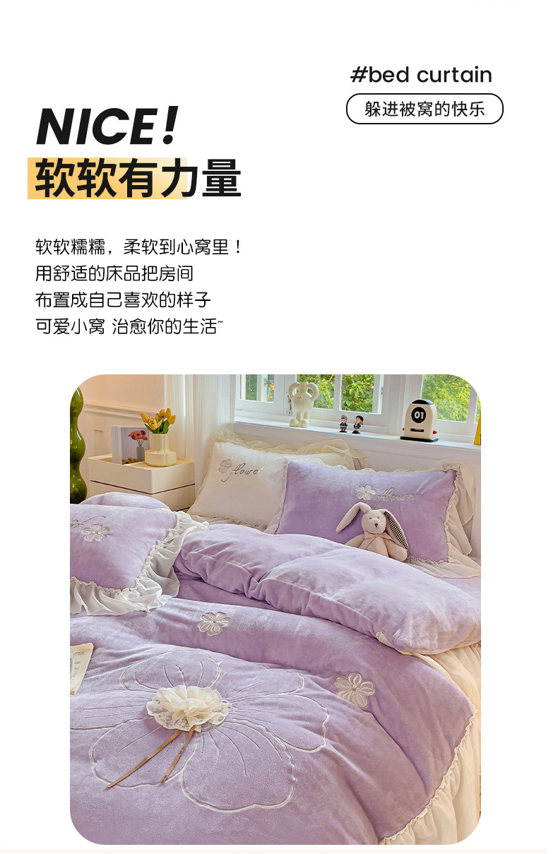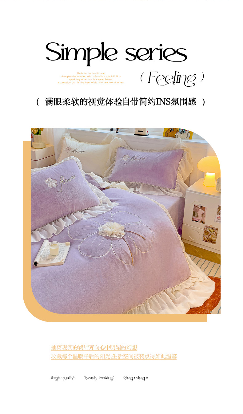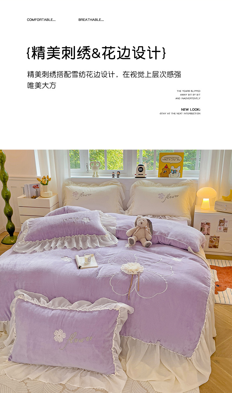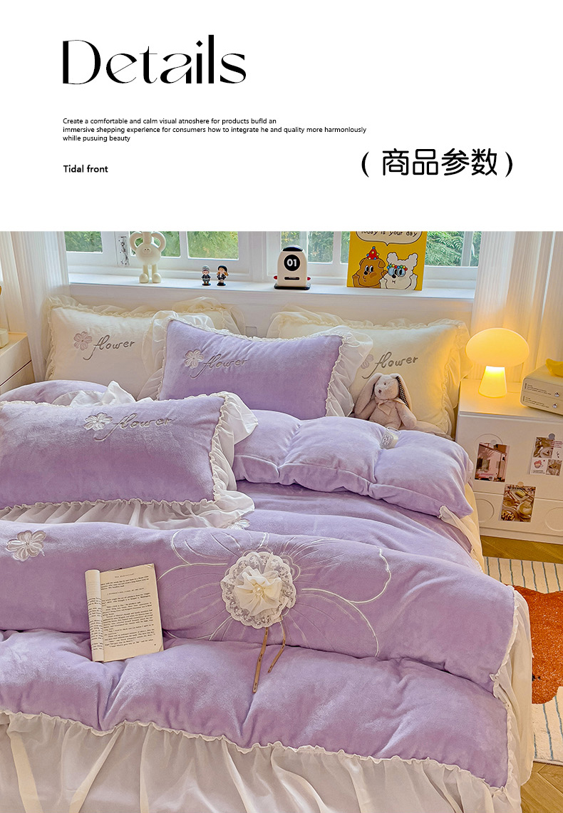 商品名称:娜娜 2024新款法式花边牛奶绒刺绣四件套-花蕊-花香引蝶系列 花蕊-紫