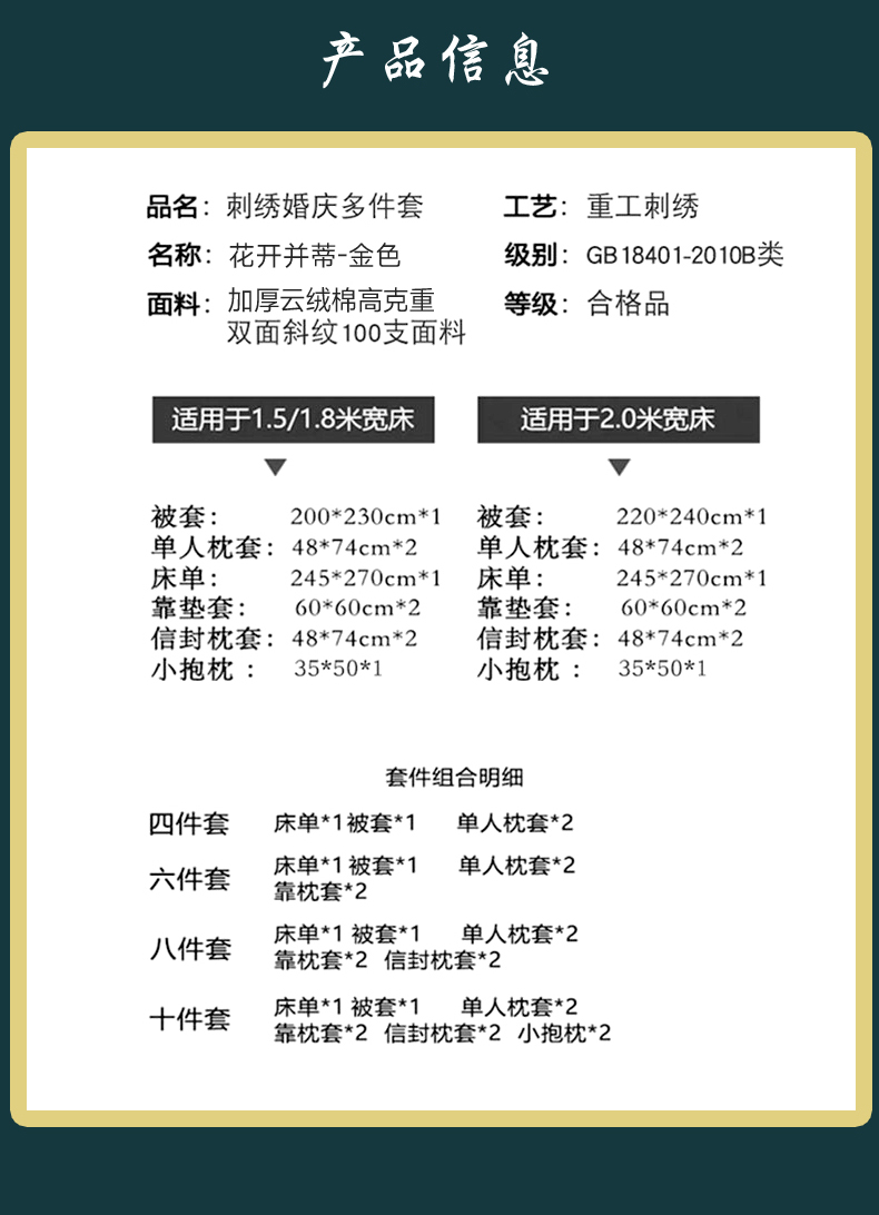 商品名称:博婷 2024新款刺绣婚庆多件套 花开并蒂-金色