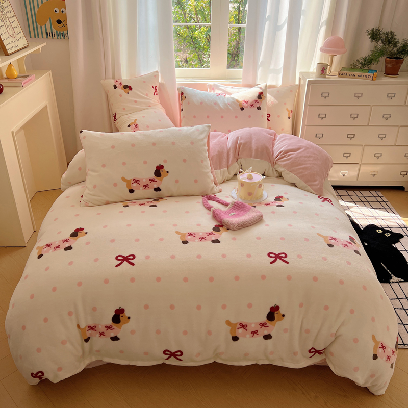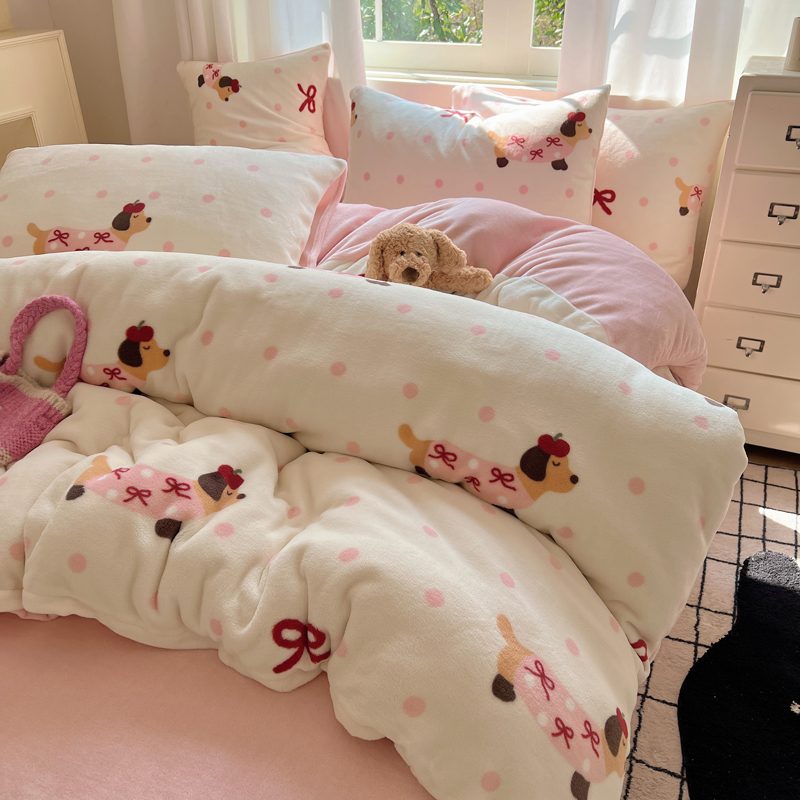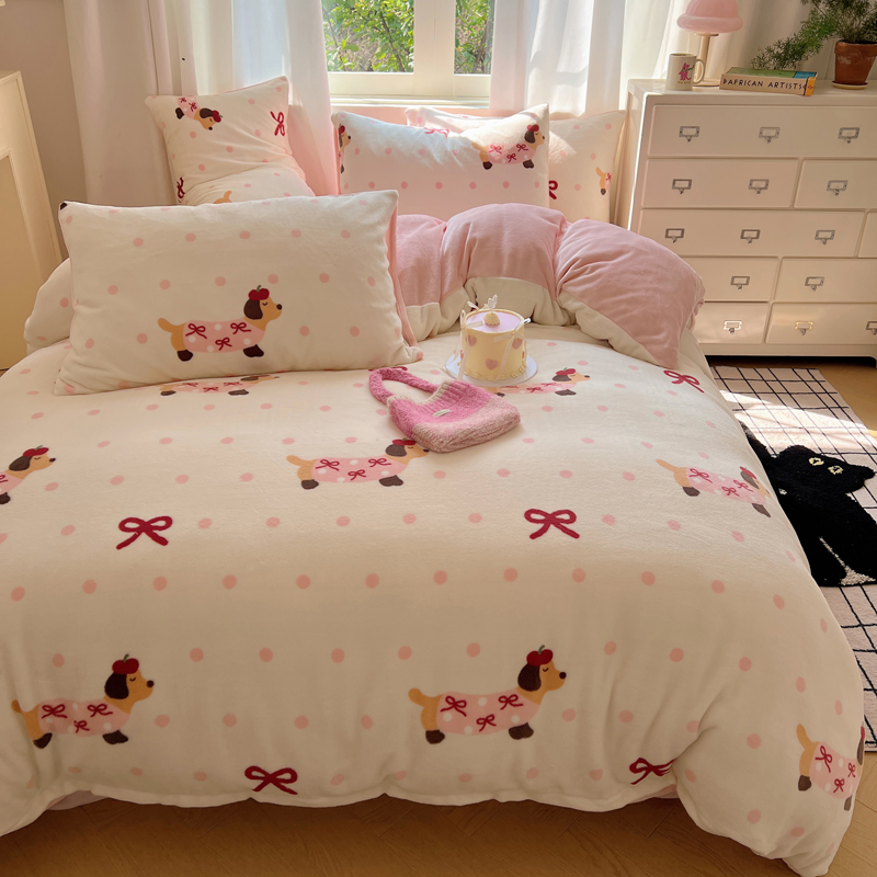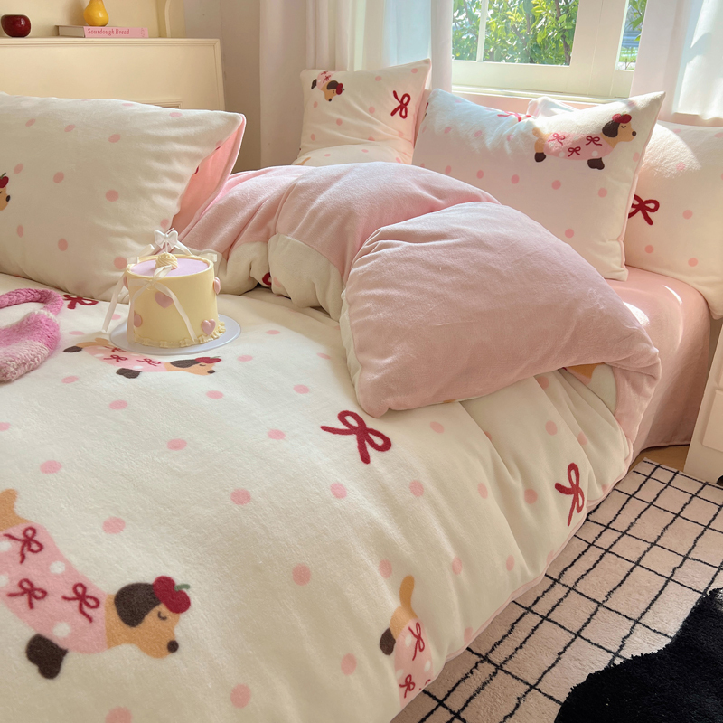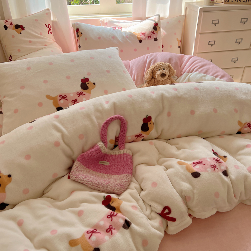 顾里家纺 2024新款加厚牛奶绒ins奶油治愈系少女心保暖四件套系列-风格二 波点腊肠狗