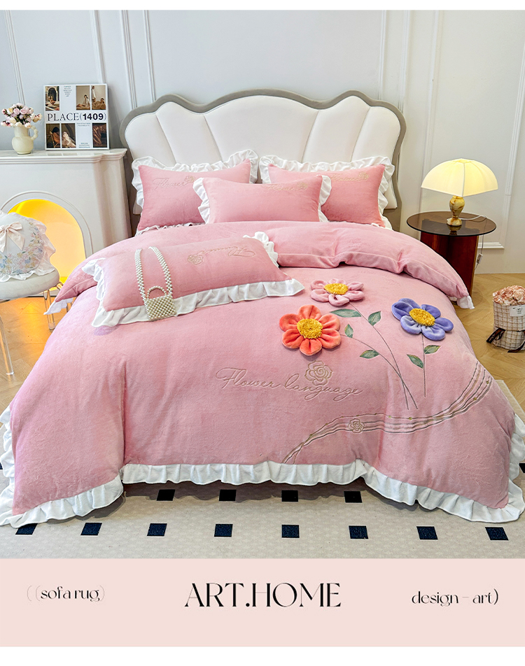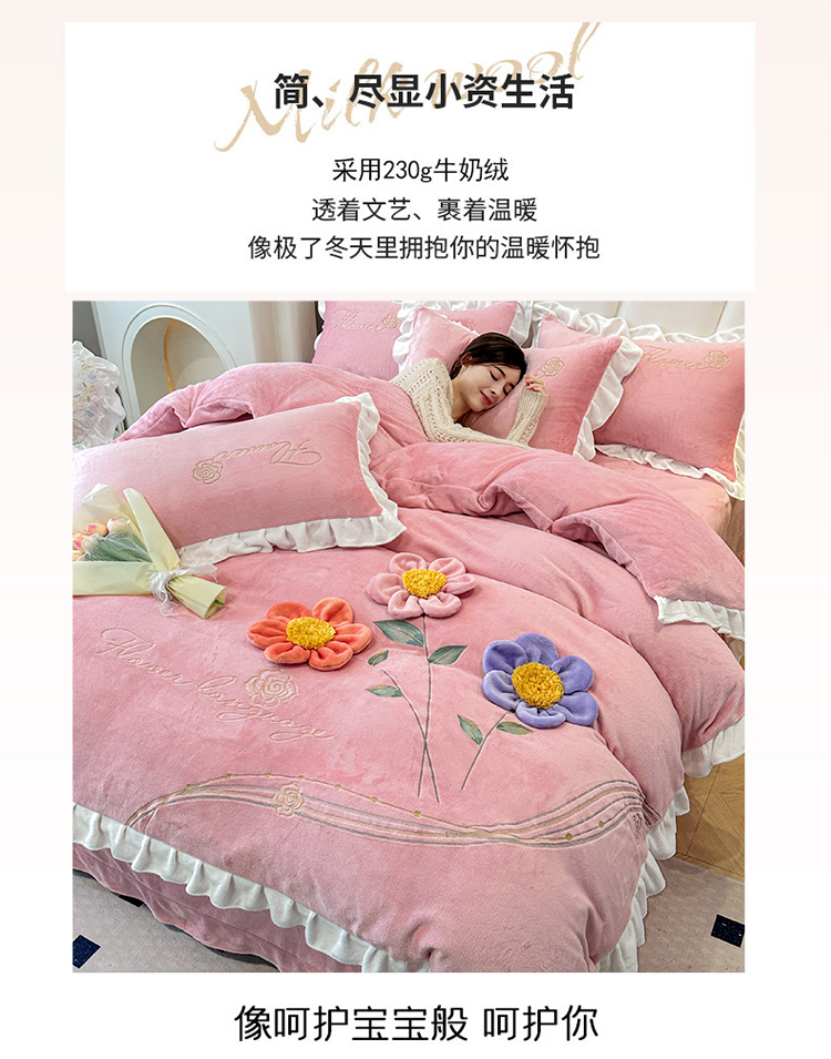 9斤高端韩版少女心法式公主风贴布绣花牛奶绒四件套小清新绒兔毛绒法莱绒床盖被套丝绒兔毛绒法莱绒床盖被套 锦上添花-豆沙红