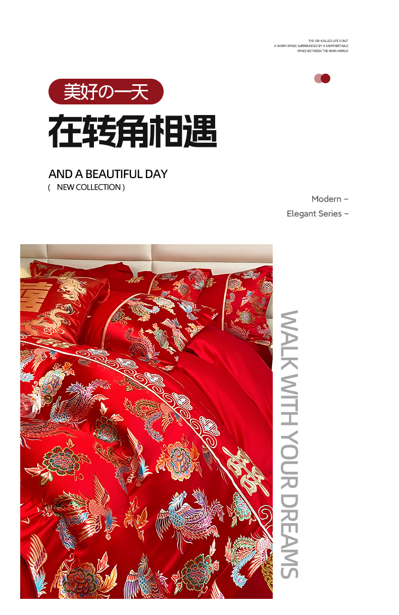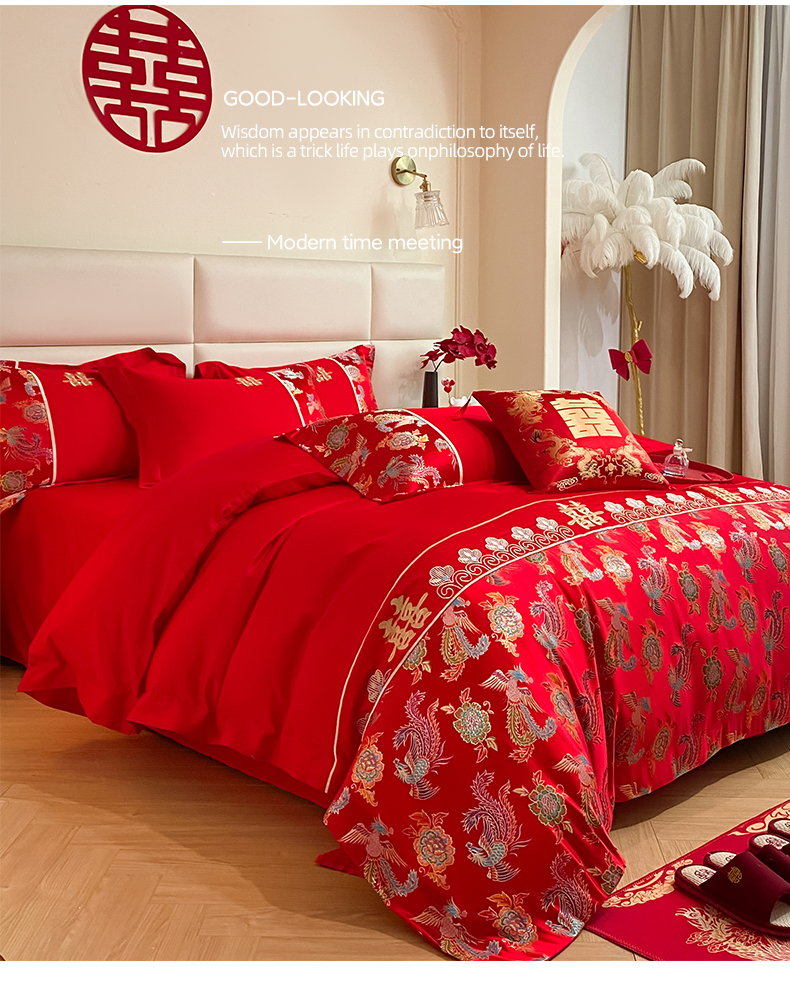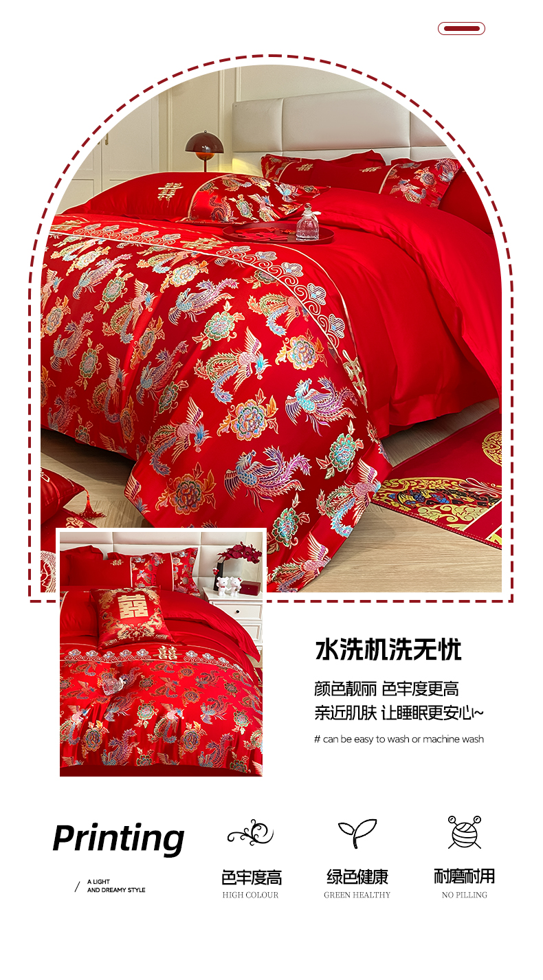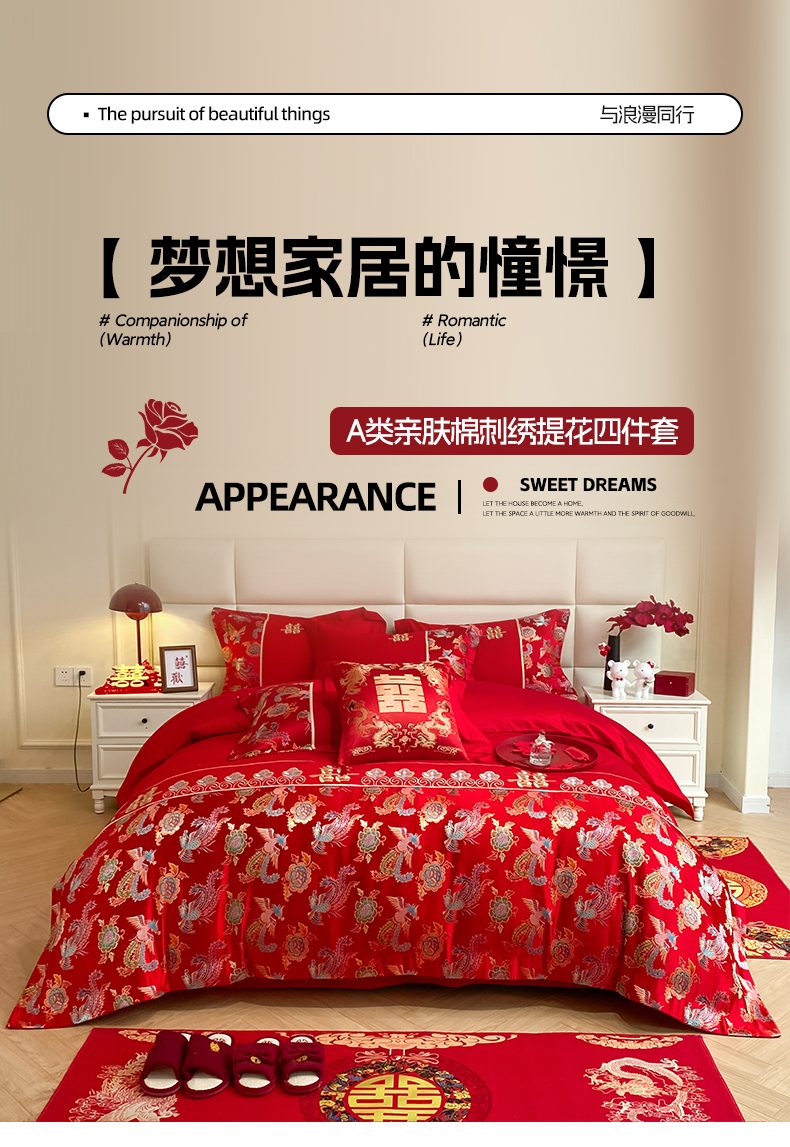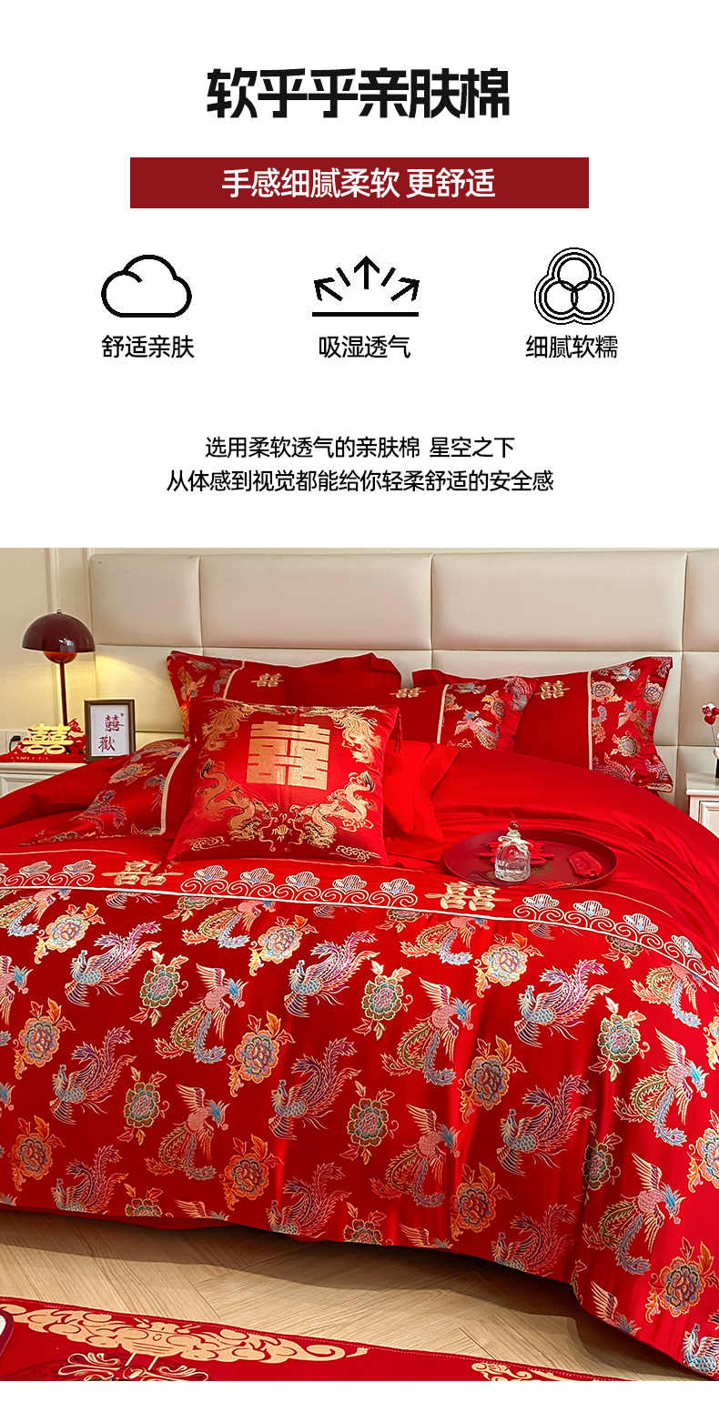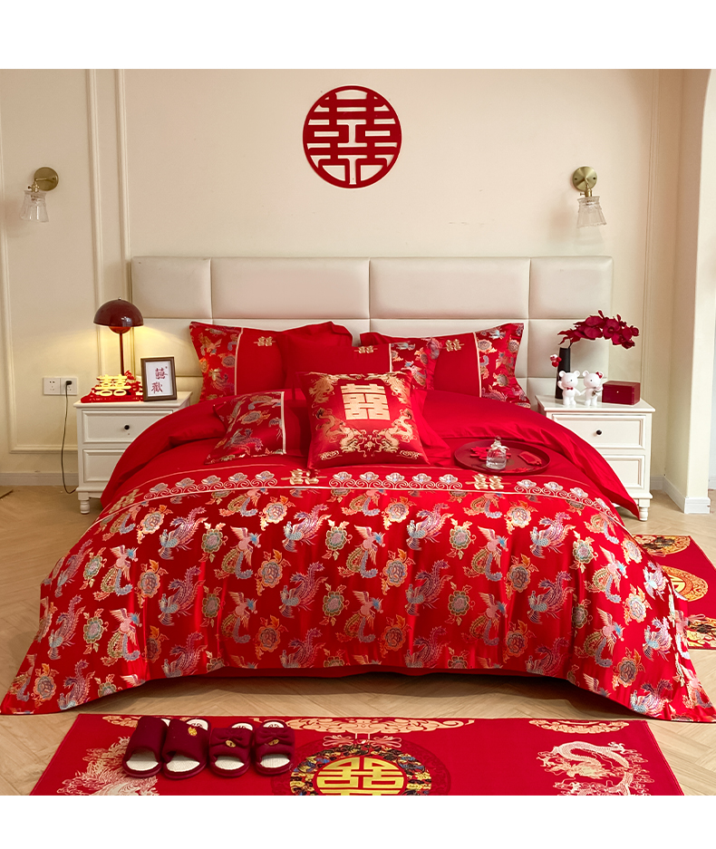 当前位置: 91家纺网 > 商品网购 > 床品套件 > 四件套 > 婚庆四件套 > 帝王家纺 2024新款A类亲肤棉刺绣锦缎提花婚庆四件套 凤舞九天