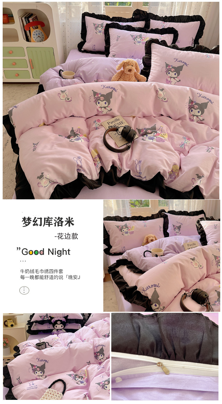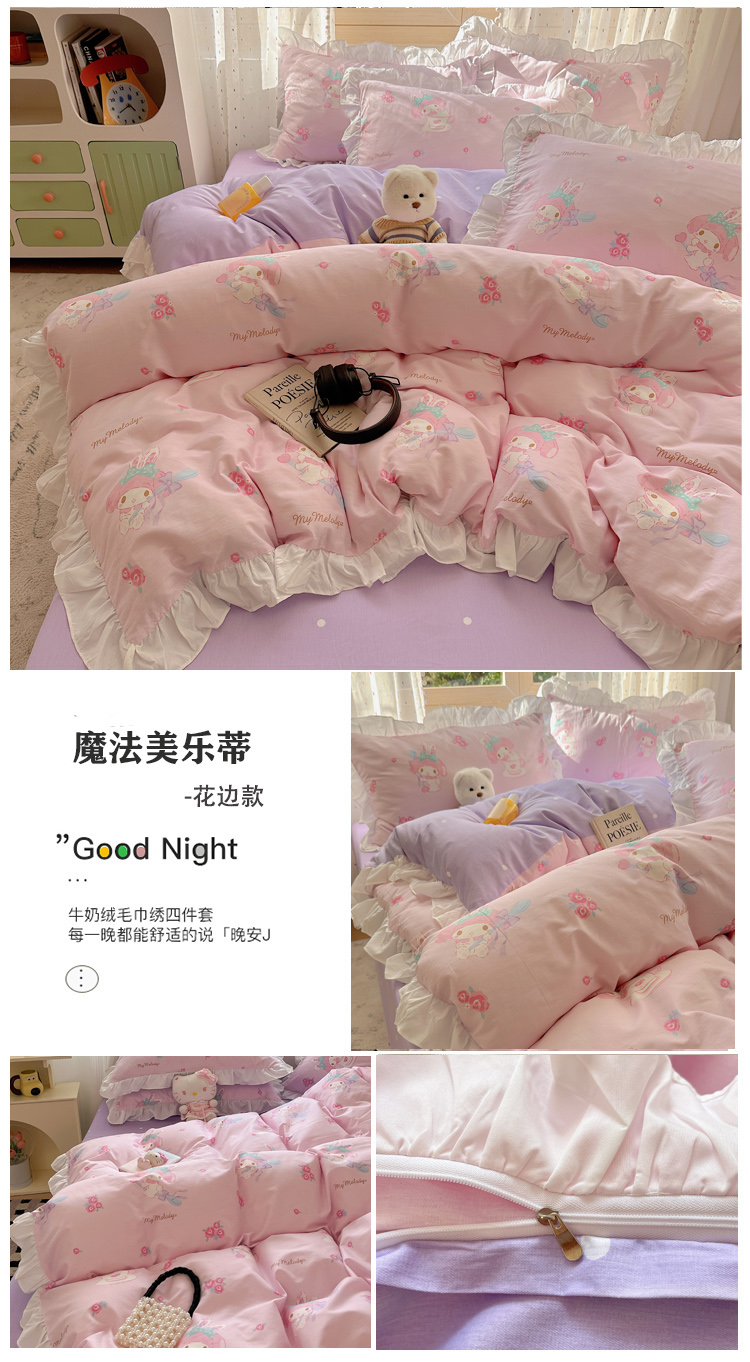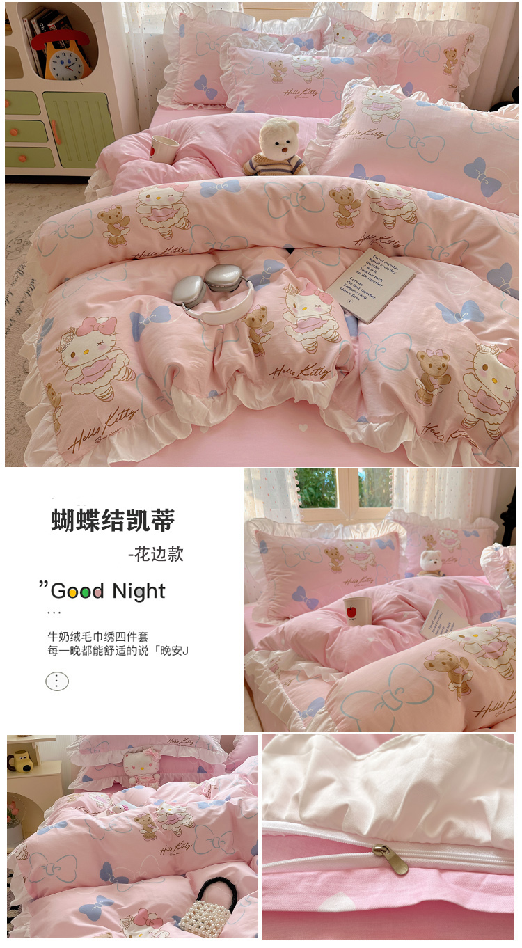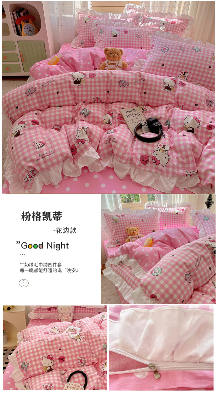 (总)三朵家纺 2024新款牛奶绒绣花四件套三丽鸥系列,草莓公主KT,梦幻旅行,逃学帕恰,淘气宝贝,甜心搬运工,香香公主KT,樱桃美乐蒂