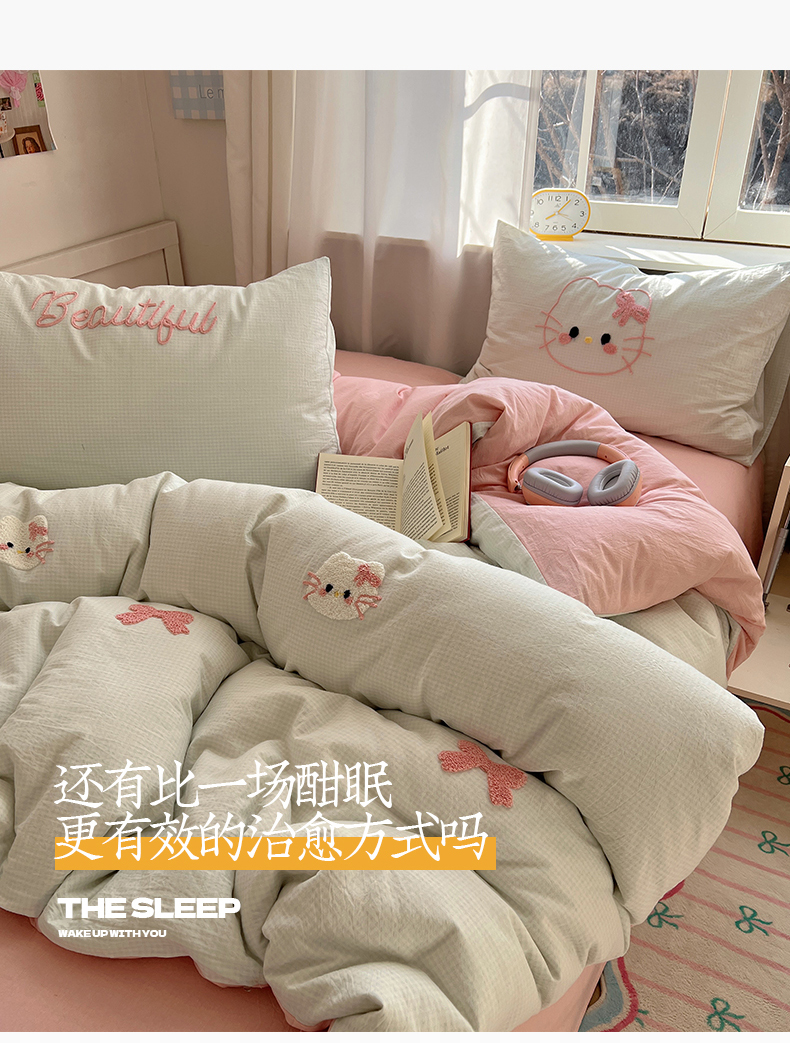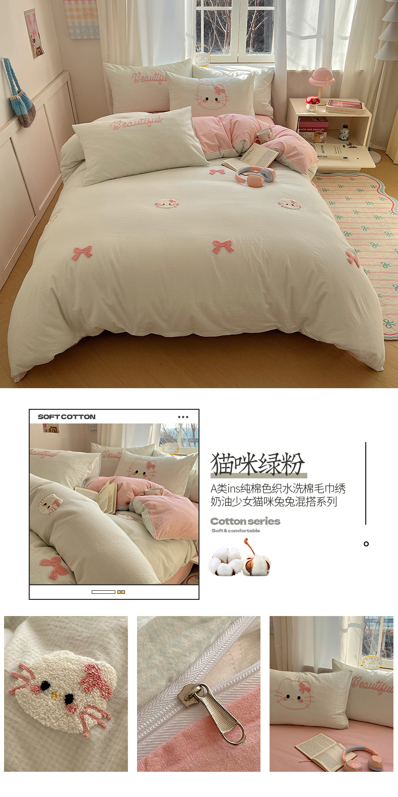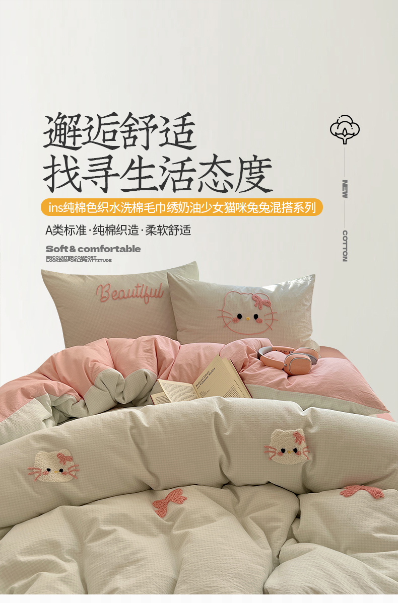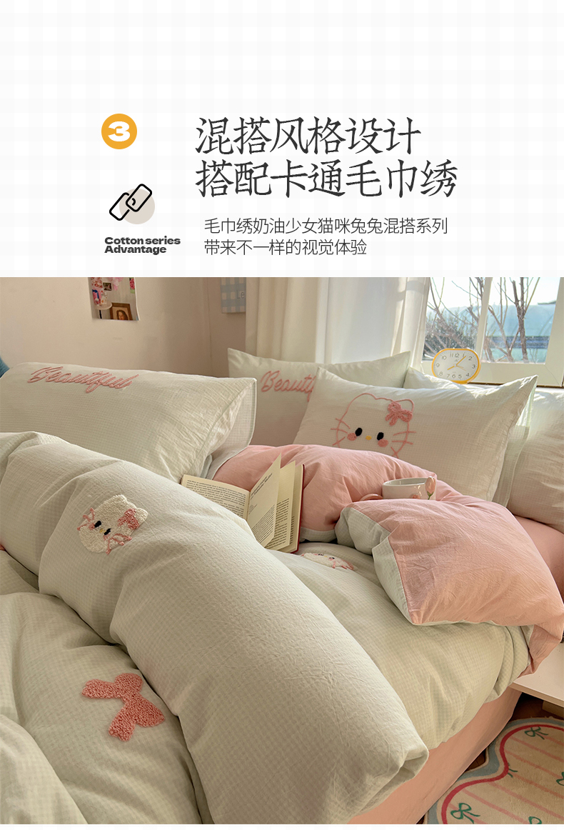 当前位置: 91家纺网 > 商品网购 > 床品套件 > 四件套 > 水洗棉四件套 > 桃子家居 2025新款A类ins纯棉色织水洗棉毛巾绣奶油少女猫咪兔兔混搭系列四件套 色织水洗棉-猫咪绿粉