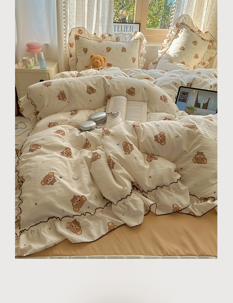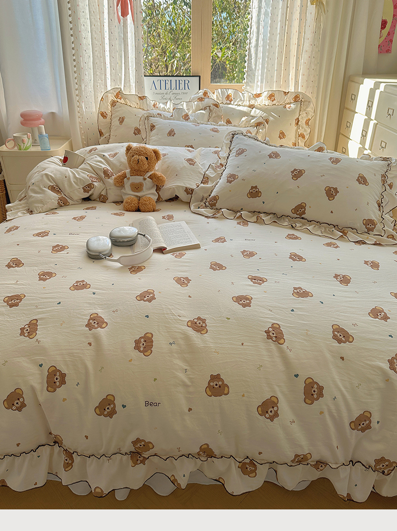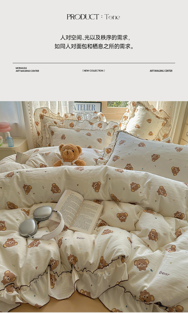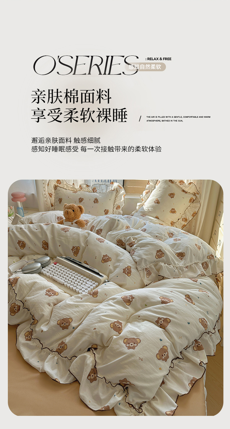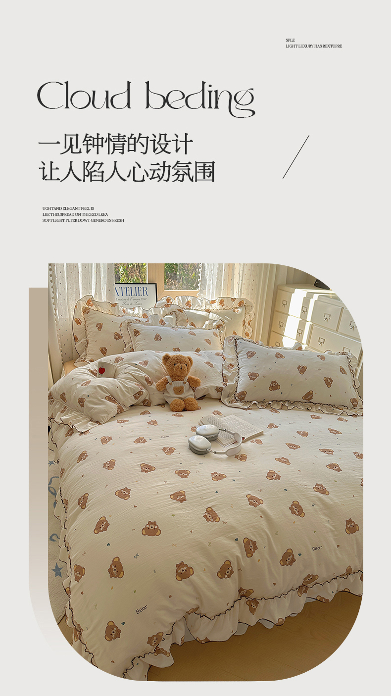 当前位置: 91家纺网 > 商品网购 > 床品套件 > 四件套 > 其它四件套 > 盼季家纺 2025新款公主风花边小清新水洗棉床上四件套床单被套床裙三件套-风格二 bear小熊
