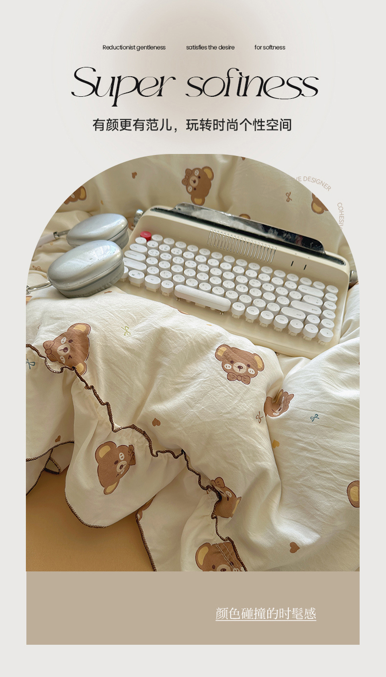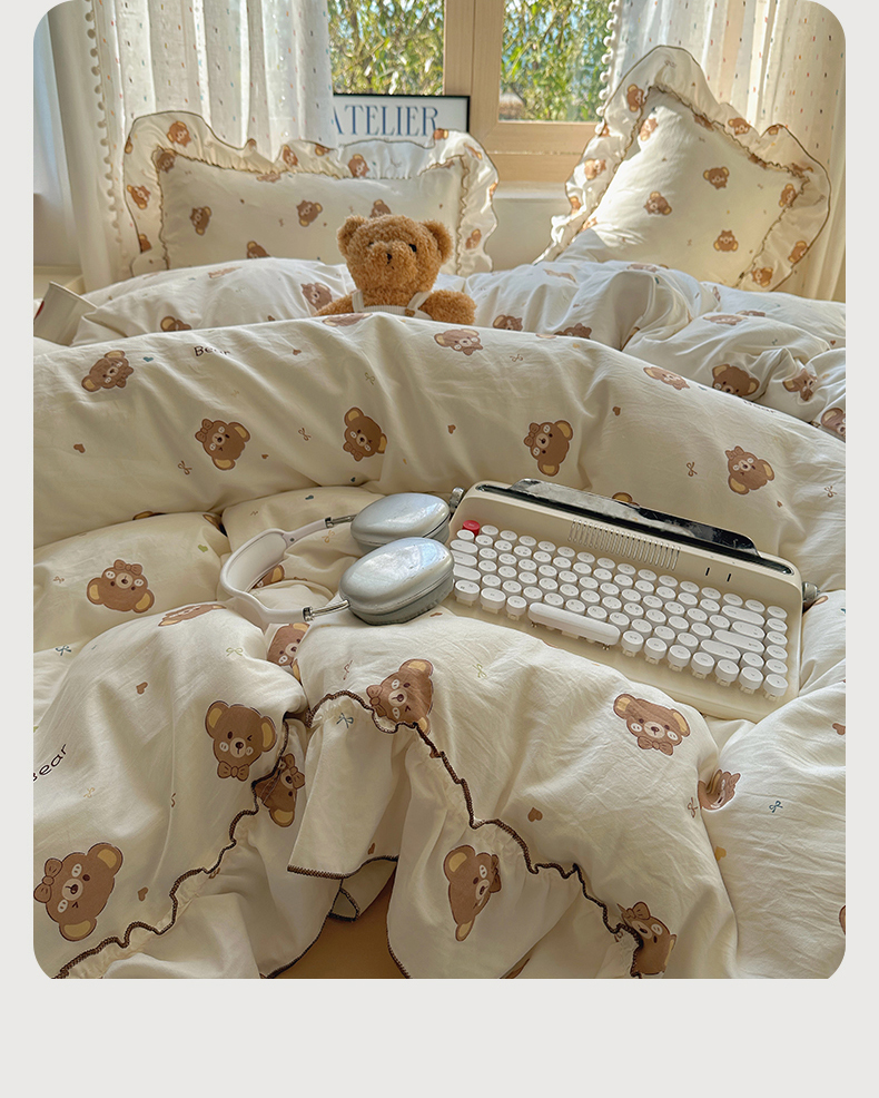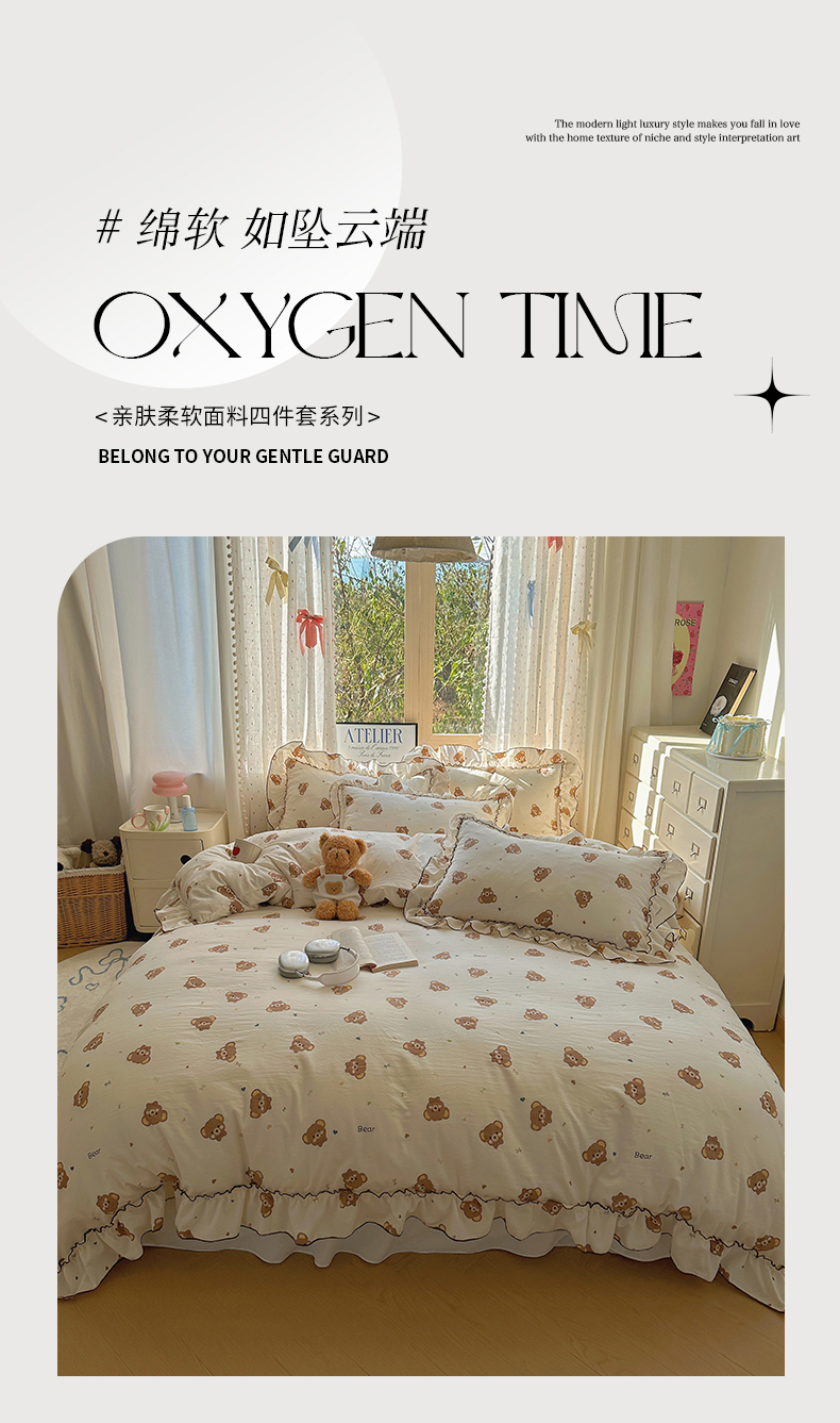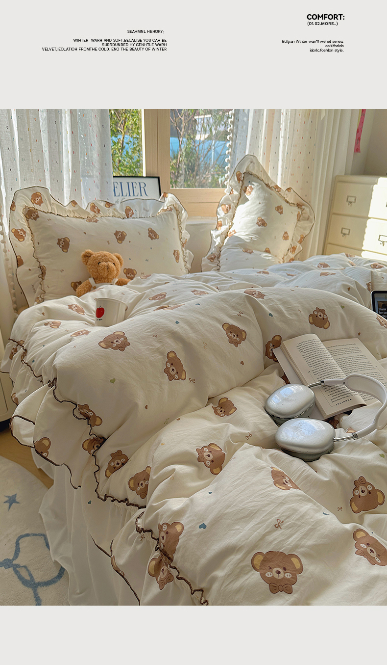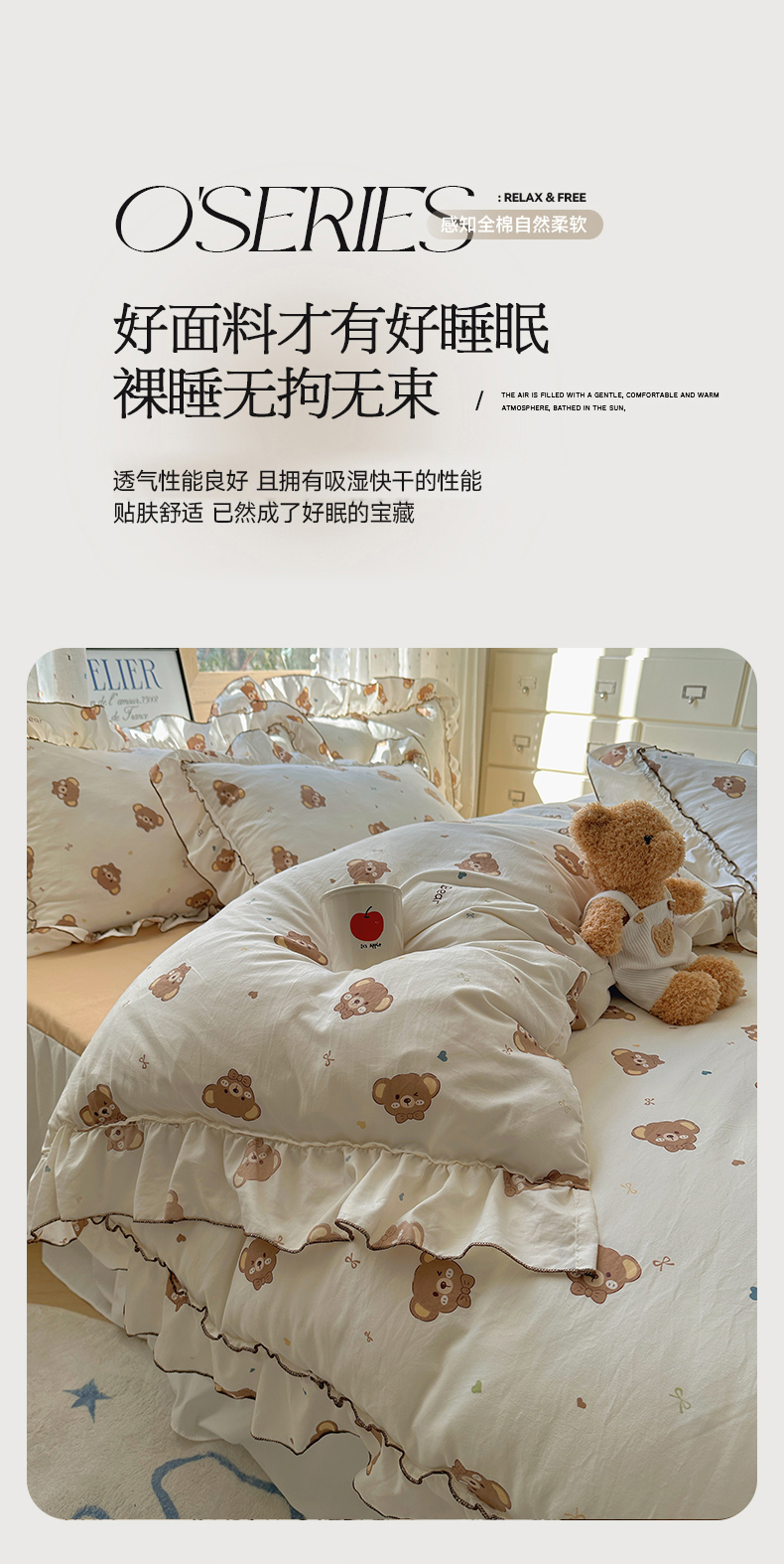 当前位置: 91家纺网 > 商品网购 > 床品套件 > 四件套 > 其它四件套 > 盼季家纺 2025新款公主风花边小清新水洗棉床上四件套床单被套床裙三件套-风格二 bear小熊