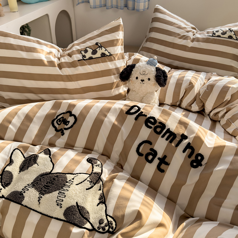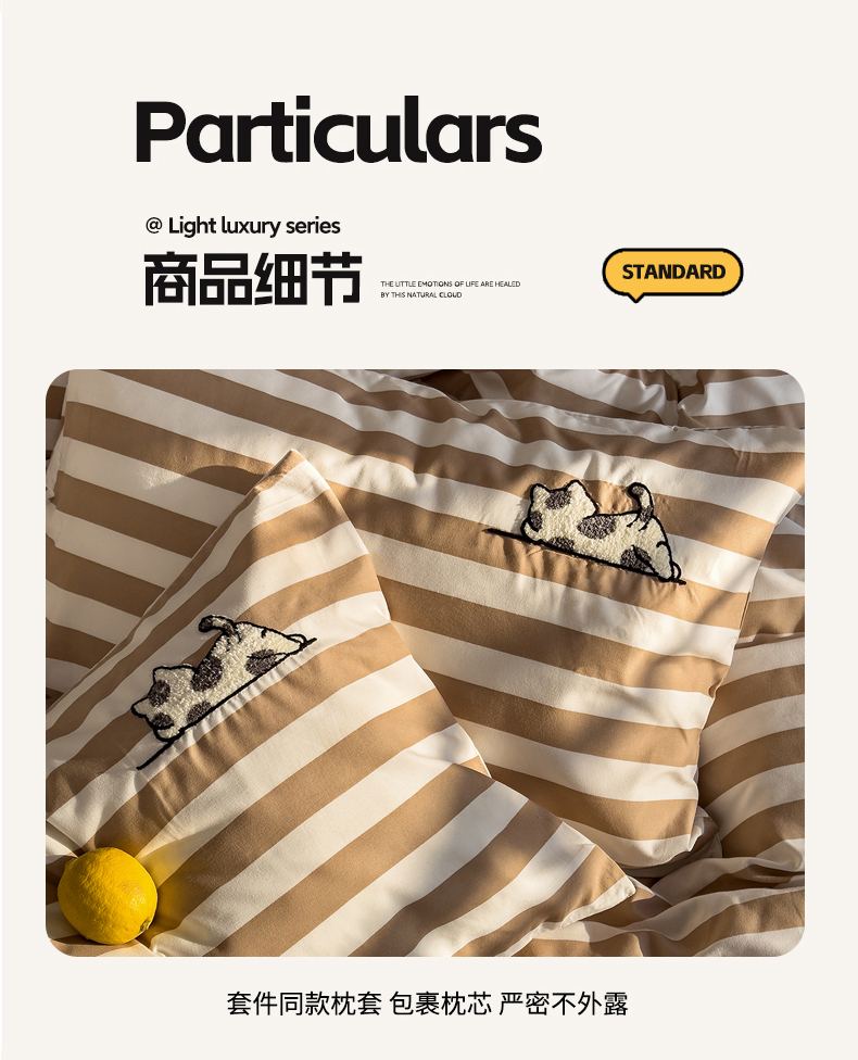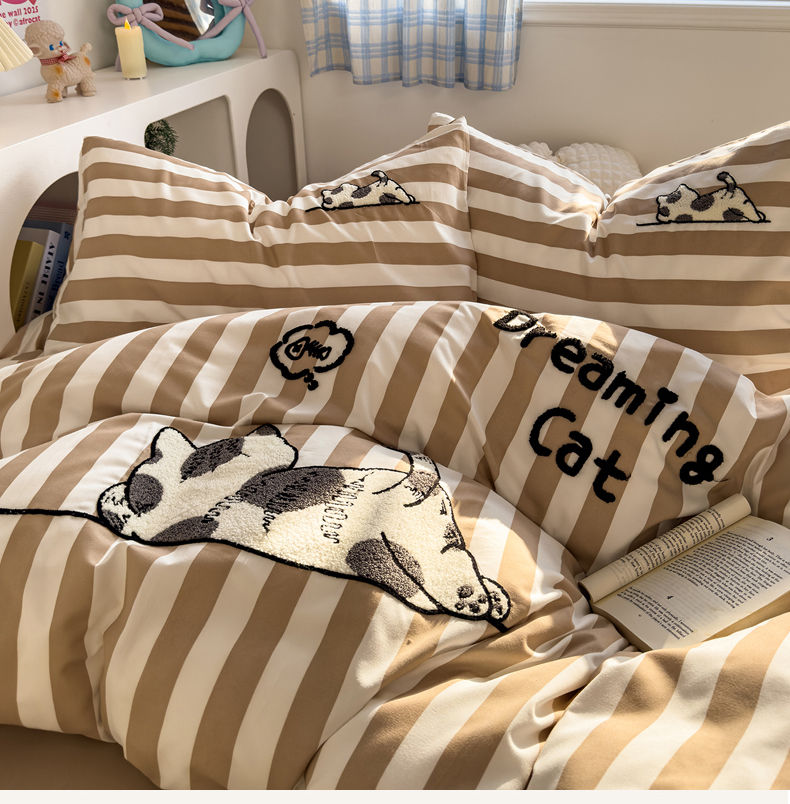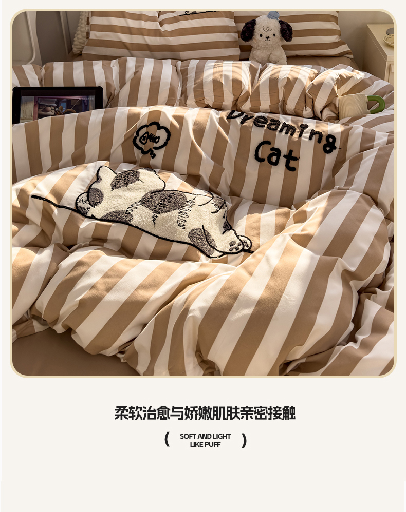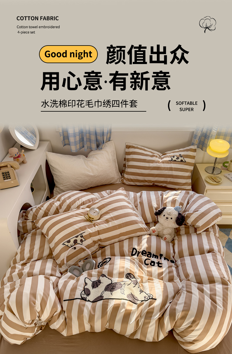 当前位置: 91家纺网 > 商品网购 > 床品套件 > 四件套 > 水洗棉四件套 > 优兰朵 2025新款亲肤卡通水洗棉毛巾绣学生床品四件套 白猫-条纹卡其