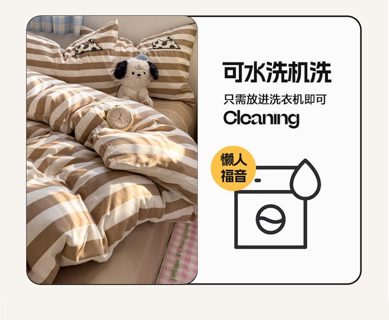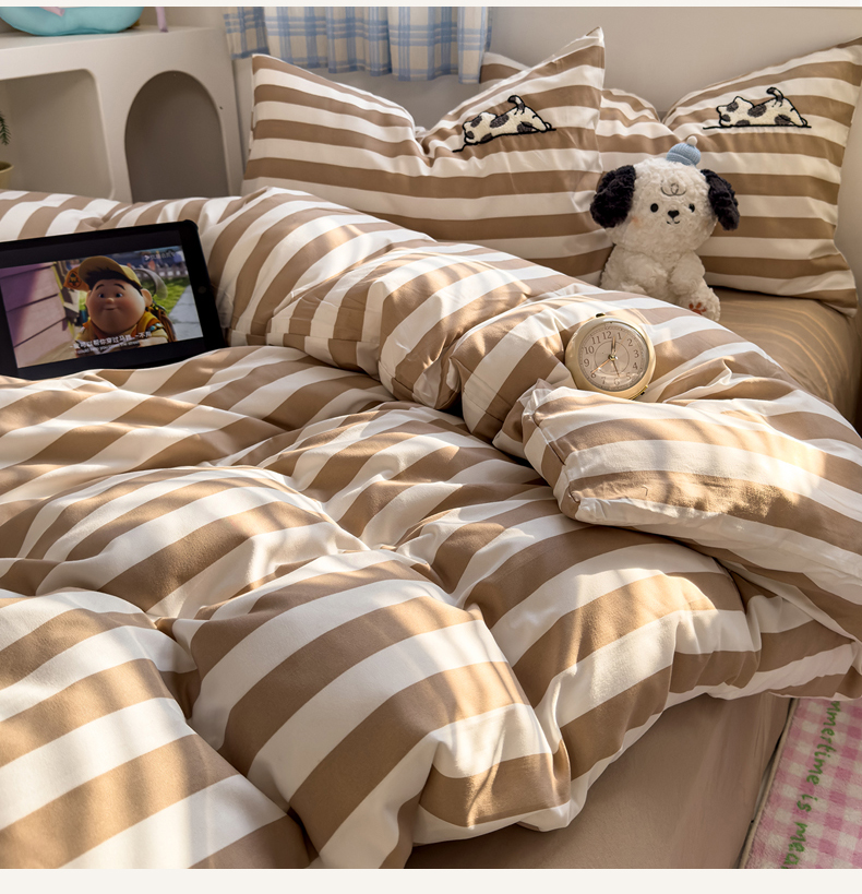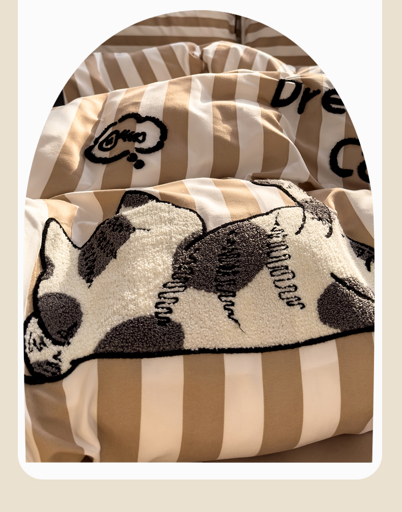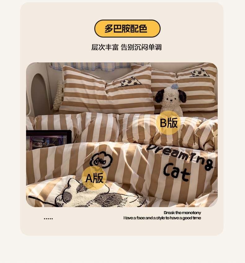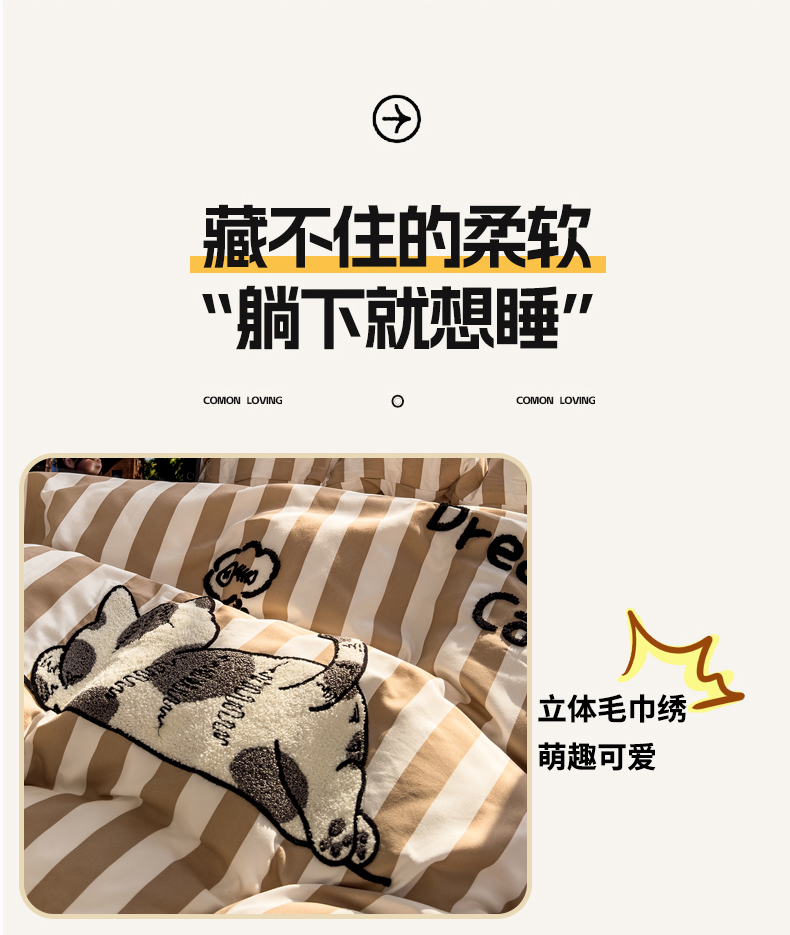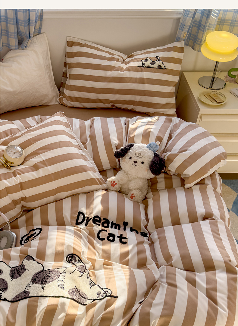当前位置: 91家纺网 > 商品网购 > 床品套件 > 四件套 > 水洗棉四件套 > 优兰朵 2025新款亲肤卡通水洗棉毛巾绣学生床品四件套 白猫-条纹卡其