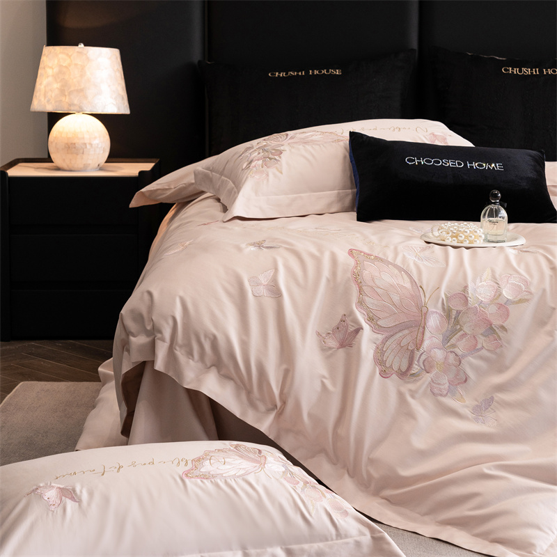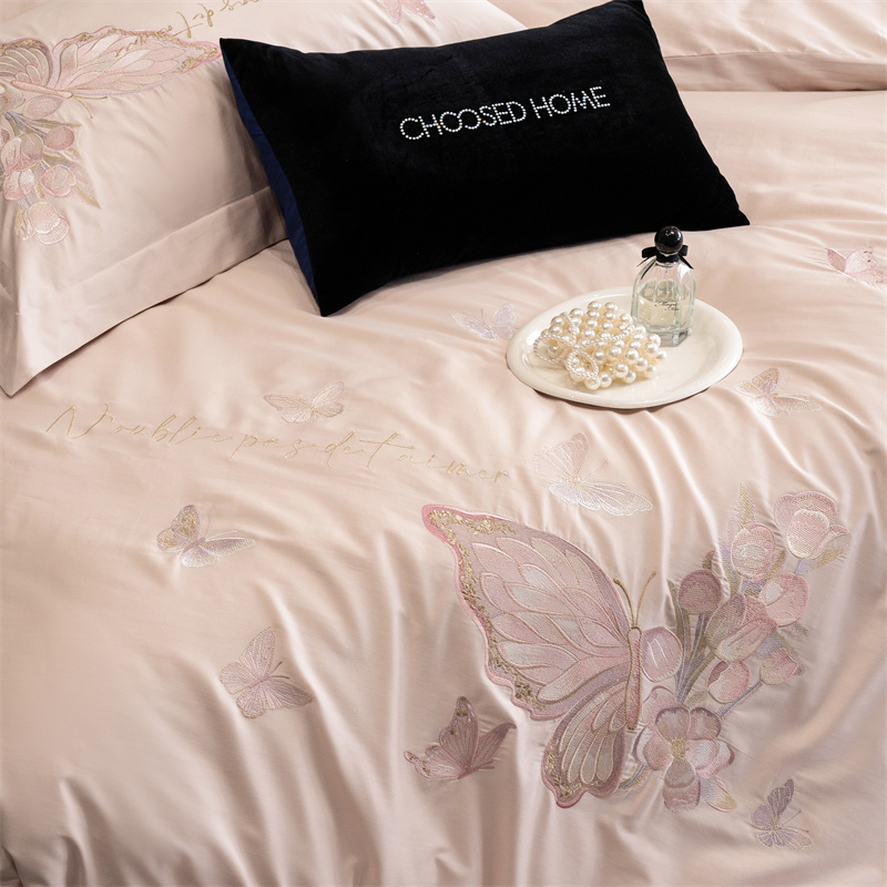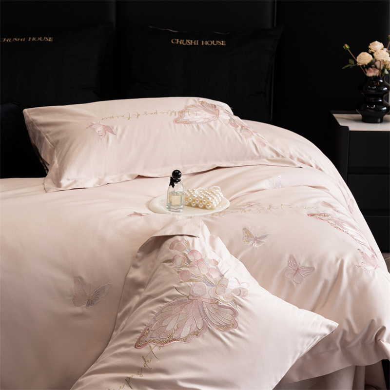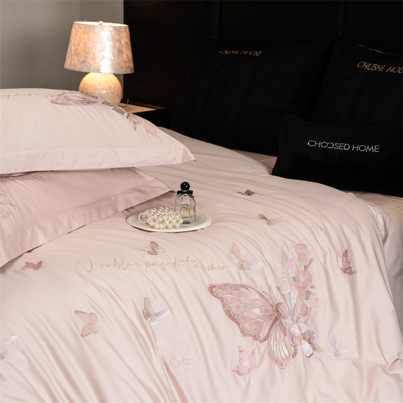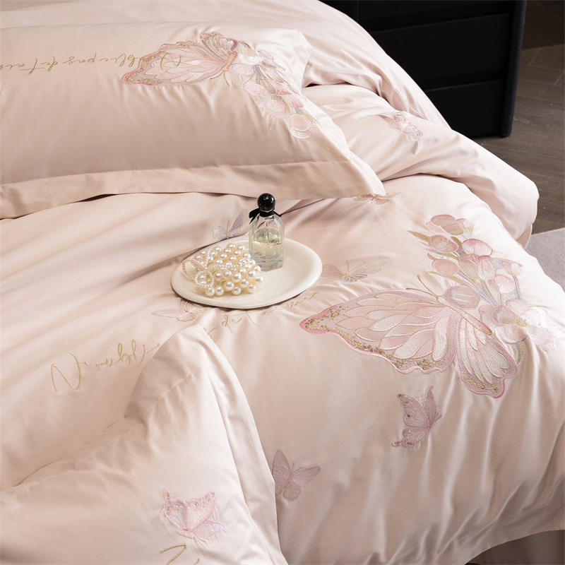 商品名称:初拾 2025新款100s澳棉刺绣四件套-蝶彩霓虹 蝶彩霓虹-雅灰粉