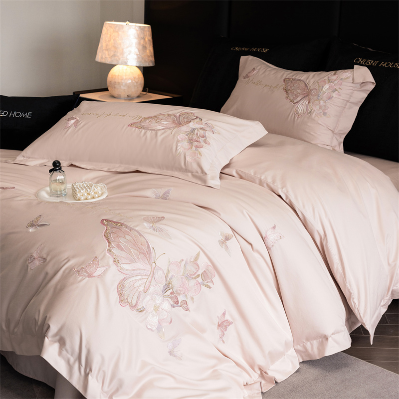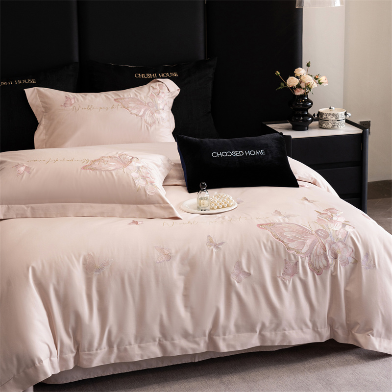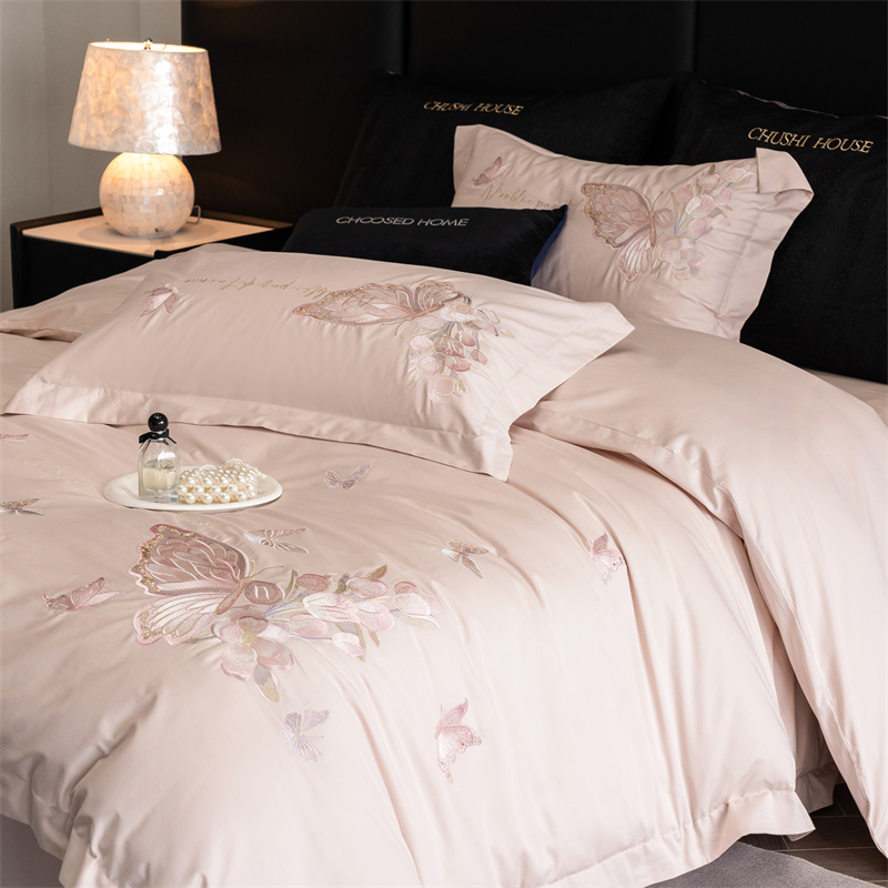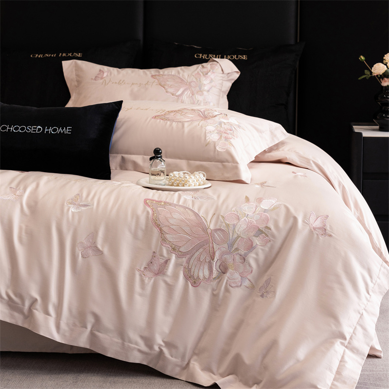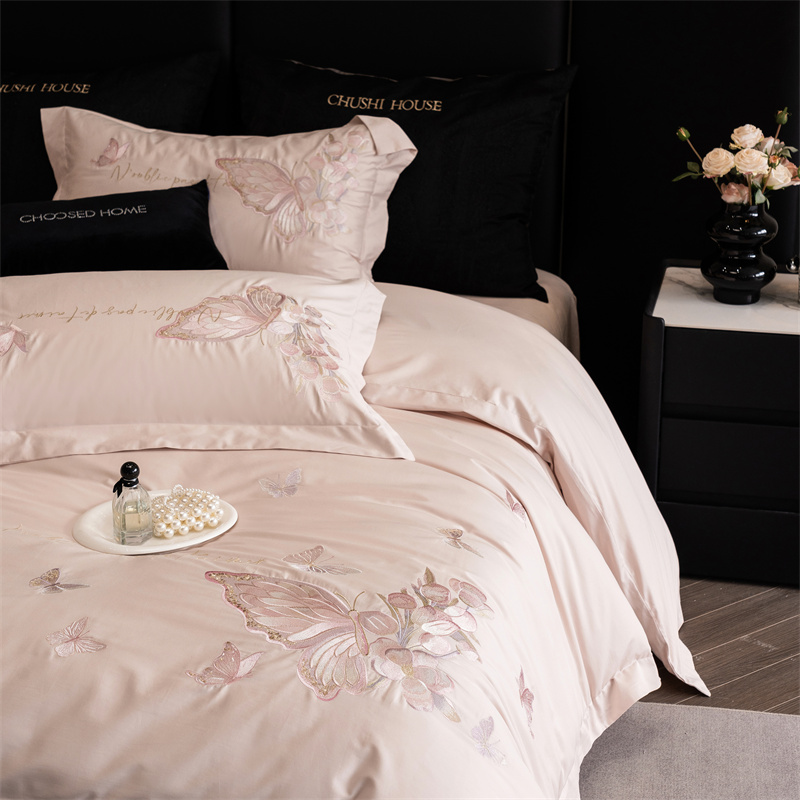 商品名称:初拾 2025新款100s澳棉刺绣四件套-蝶彩霓虹 蝶彩霓虹-雅灰粉