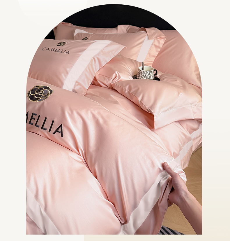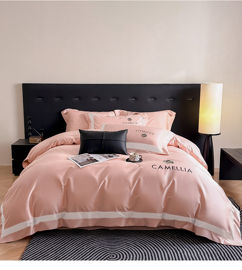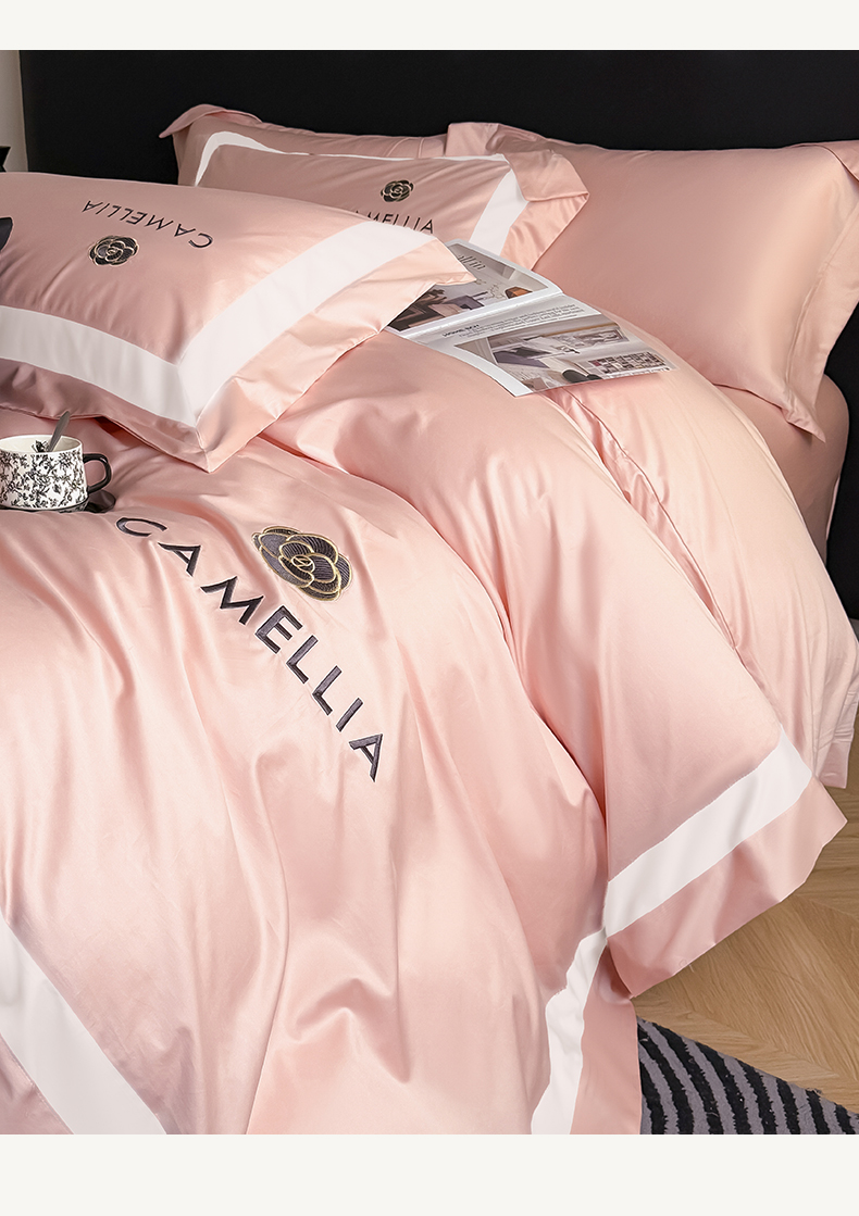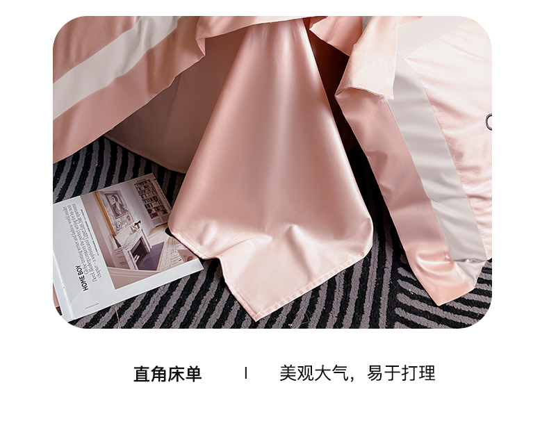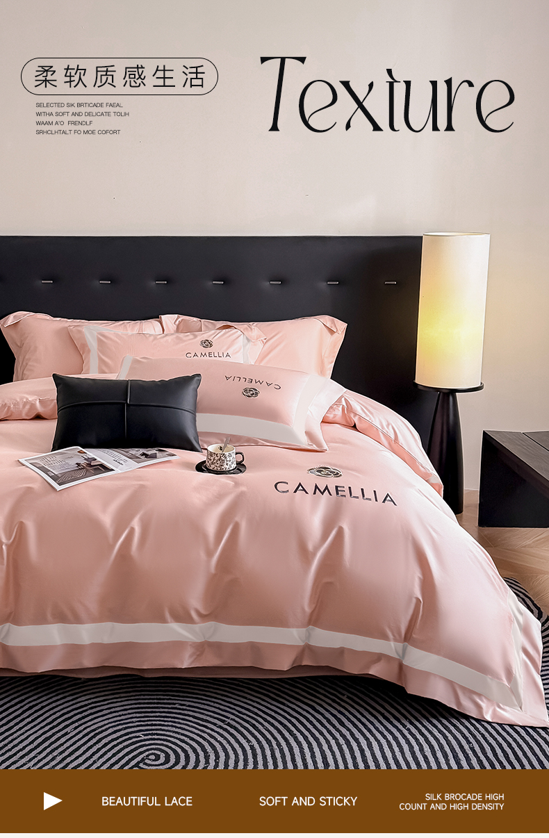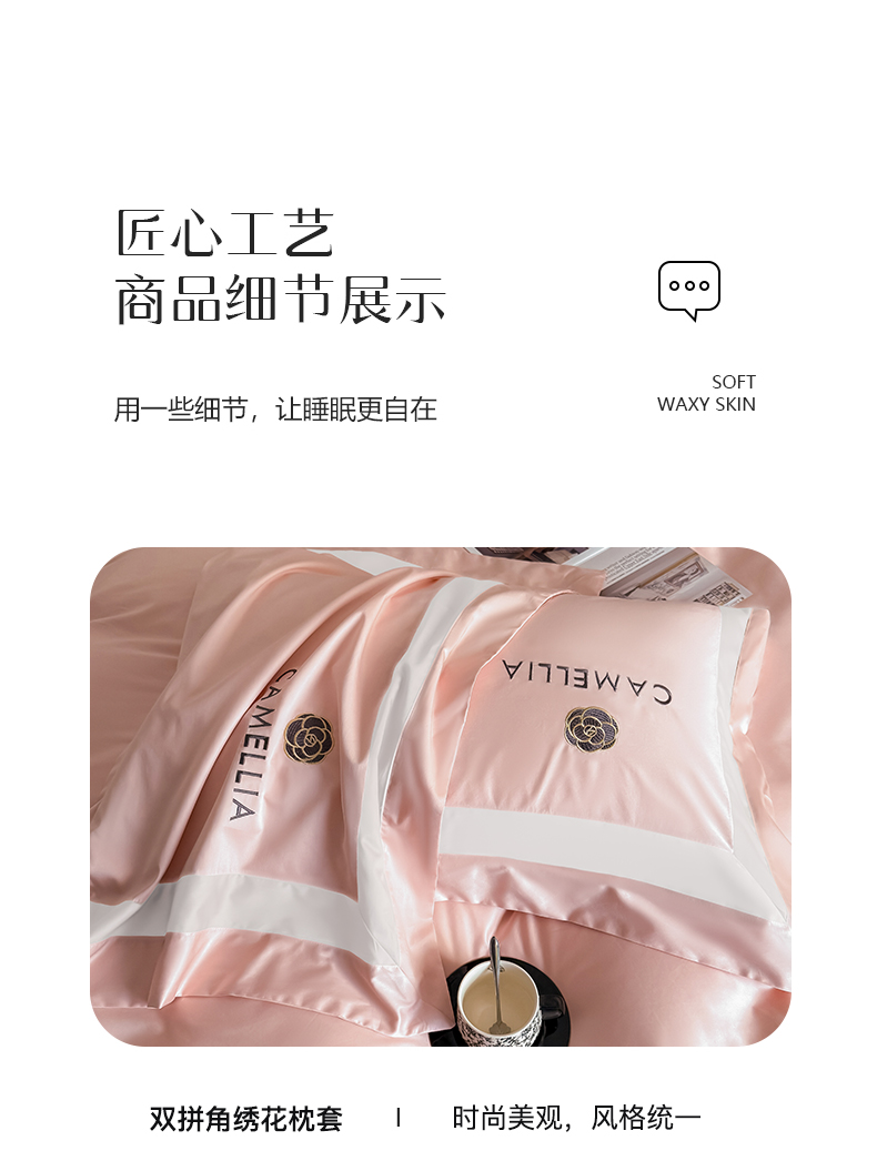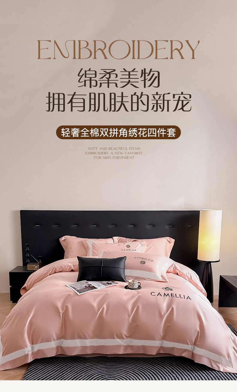 商品名称:水云缦 2025新款轻奢全棉双拼角绣花四件套-米兰系列 米兰-樱花粉