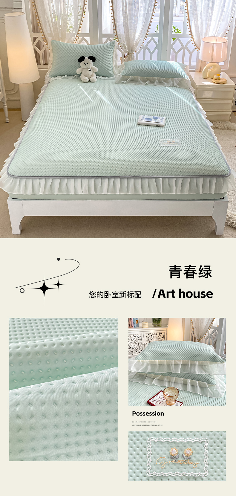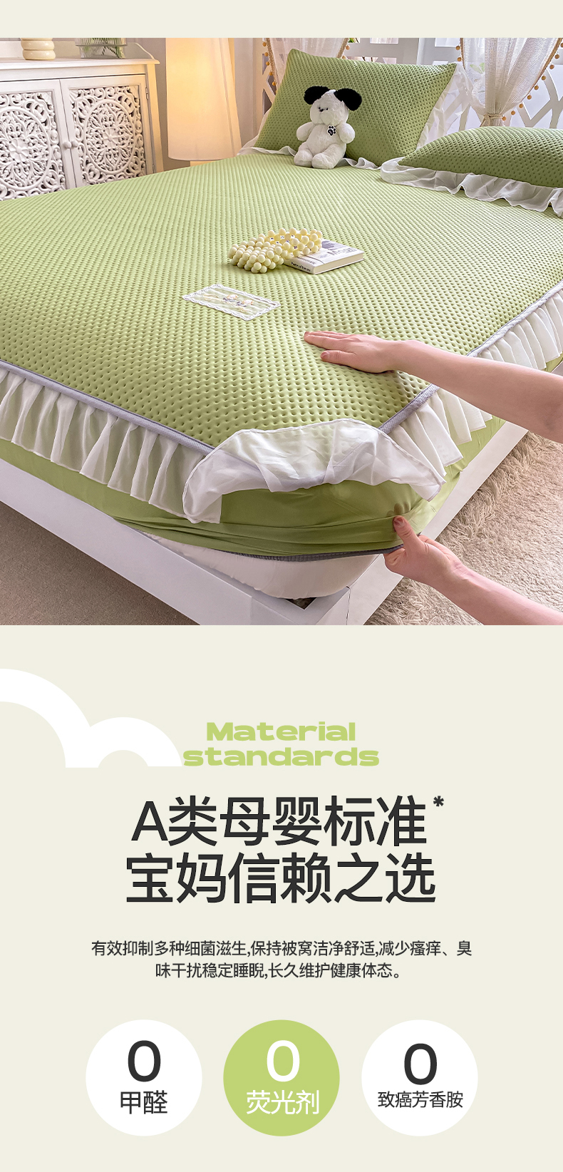 (总)眠势力 2025新款华夫格花边床笠豆豆凉席款夏季凉感床垫保护套 (提供买家秀),奶昔米,奶油粉,青春绿,时尚灰,天空蓝,西瓜绿,香芋紫,杏子灰,紫豆沙