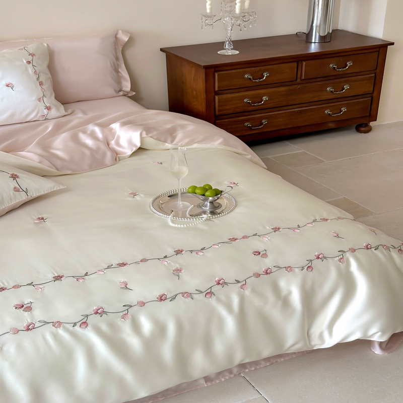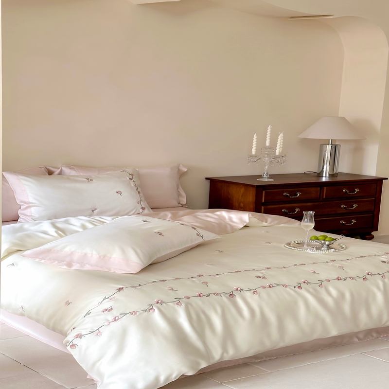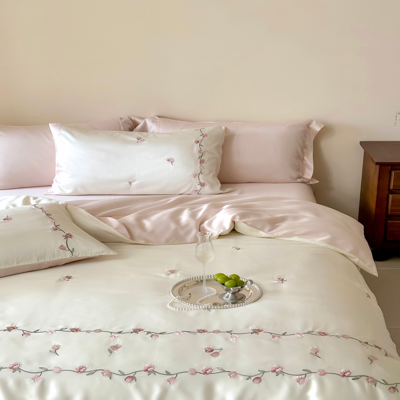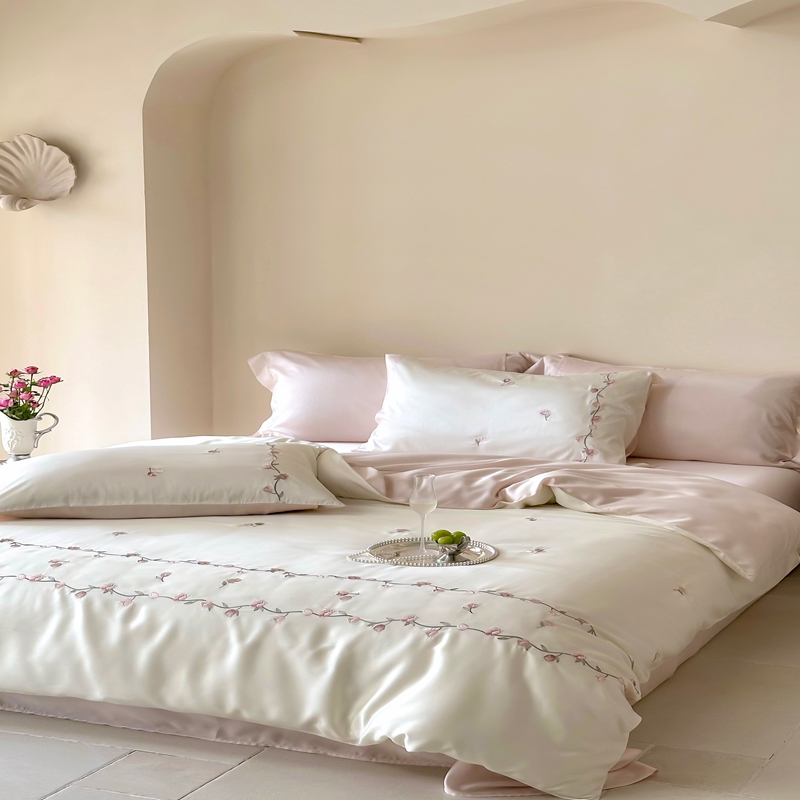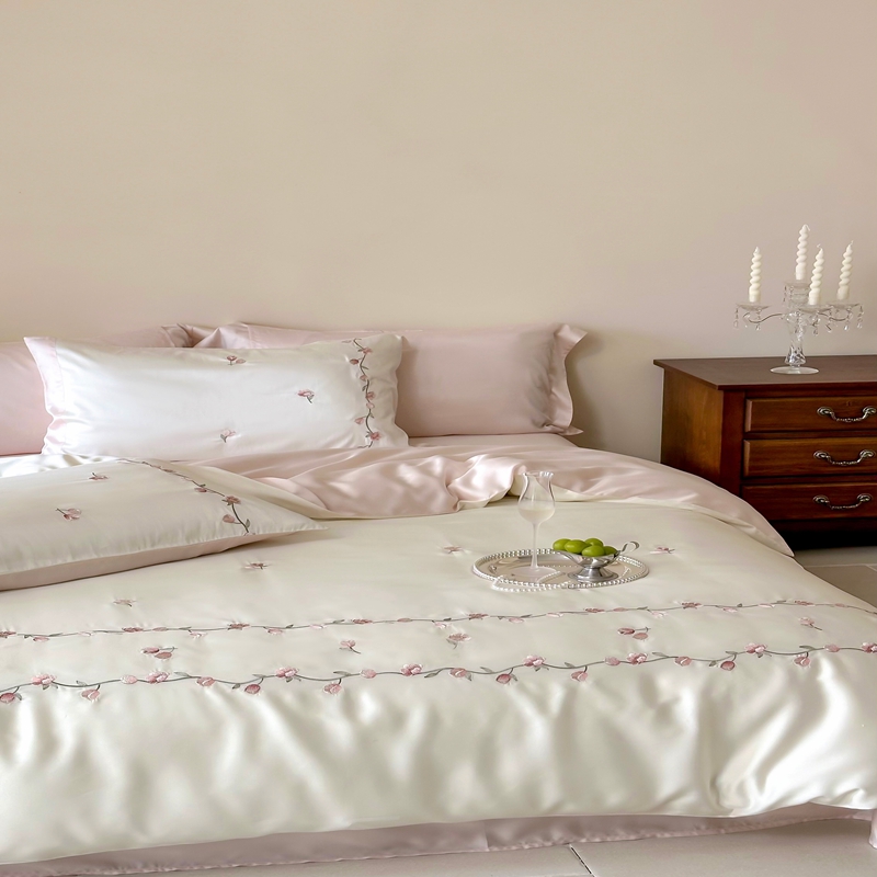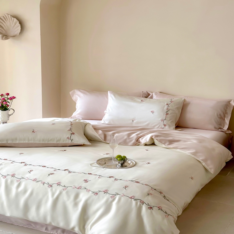 佳汐蓝家纺 2025新款春夏新品TENCEL兰精天丝四件套绣花系列 花颜如梦·珍珠粉