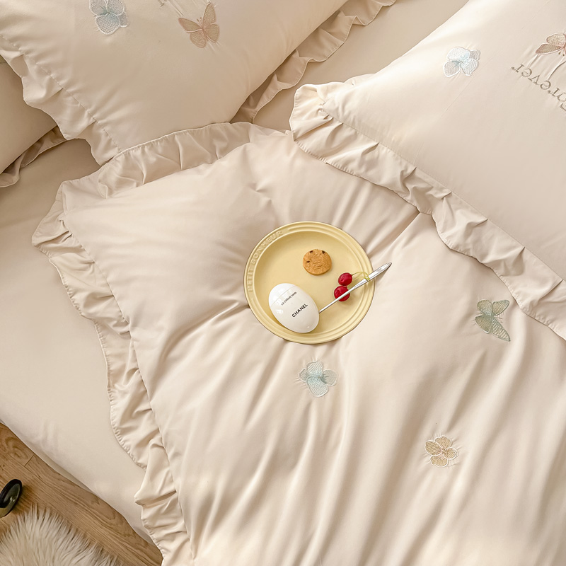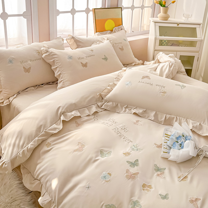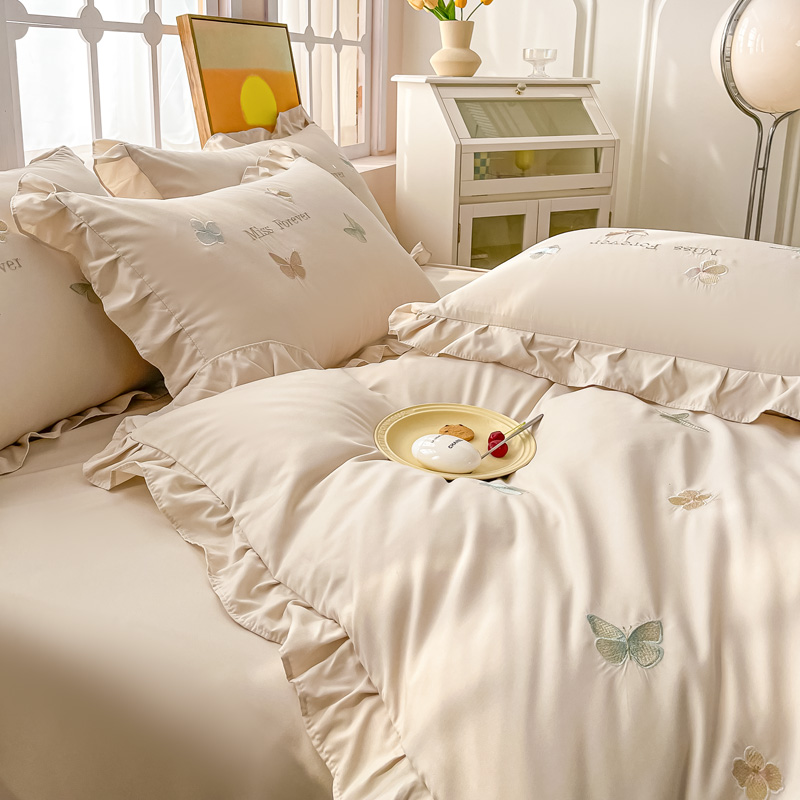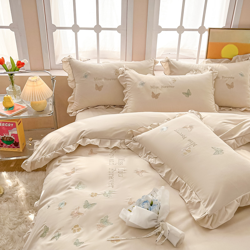 商品名称:恋之语 2025新款水洗棉刺绣花边四件套-蝶羽 蝶羽-米白