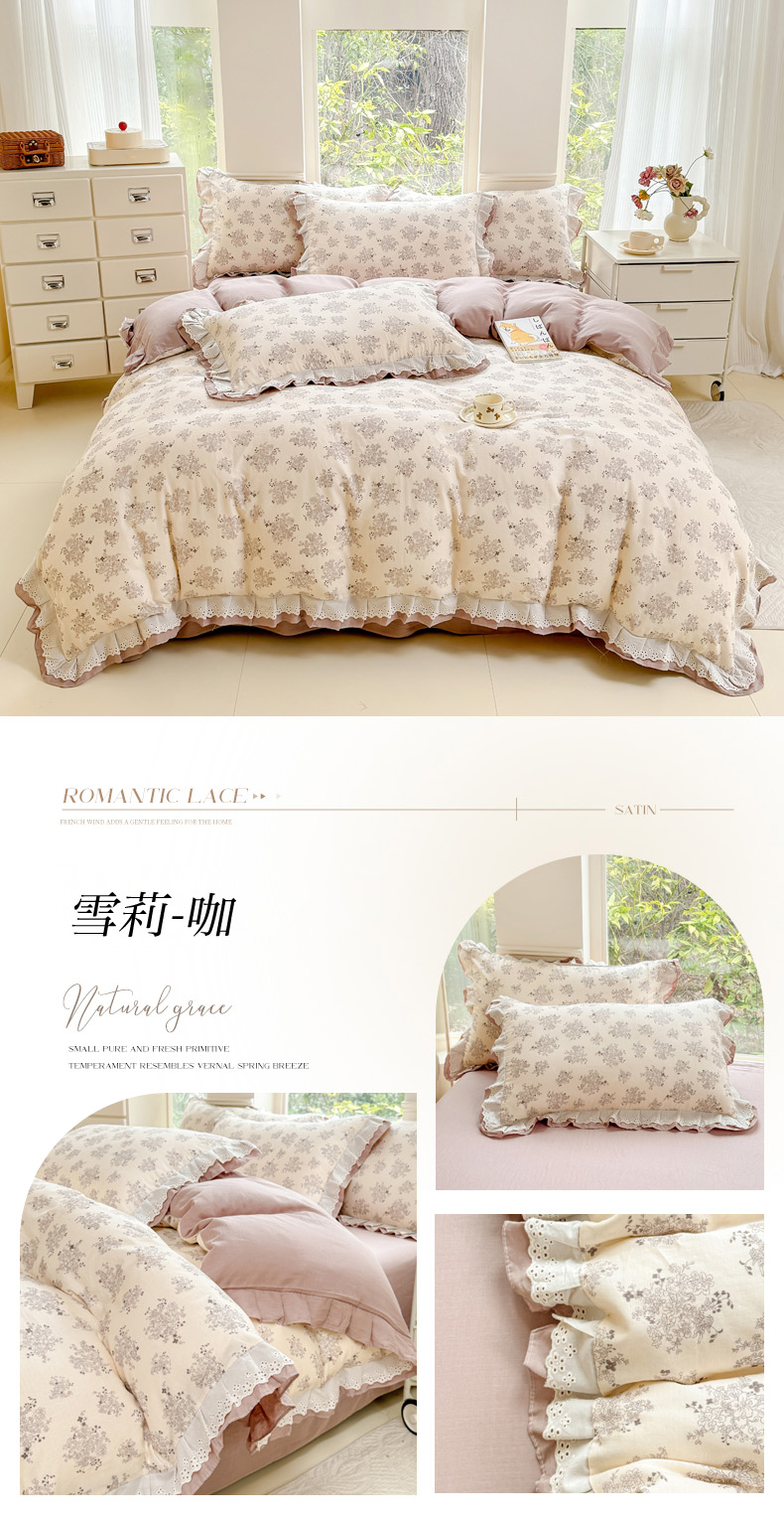 商品名称:晨晨家纺2025新款全棉双层花边双层纱四件套 雪莉-咖