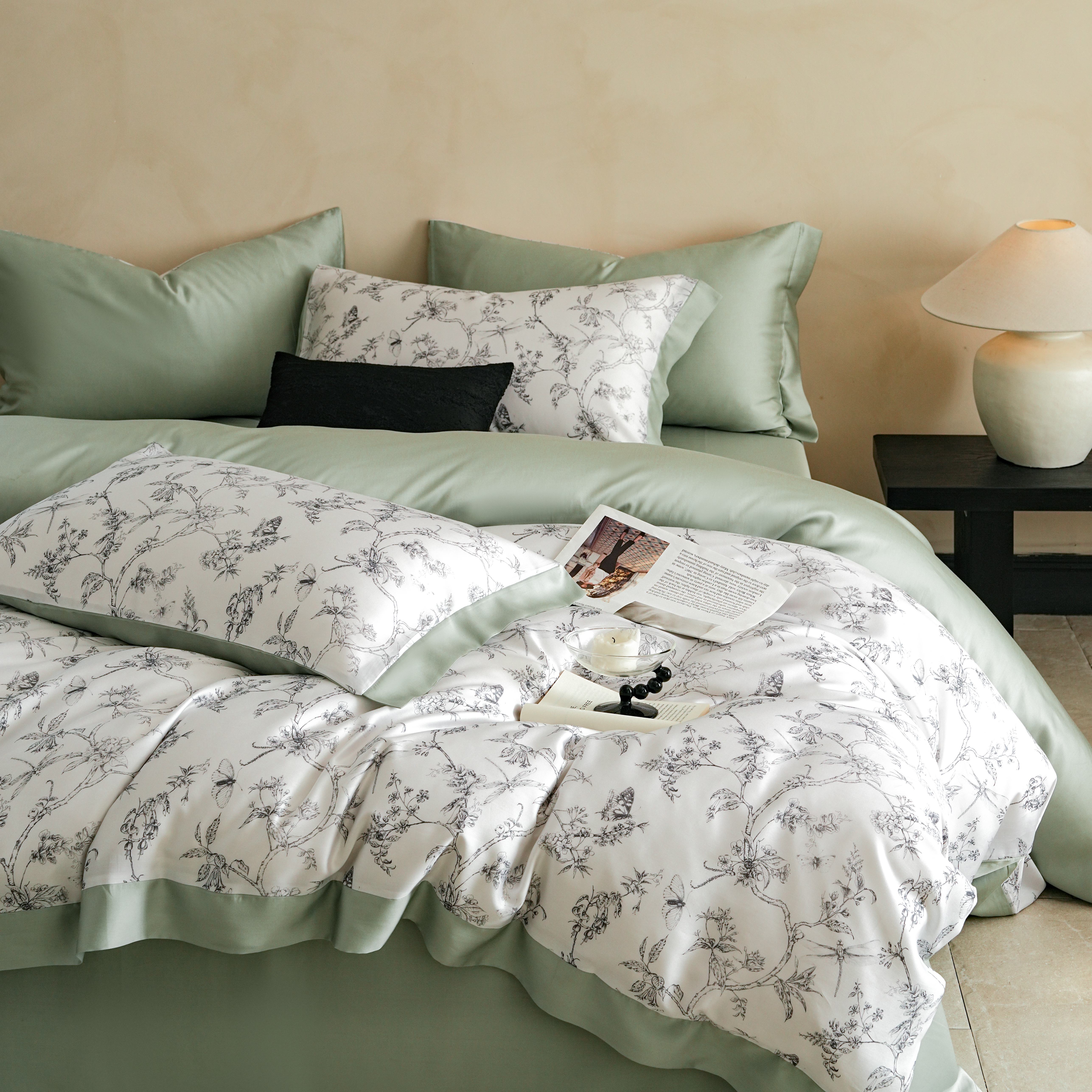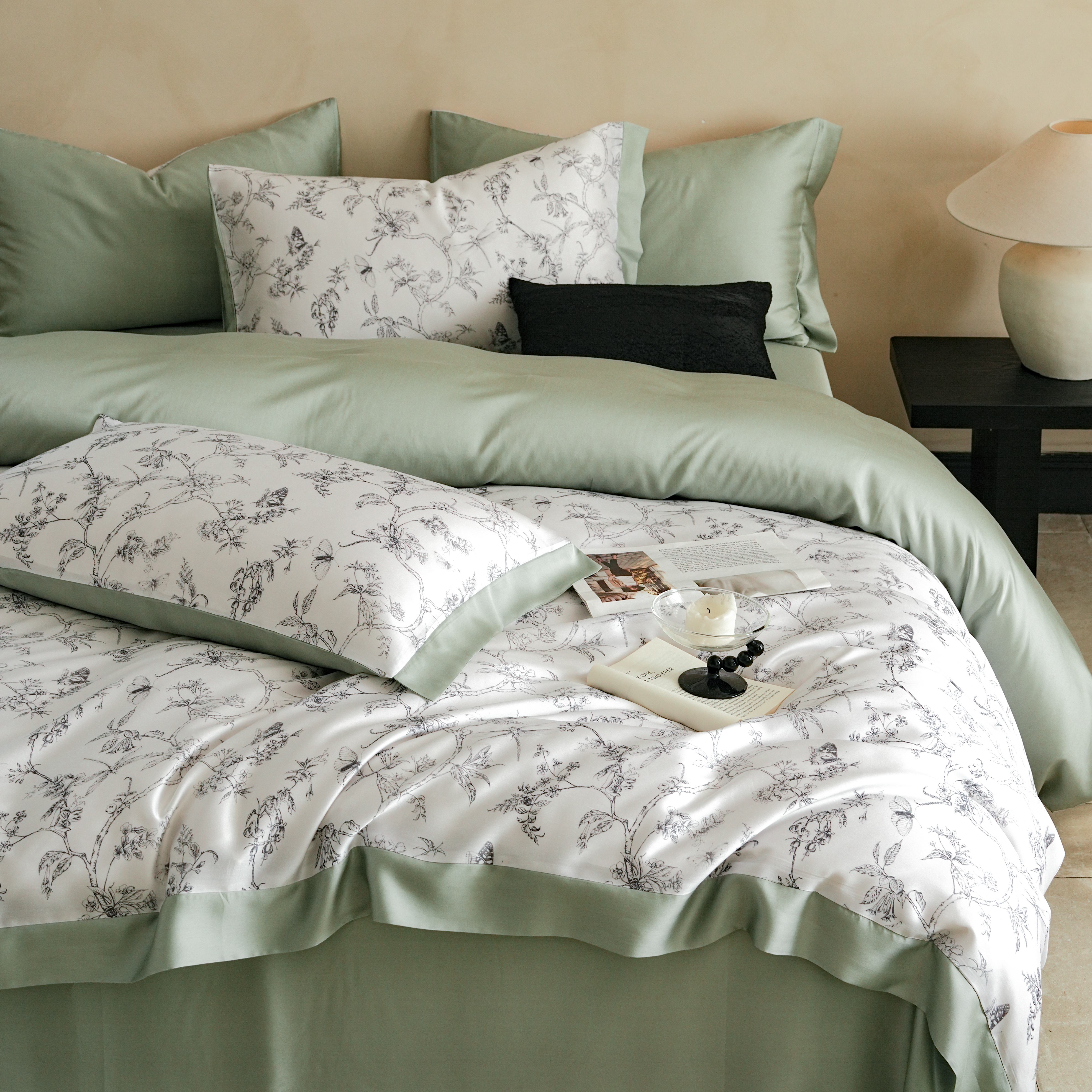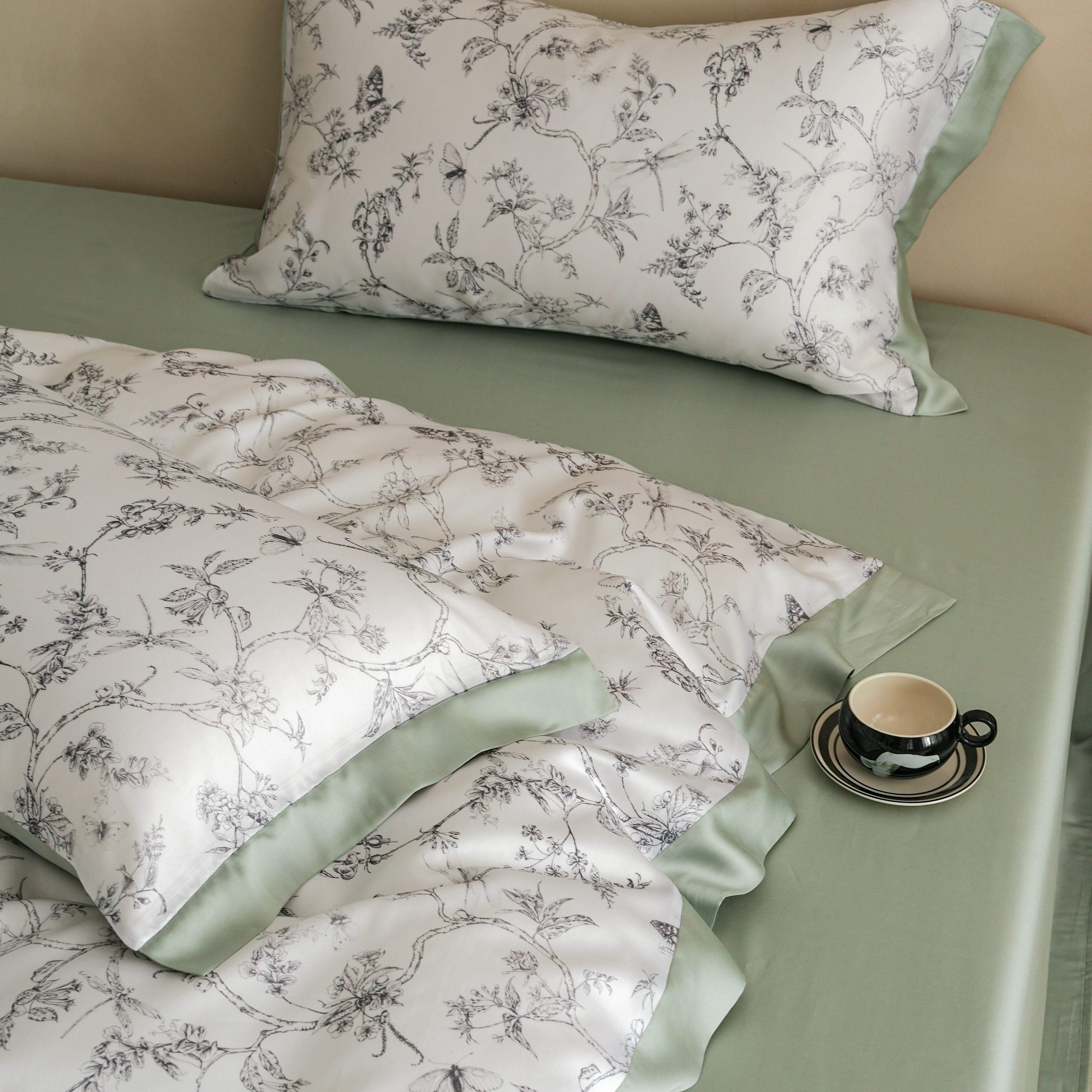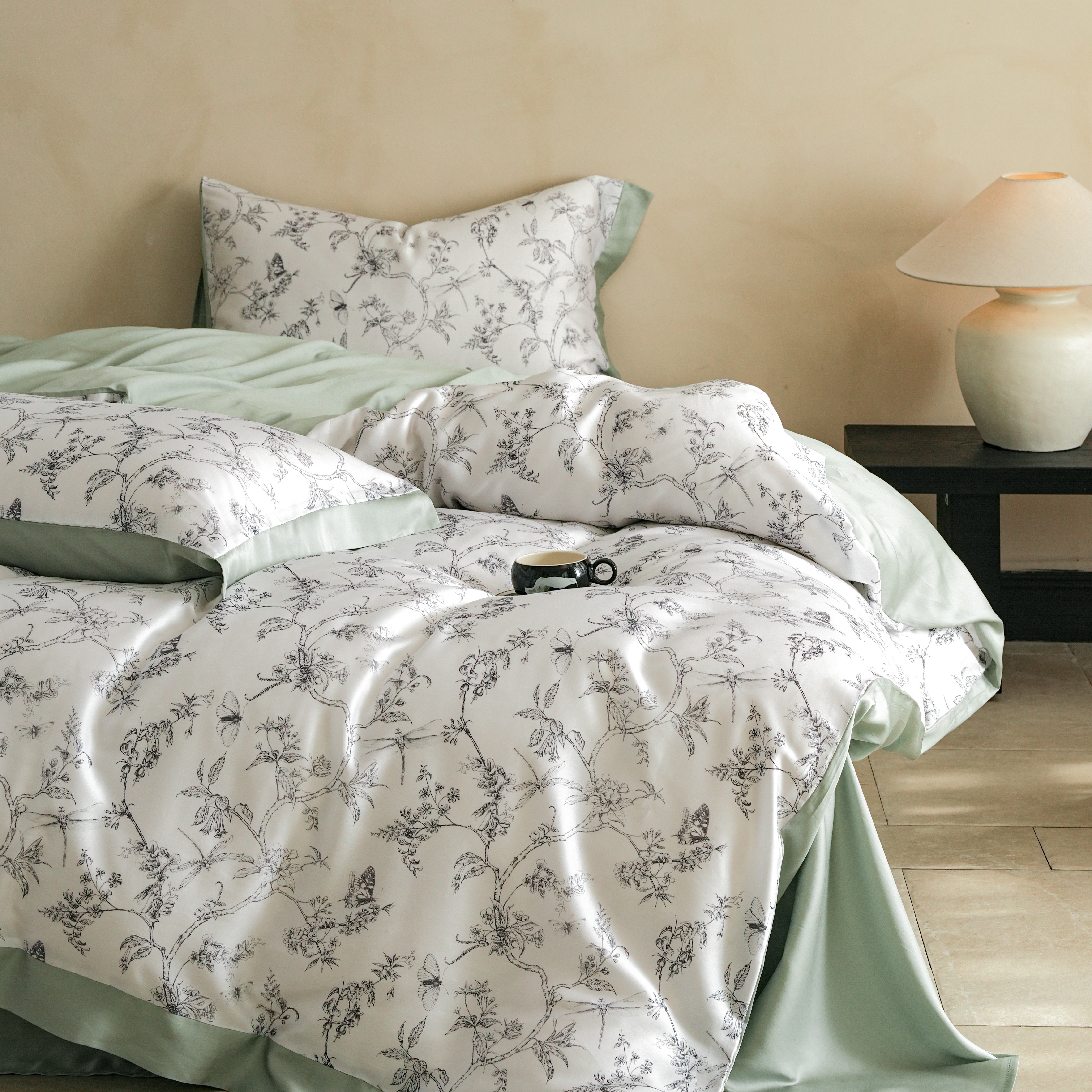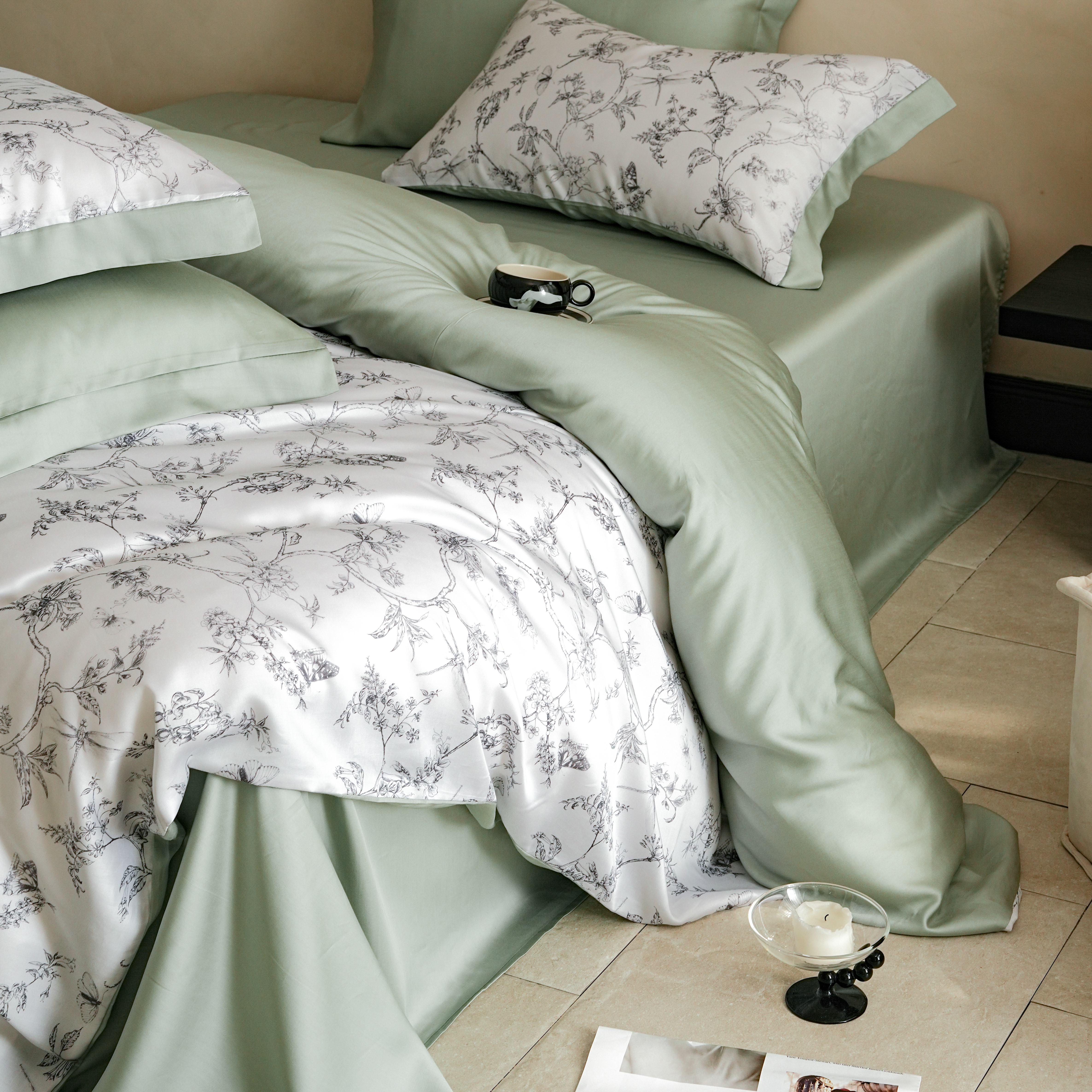 本制 2025新款水洗真丝印花四件套 浅绿卉影