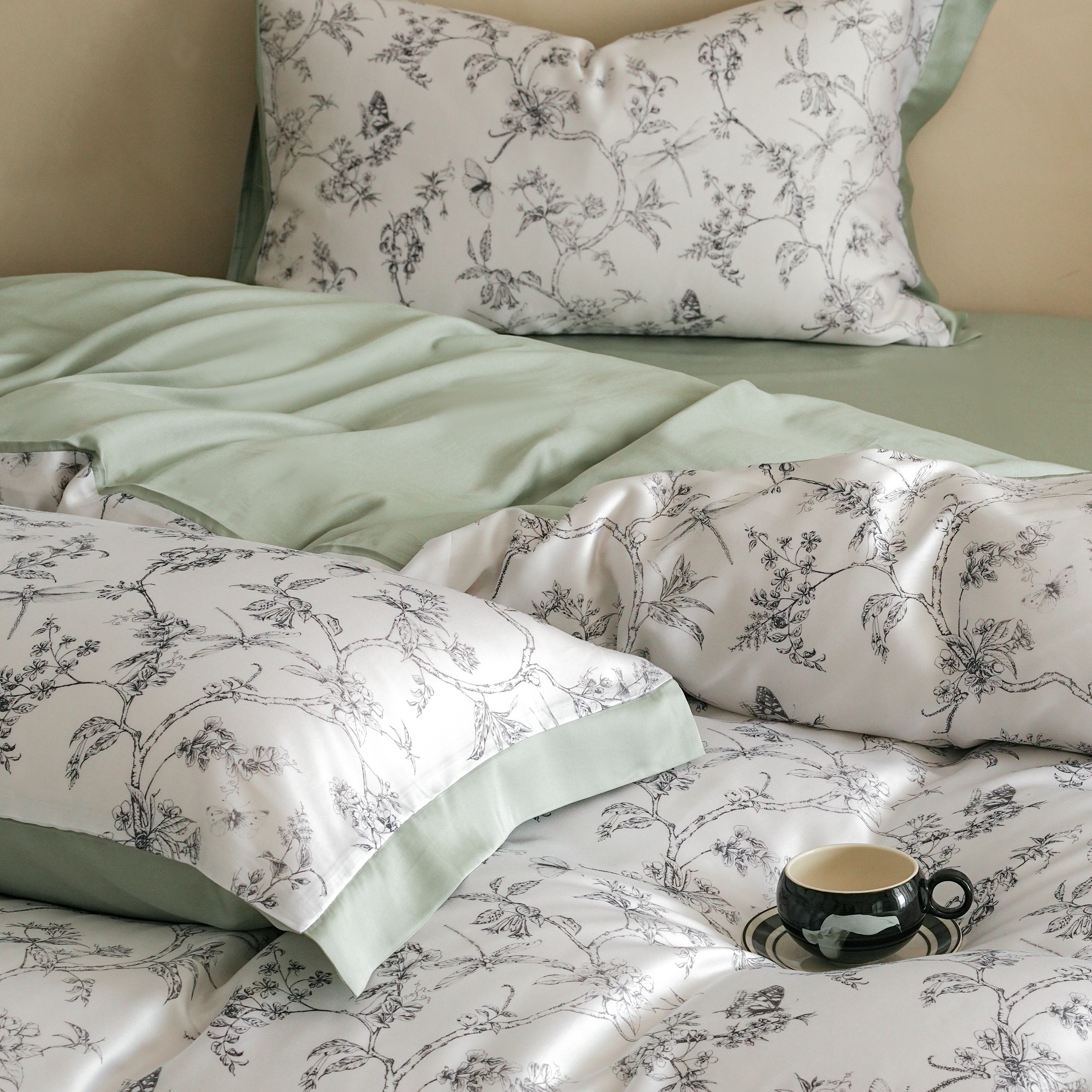 商品名称:本制 2025新款水洗真丝印花四件套 浅绿卉影
