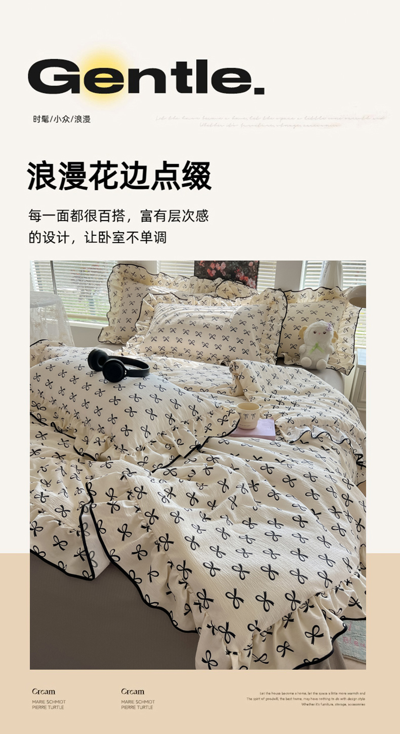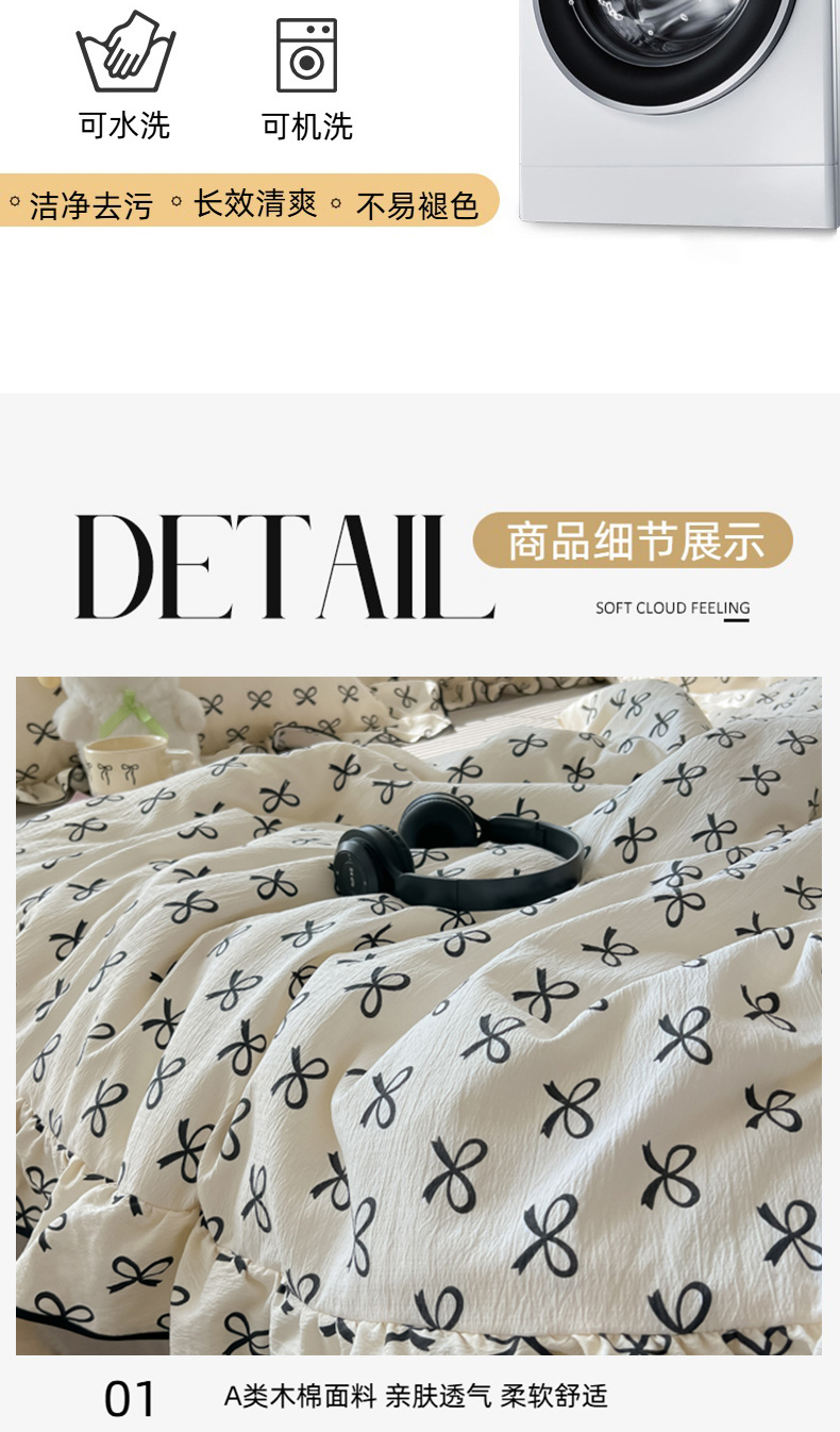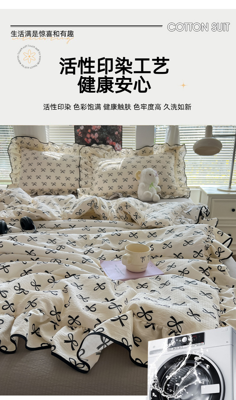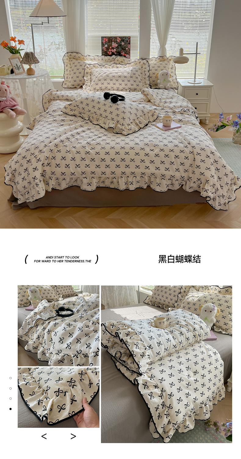商品名称:十里居 2025新款云感木棉花边夏被四件套 黑白蝴蝶结