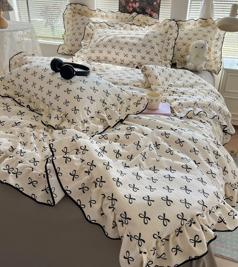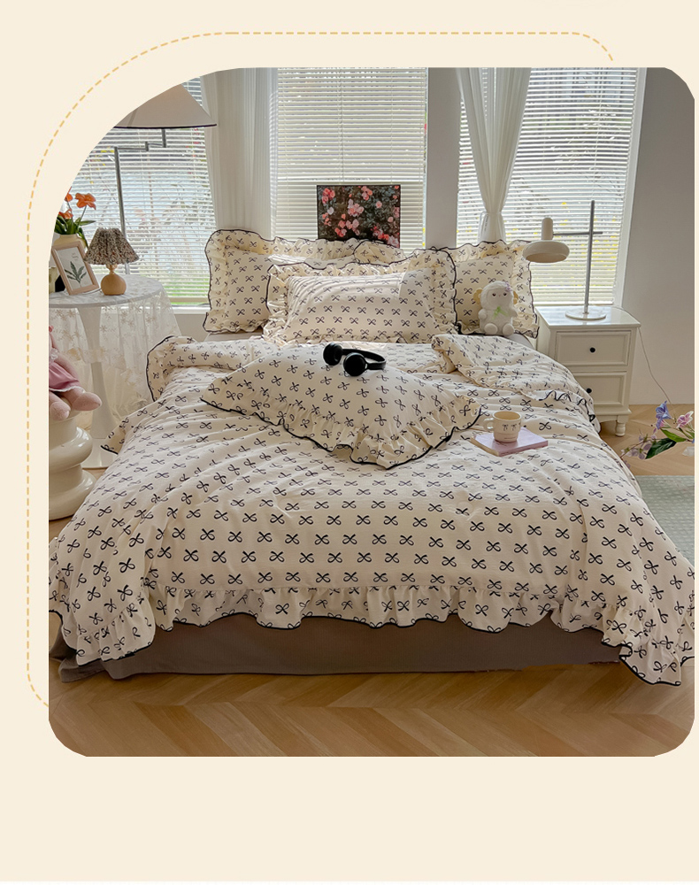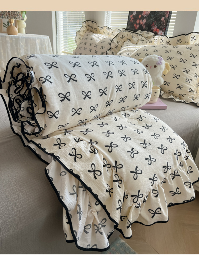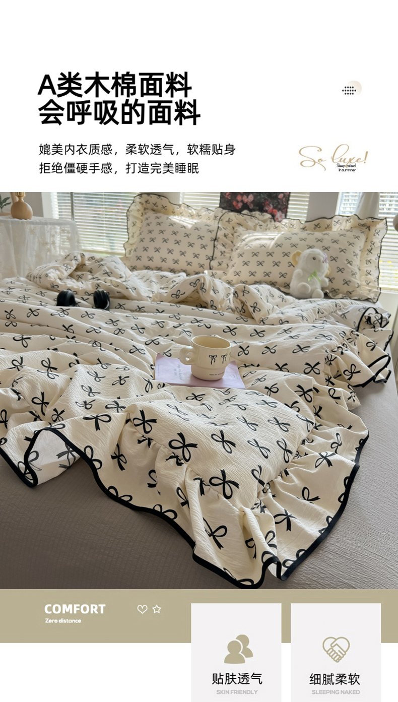 十里居 2025新款云感木棉花边夏被四件套 黑白蝴蝶结