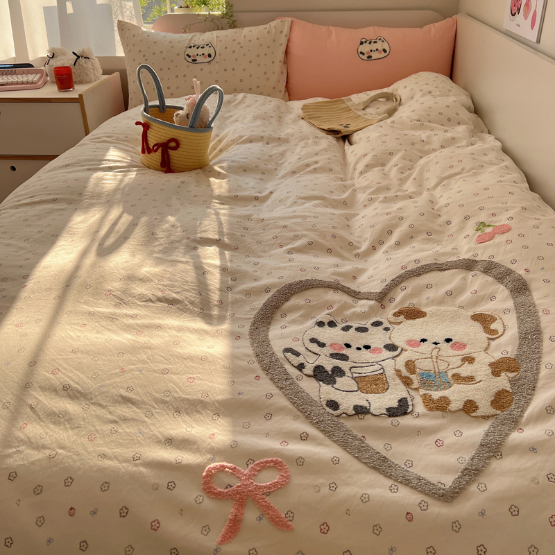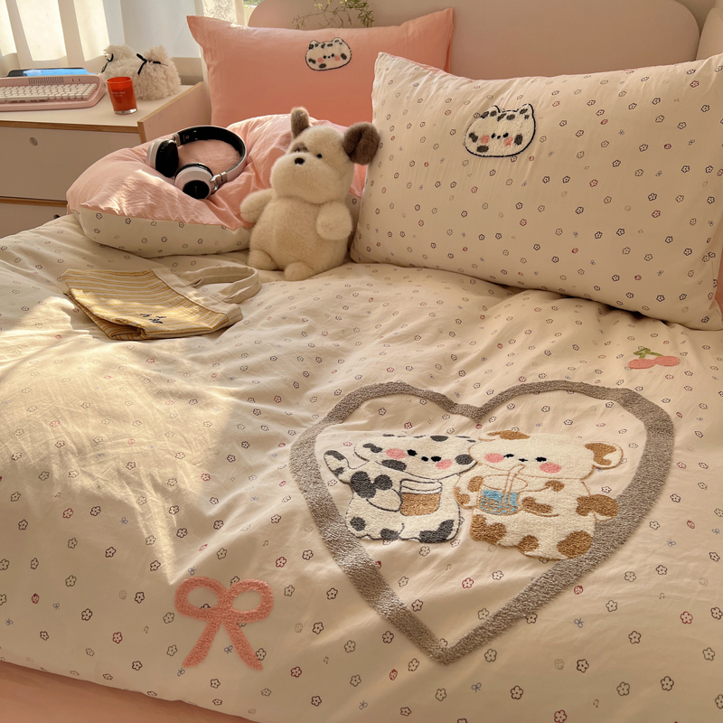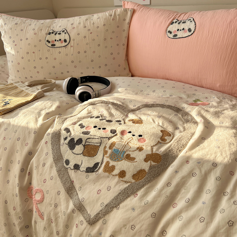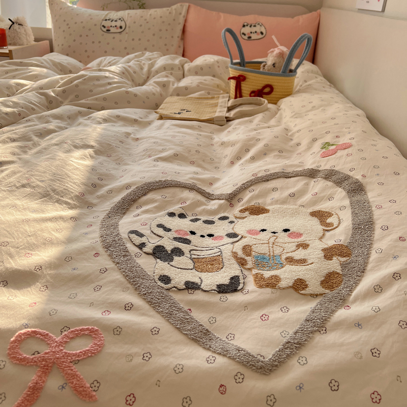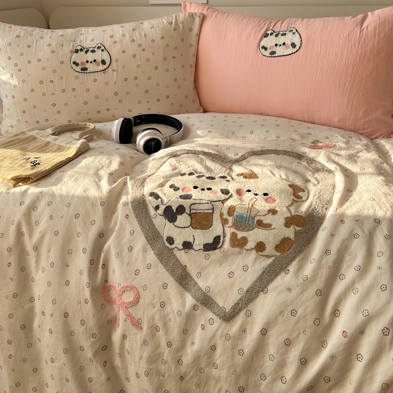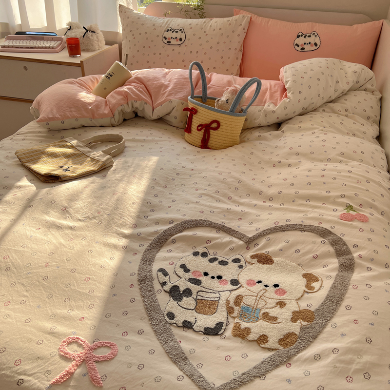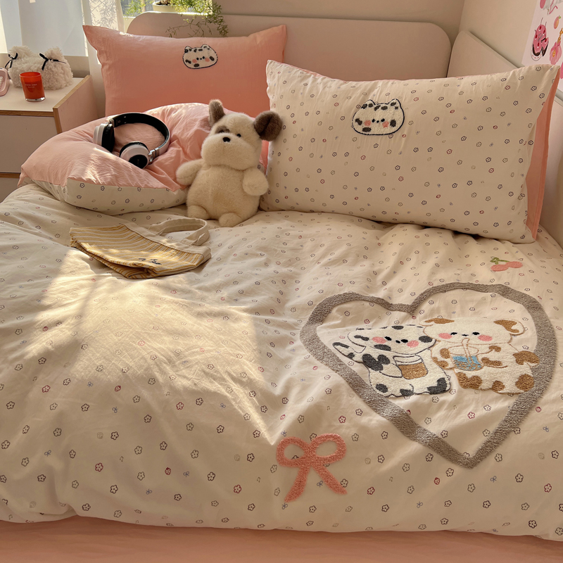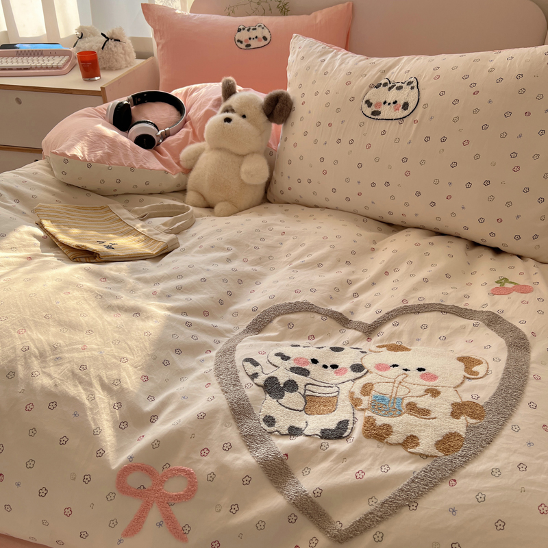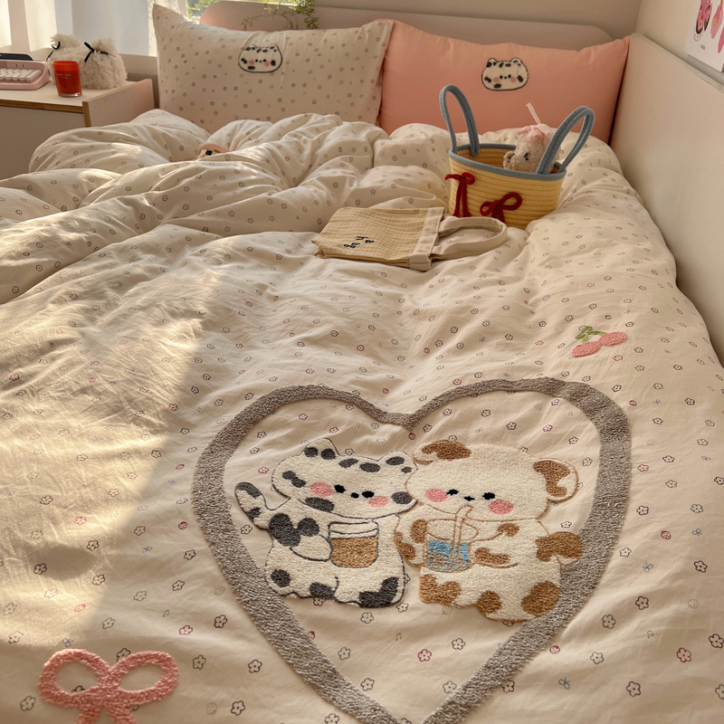 商品名称:顾里家纺 2025新款ins韩系童趣毛巾绣云朵棉四件套 奶茶好友