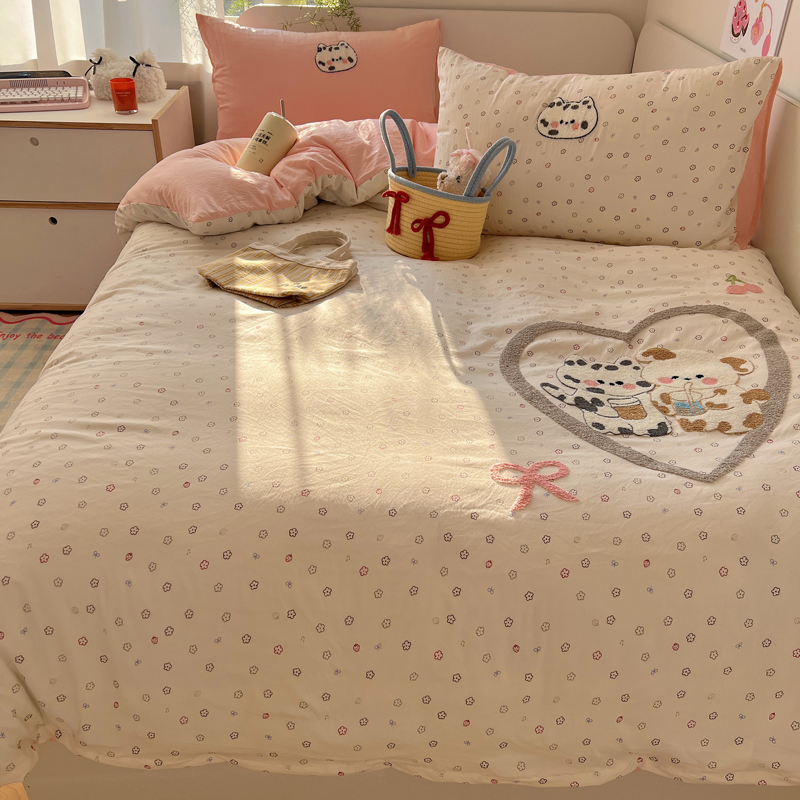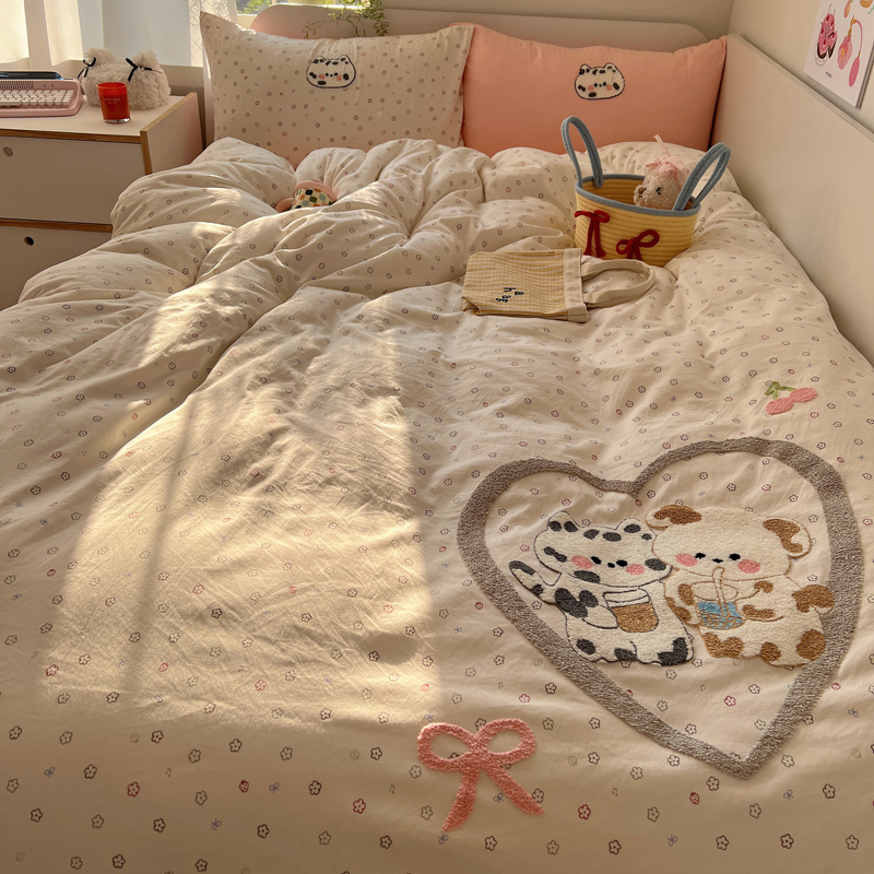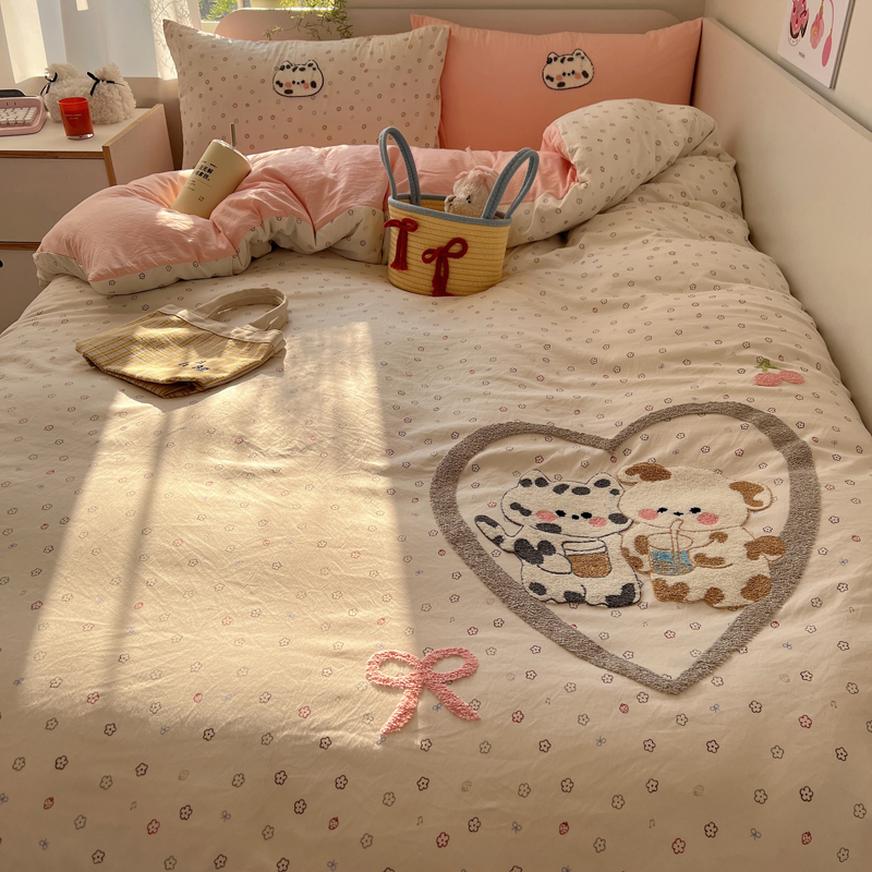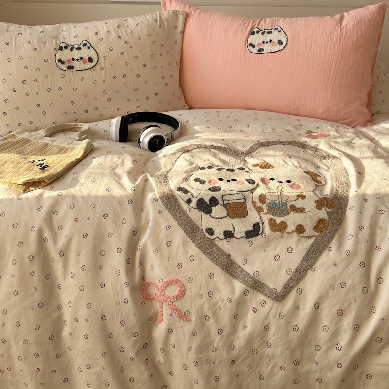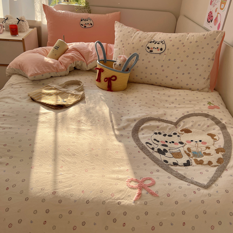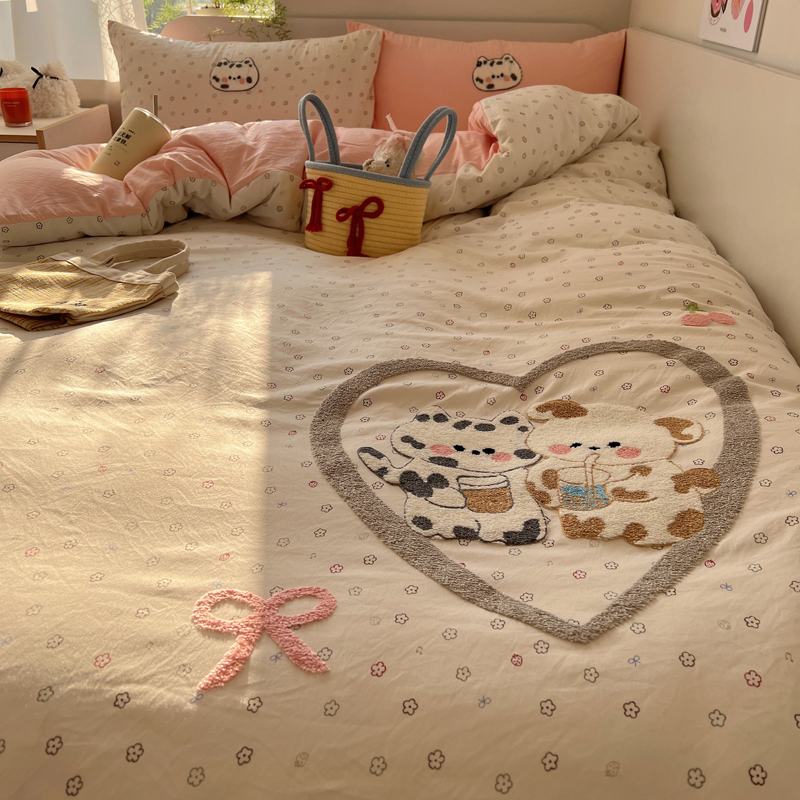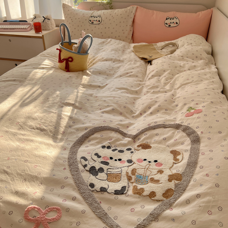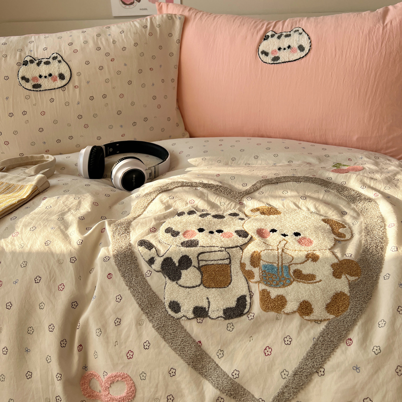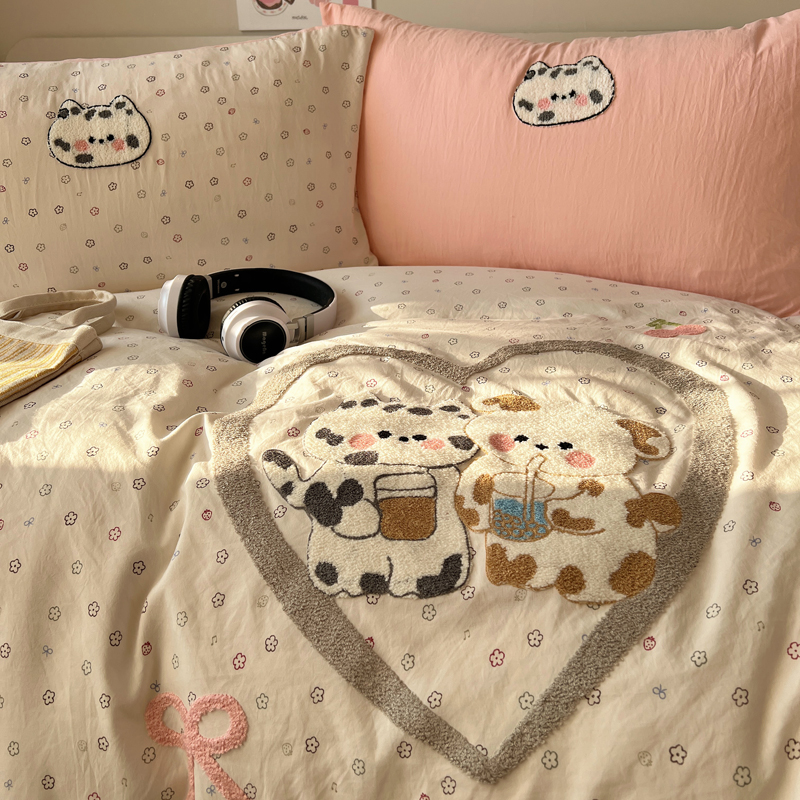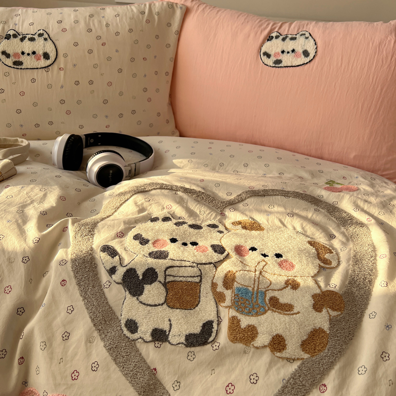 商品名称:顾里家纺 2025新款ins韩系童趣毛巾绣云朵棉四件套 奶茶好友