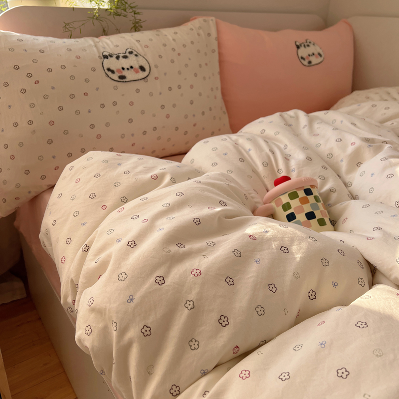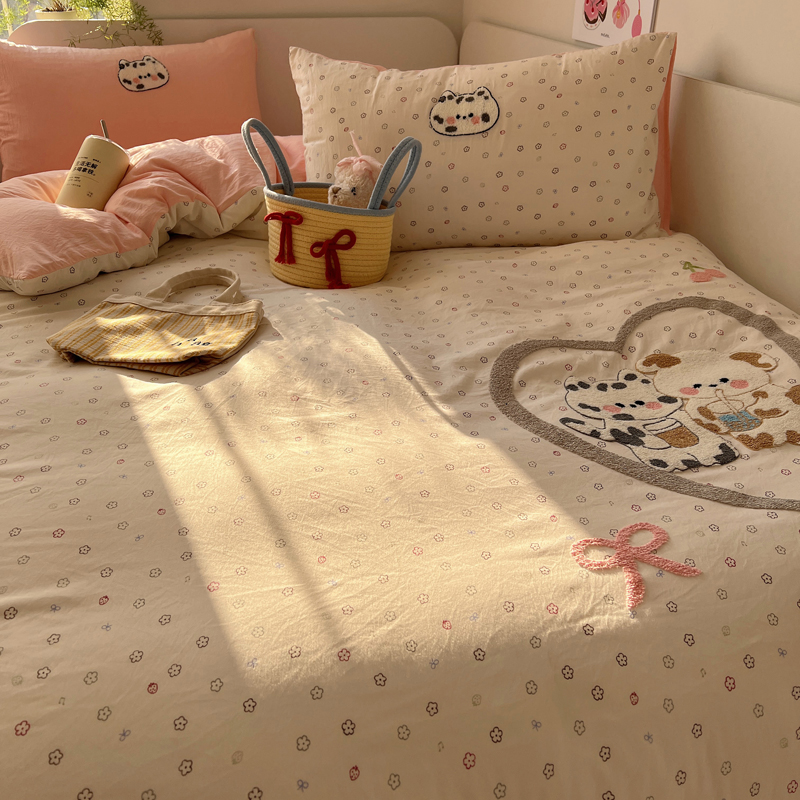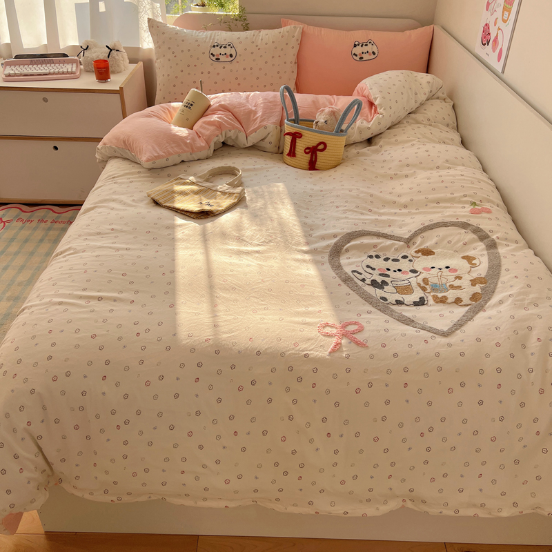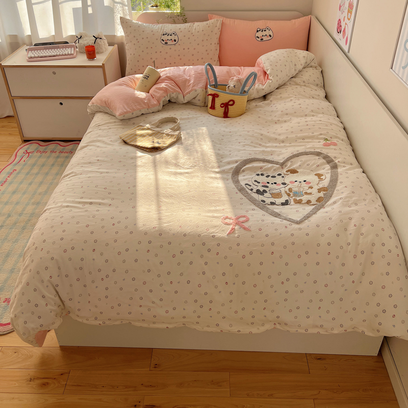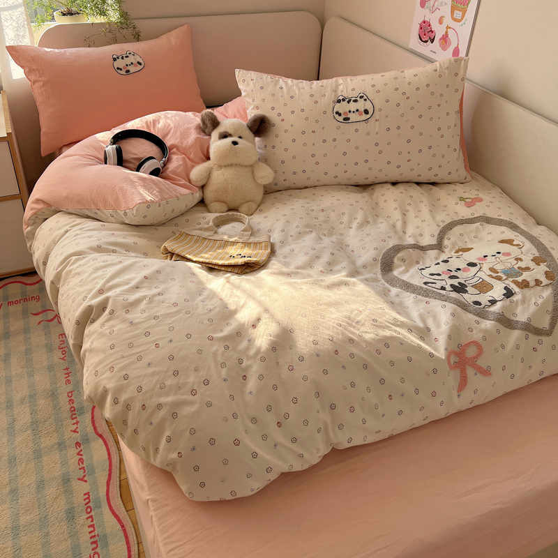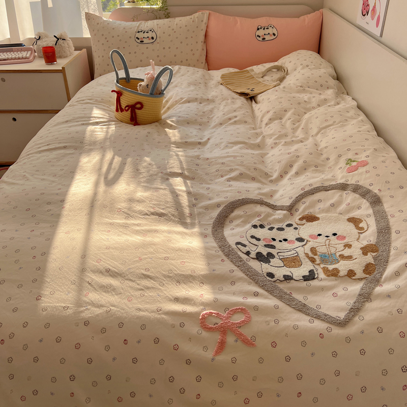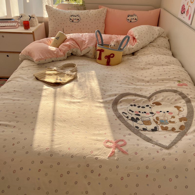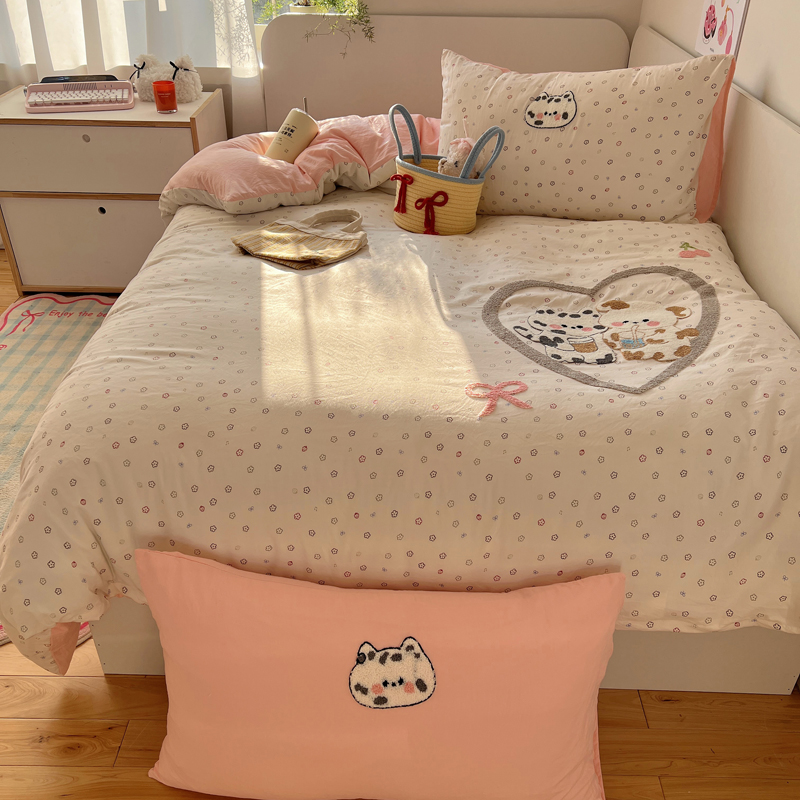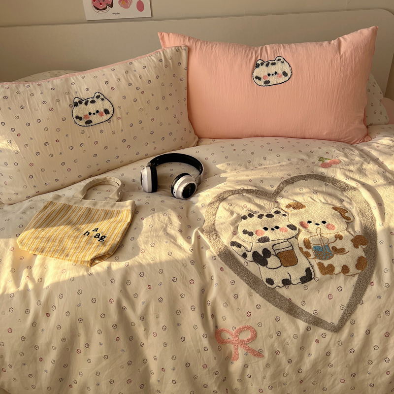 商品名称:顾里家纺 2025新款ins韩系童趣毛巾绣云朵棉四件套 奶茶好友