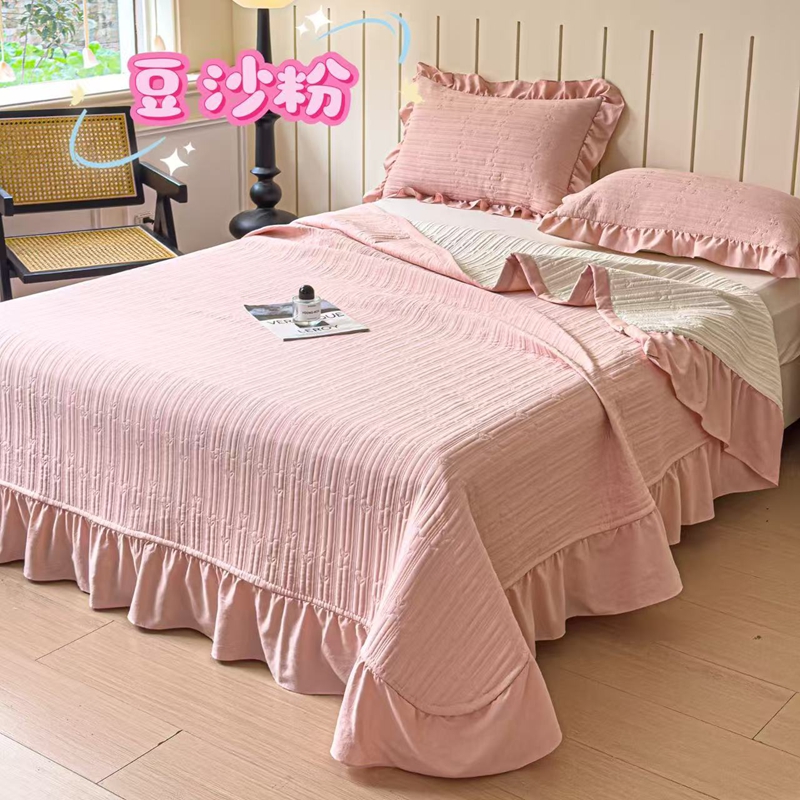 (总)希朵家纺 2025新款麻夫格床盖三件套,豆沙粉,米白色,牛油果绿,清泉绿,时尚灰,天空蓝,优雅紫