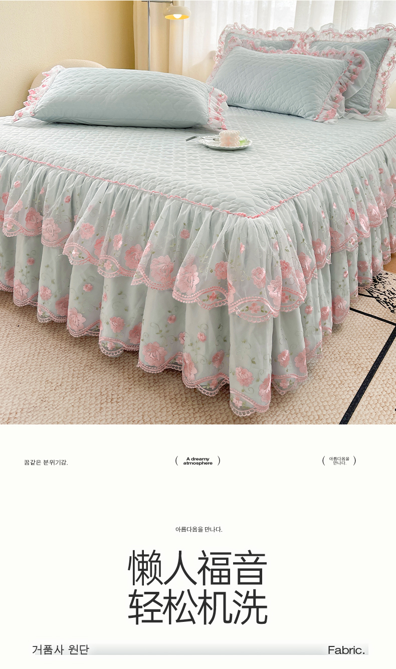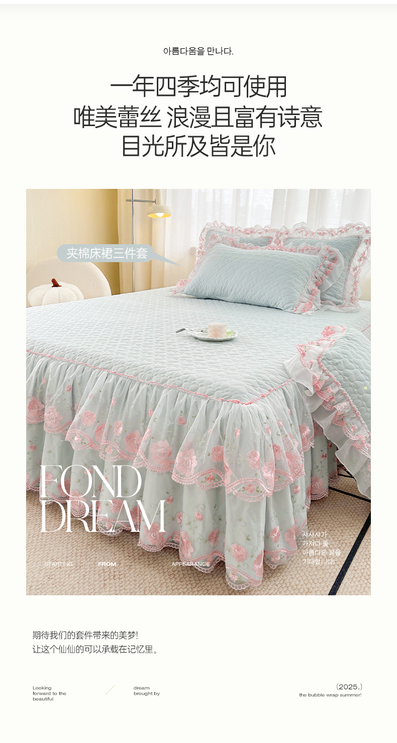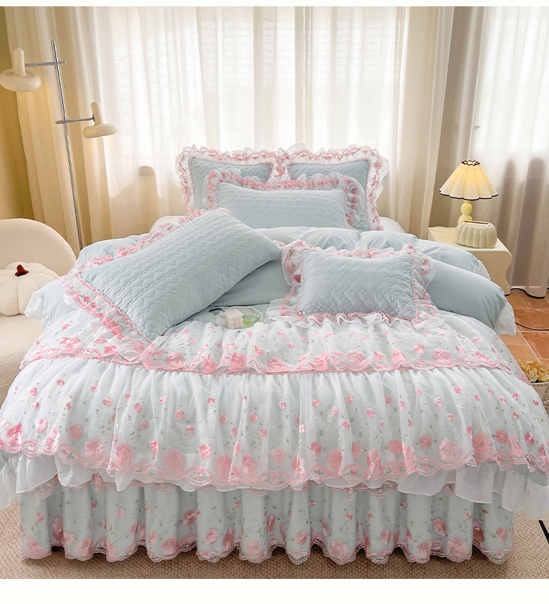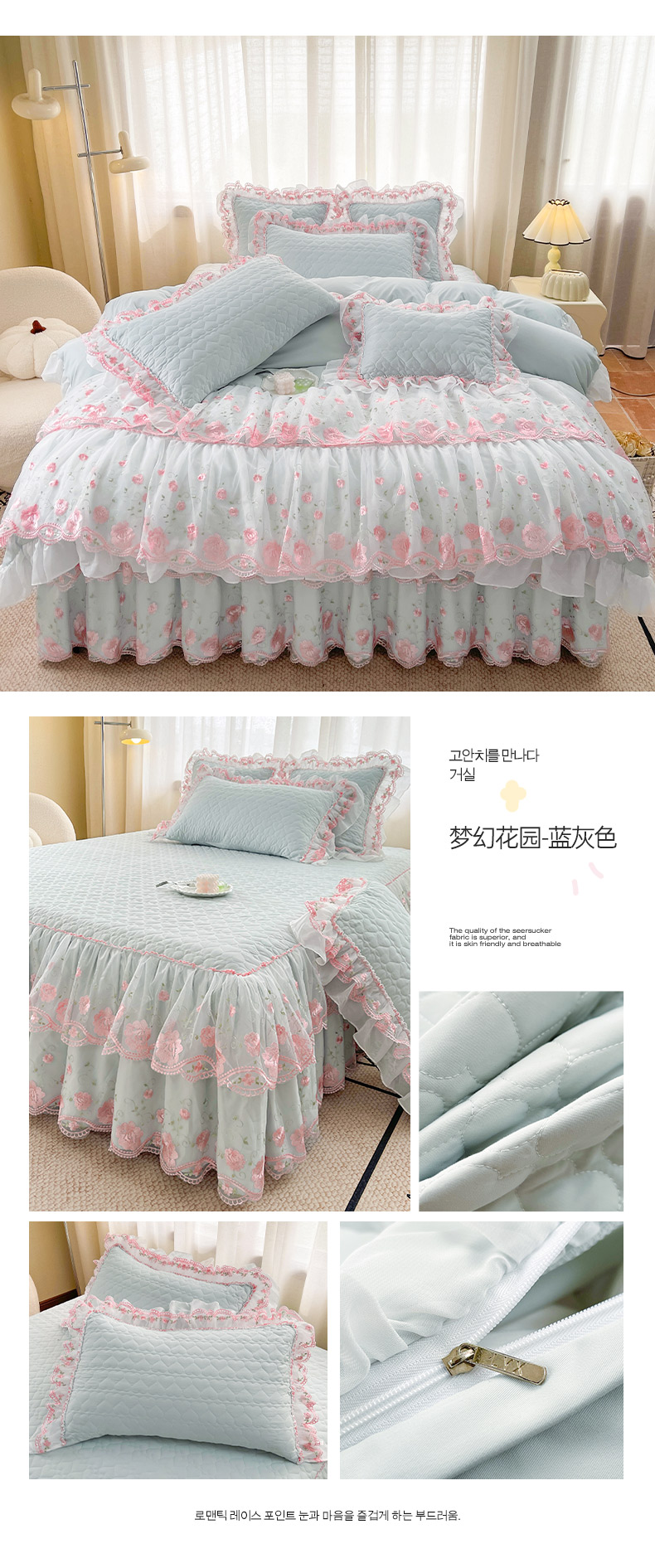 当前位置: 91家纺网 > 商品网购 > 床品套件 > 四件套 > 化纤普通四件套 > 罗艺轩 2025新款A类珍珠棉花边床裙四件套-梦幻花园 梦幻花园-蓝灰色