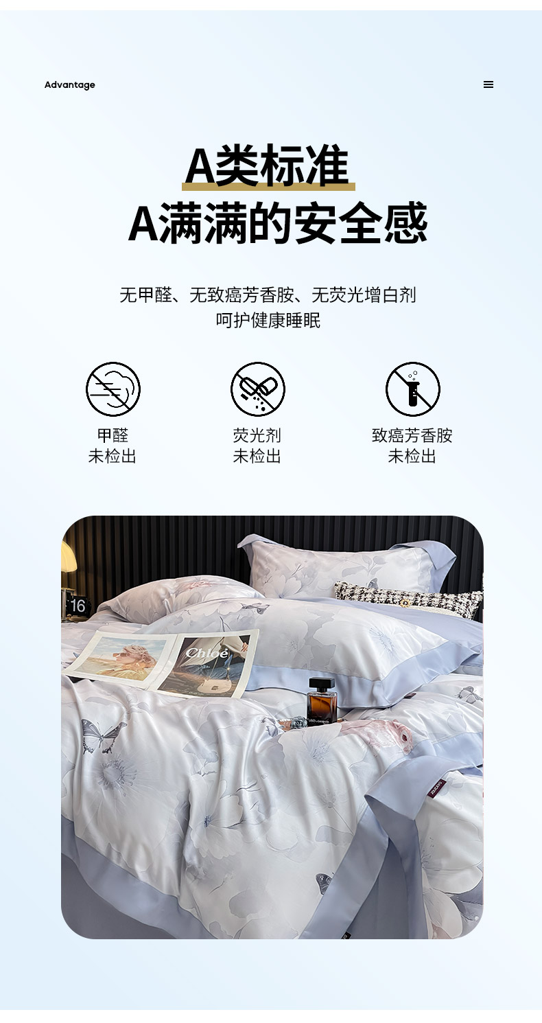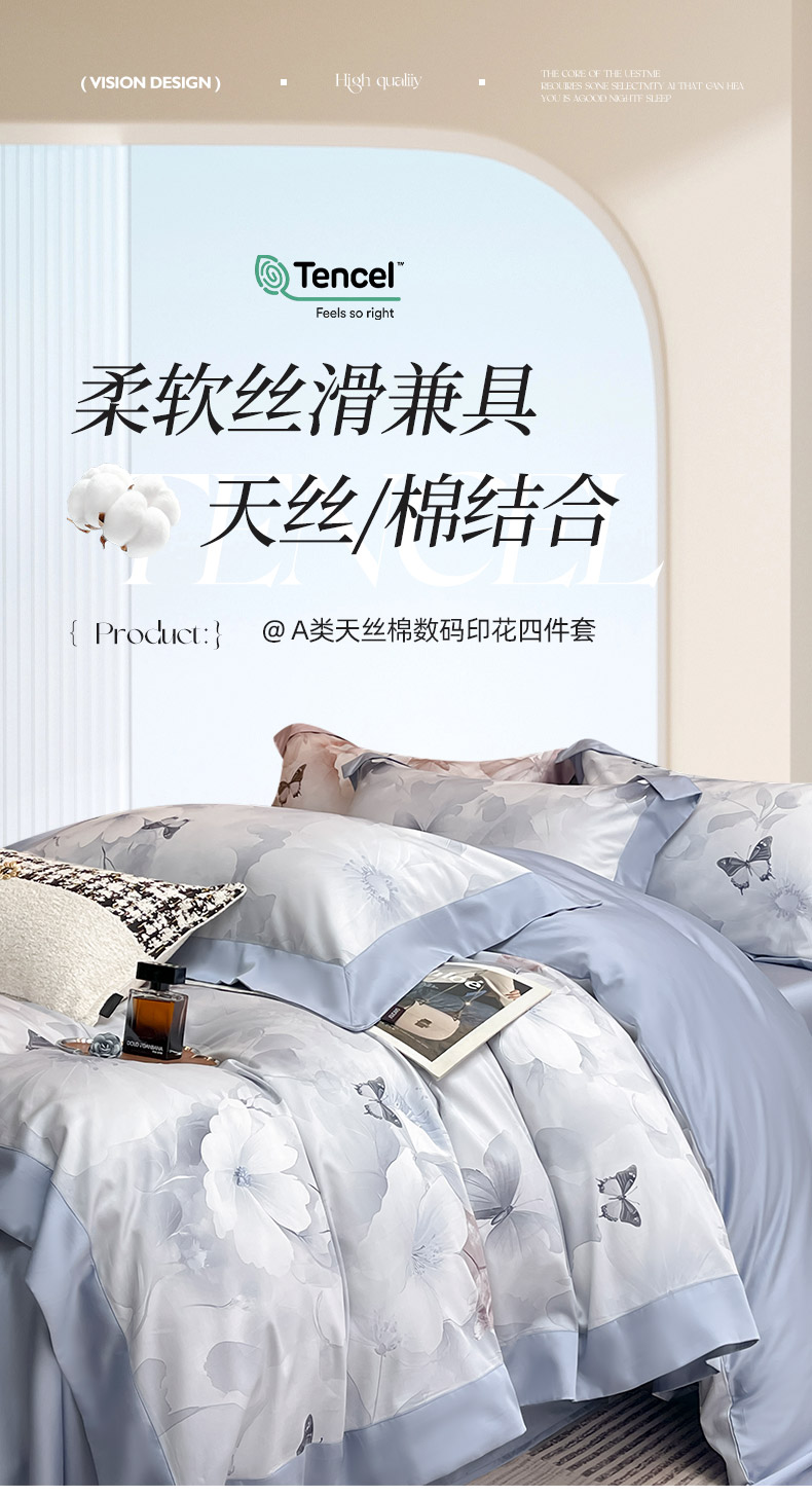 商品名称:2025夏季A类母婴级天丝棉印花四件套纯棉全棉高端数码印花丝滑裸睡长绒棉被套真丝床上用品 蝶织梦-蓝