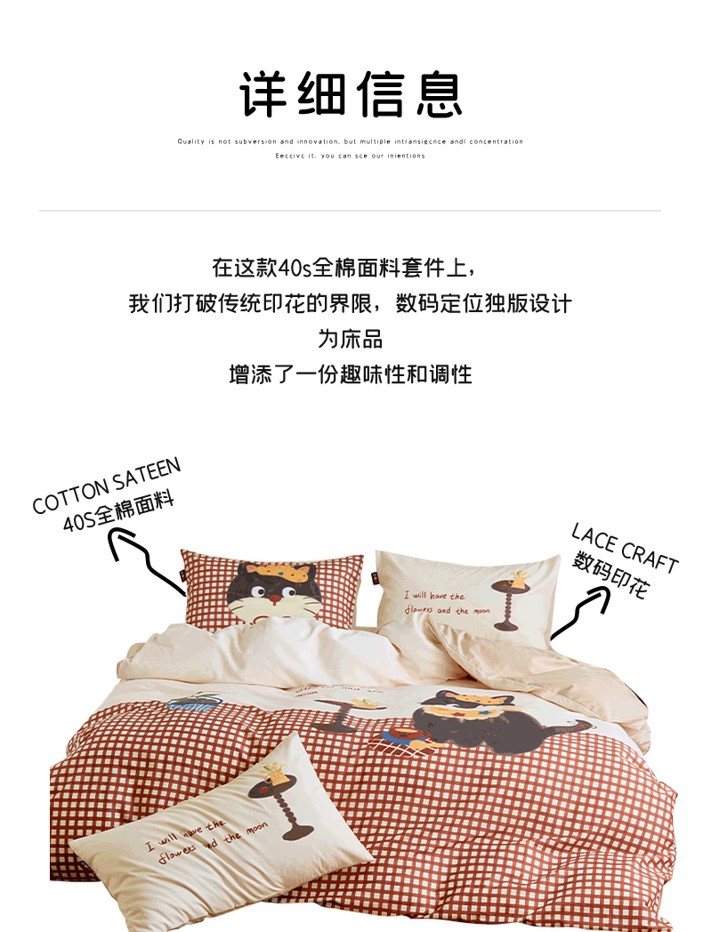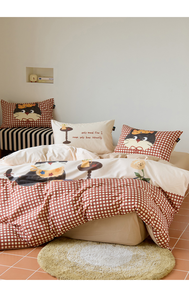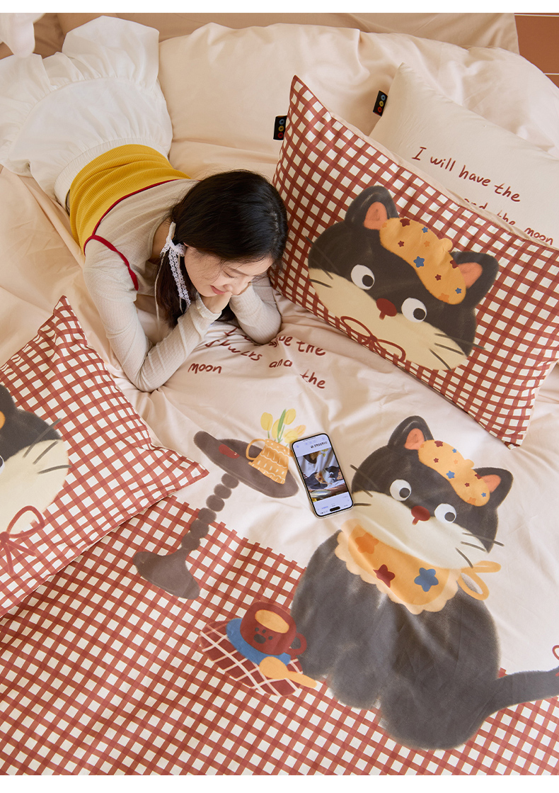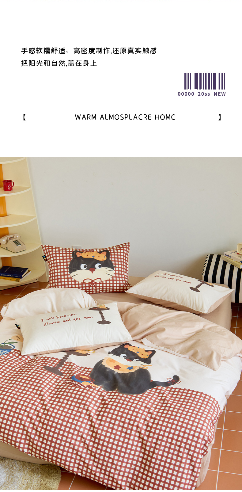 商品名称:RYB红黄兰 开学季2025新款ins设计师原创13372大版卡通数码印花40s全棉纯棉三件套四件套 红格猫咪