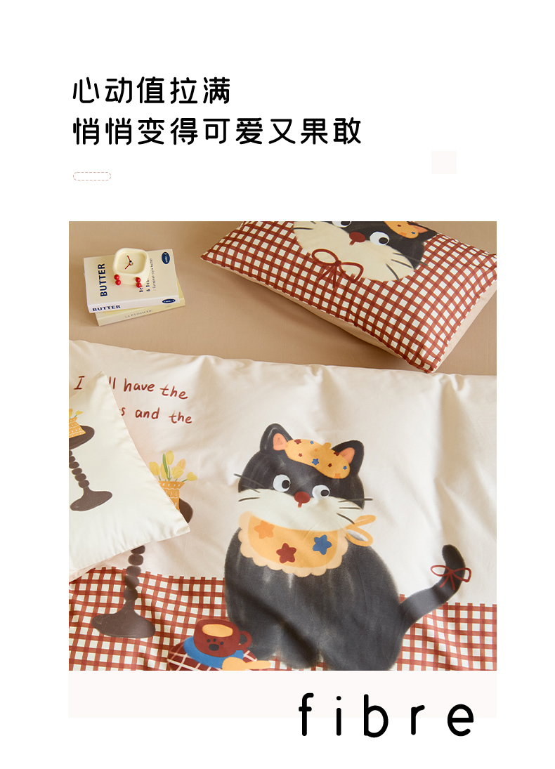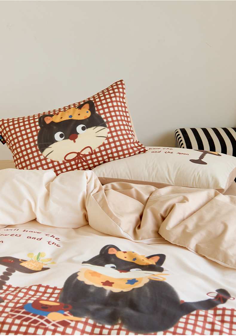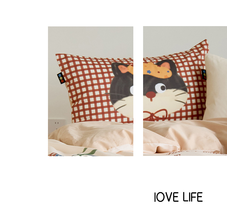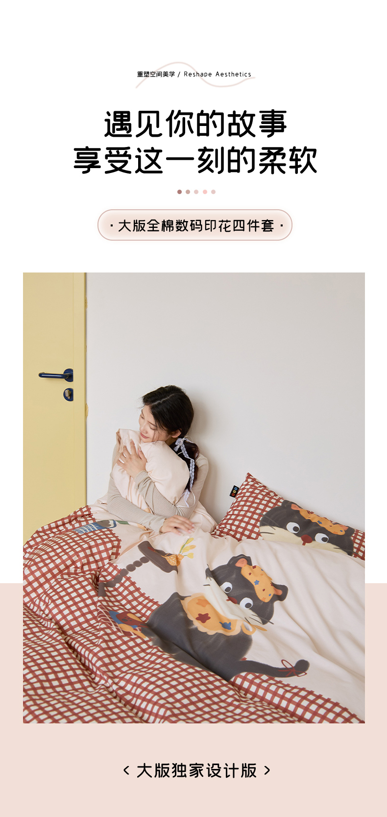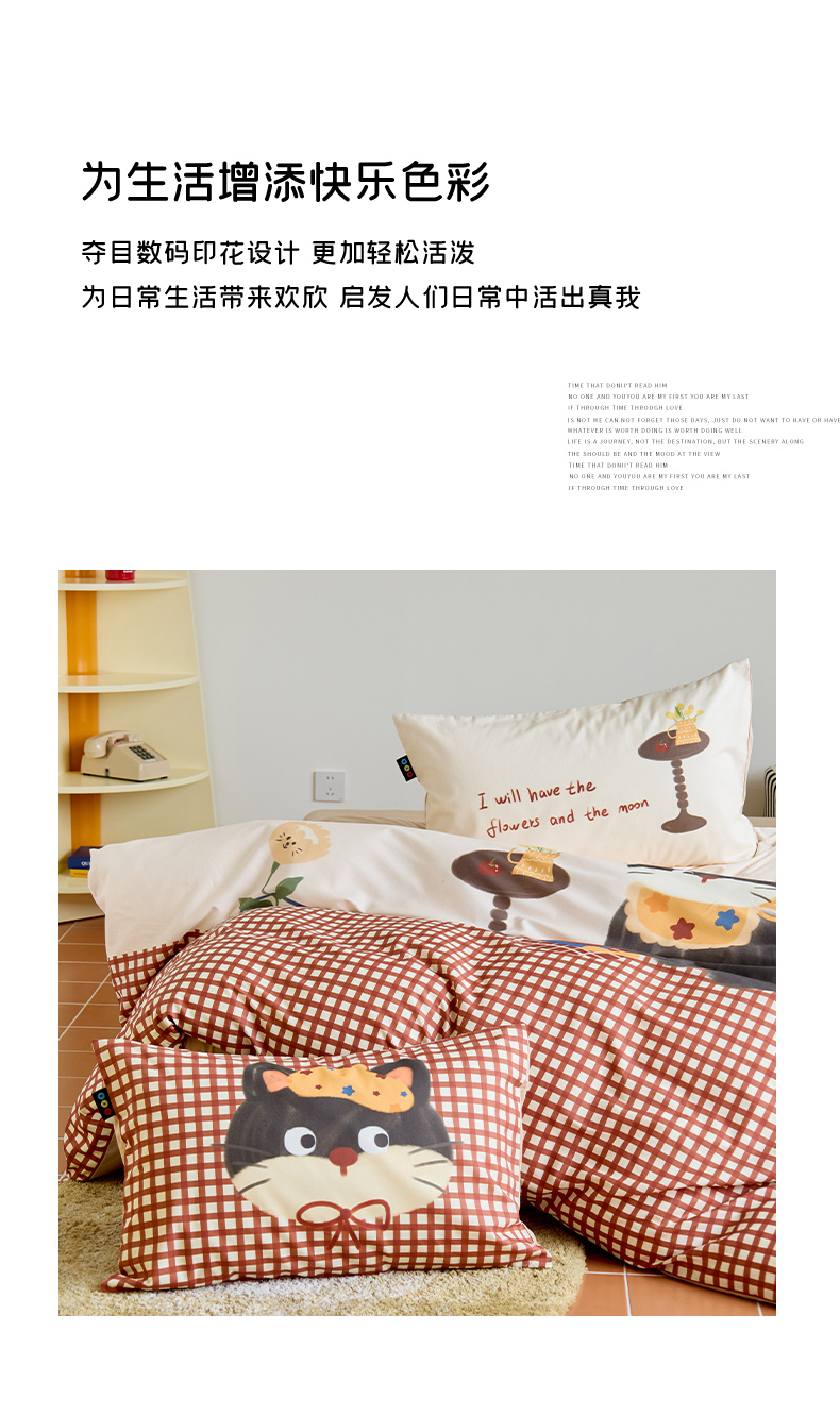 商品名称:RYB红黄兰 开学季2025新款ins设计师原创13372大版卡通数码印花40s全棉纯棉三件套四件套 红格猫咪