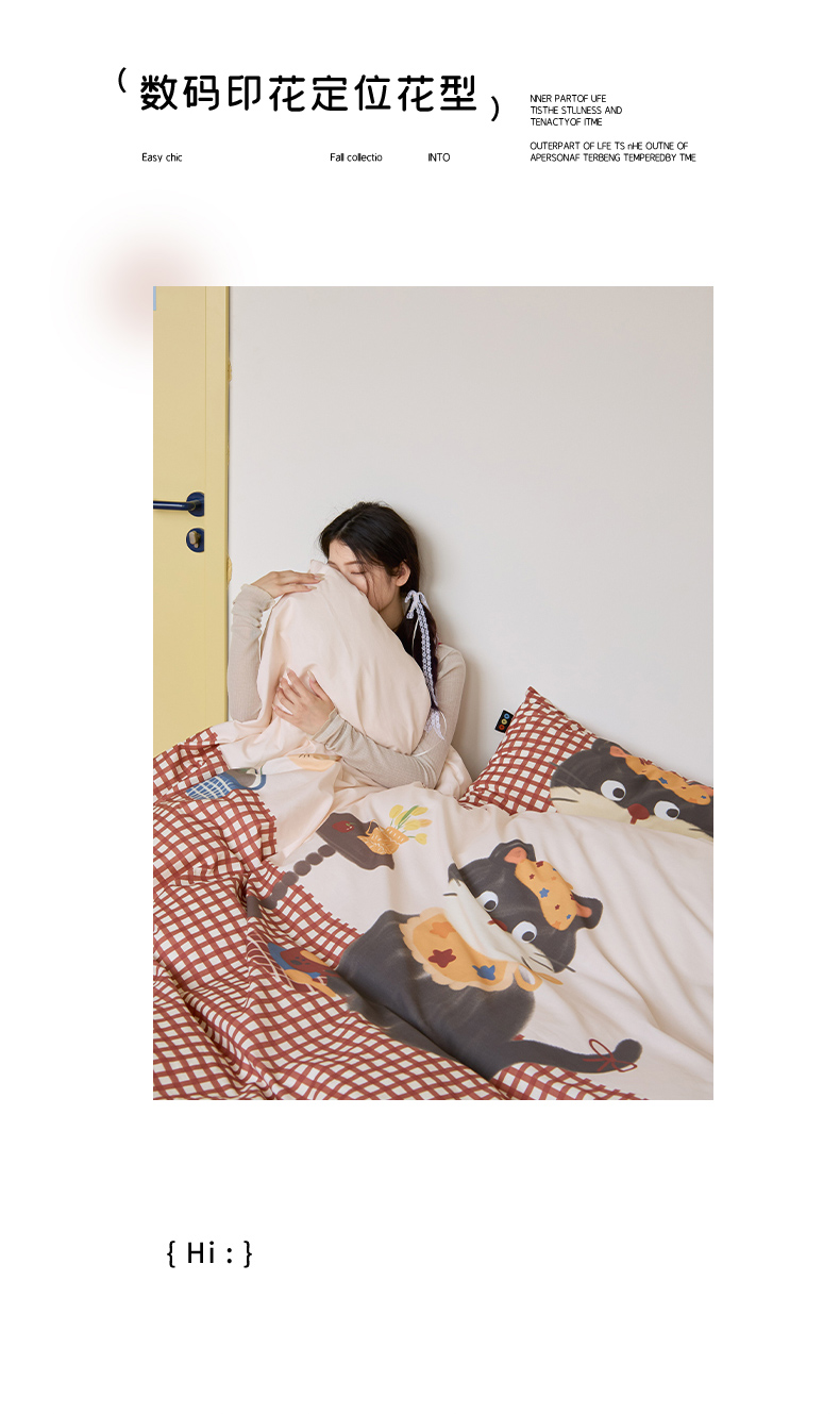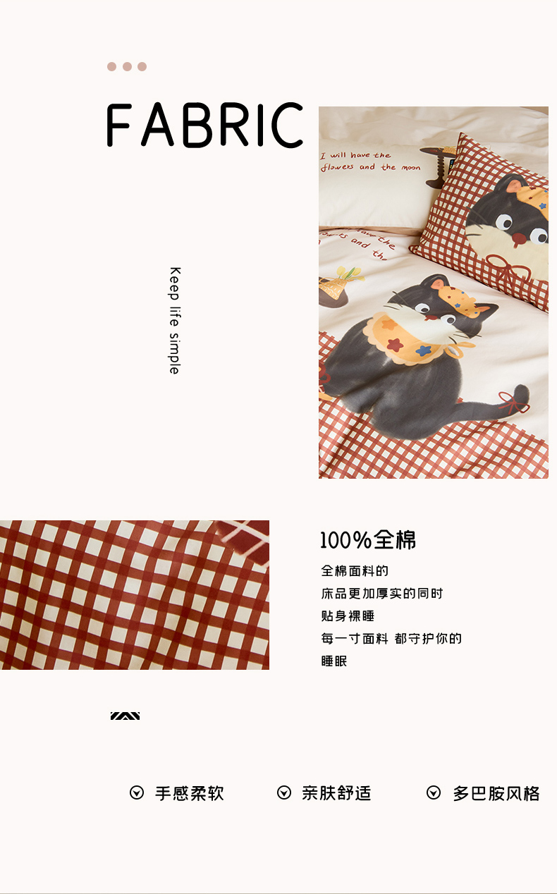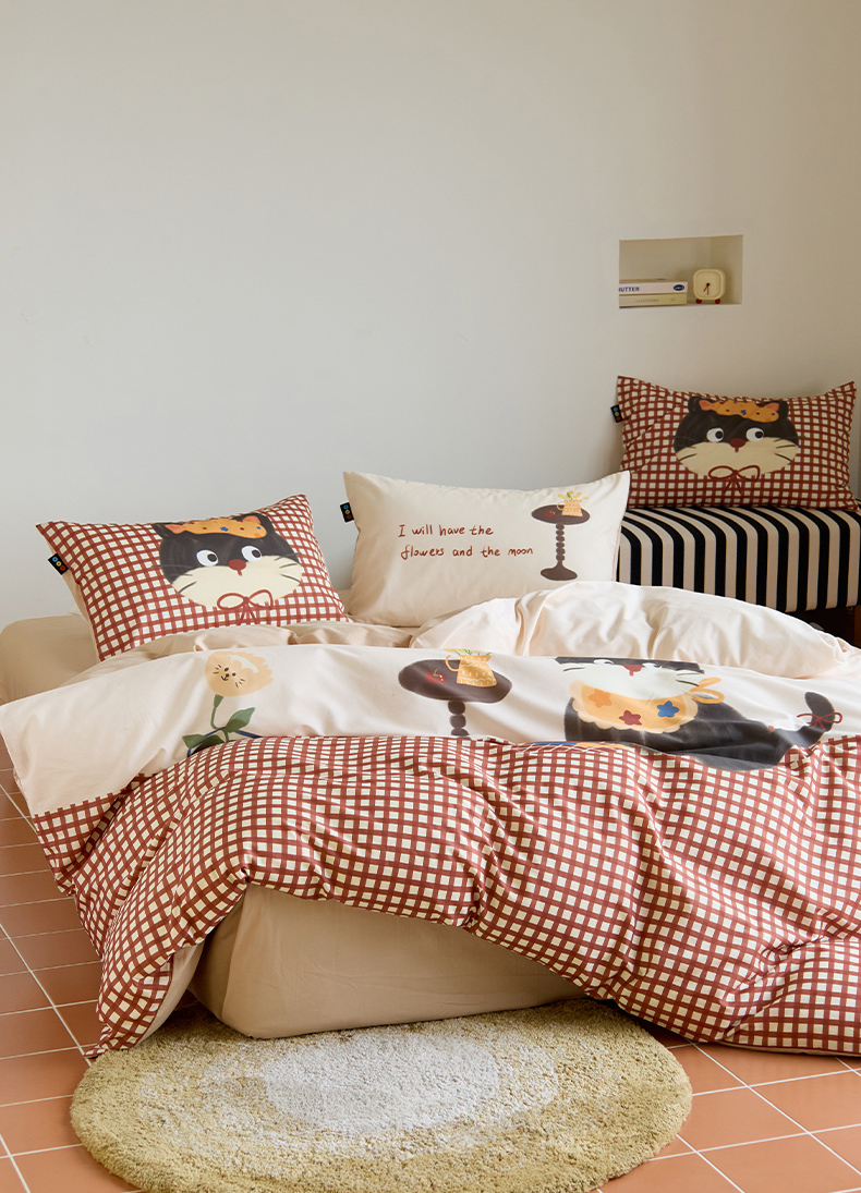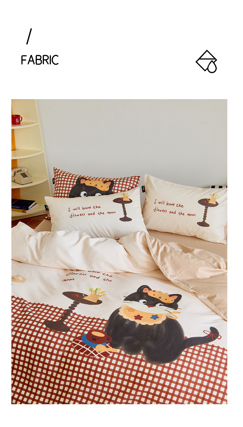 商品名称:RYB红黄兰 开学季2025新款ins设计师原创13372大版卡通数码印花40s全棉纯棉三件套四件套 红格猫咪