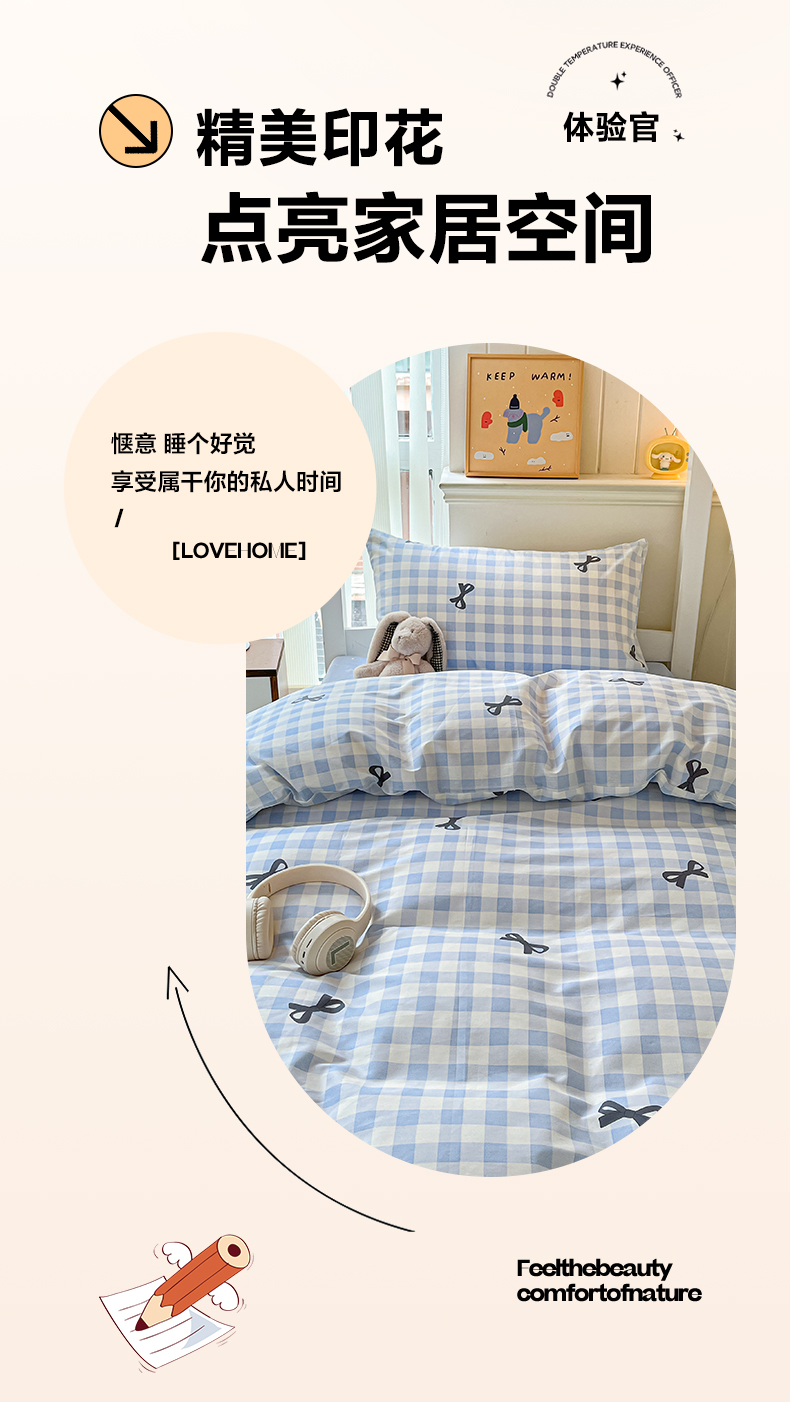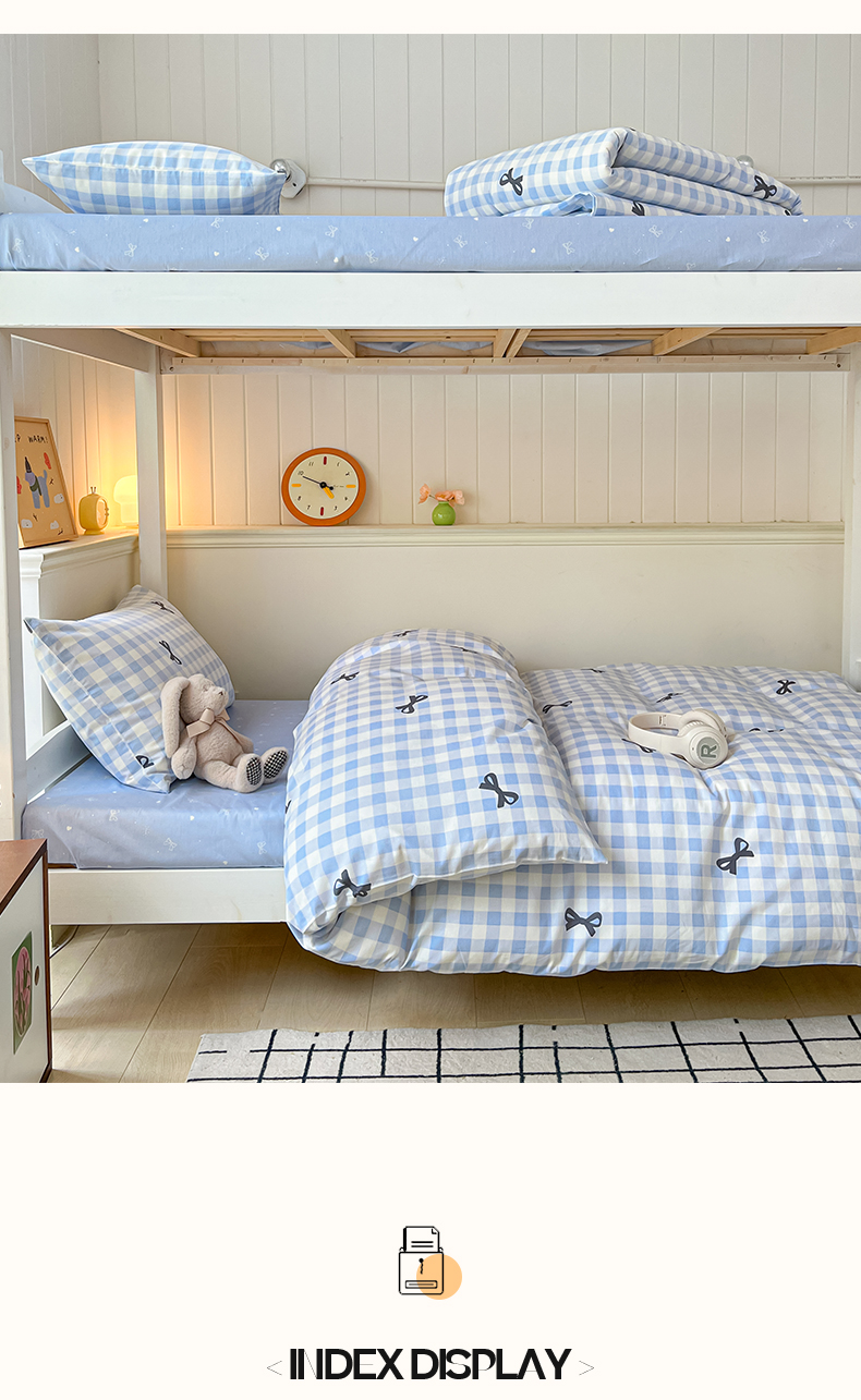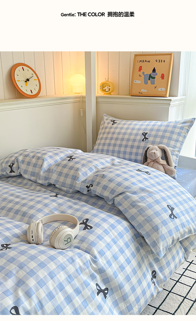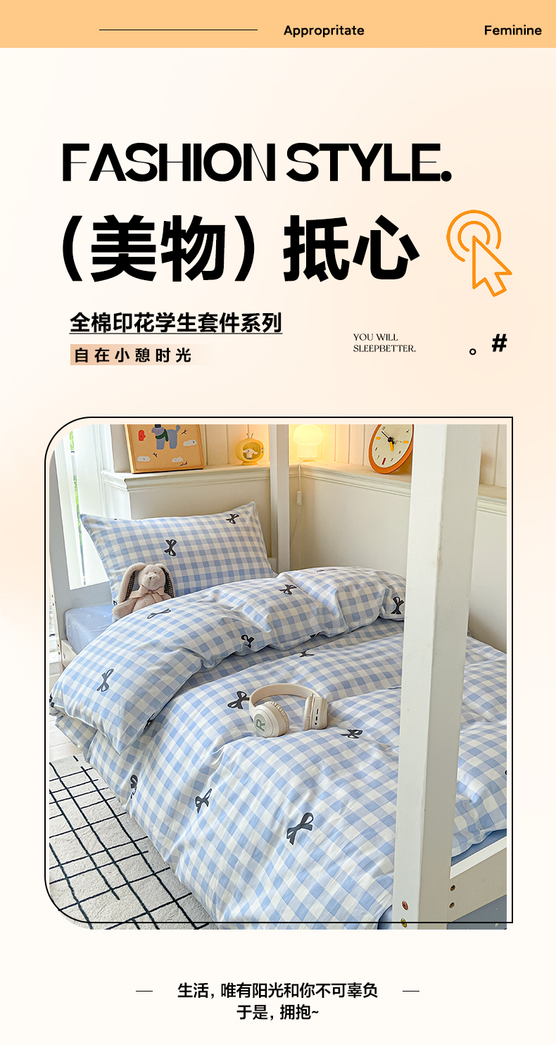 当前位置: 91家纺网 > 商品网购 > 床品套件 > 三件套 > 雅居纺家纺 2025新款全棉纯棉印花系列学生宿舍三四件套上下铺三件套 蓝格子蝴蝶结