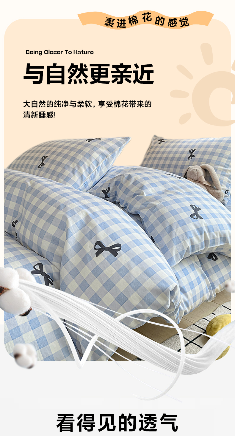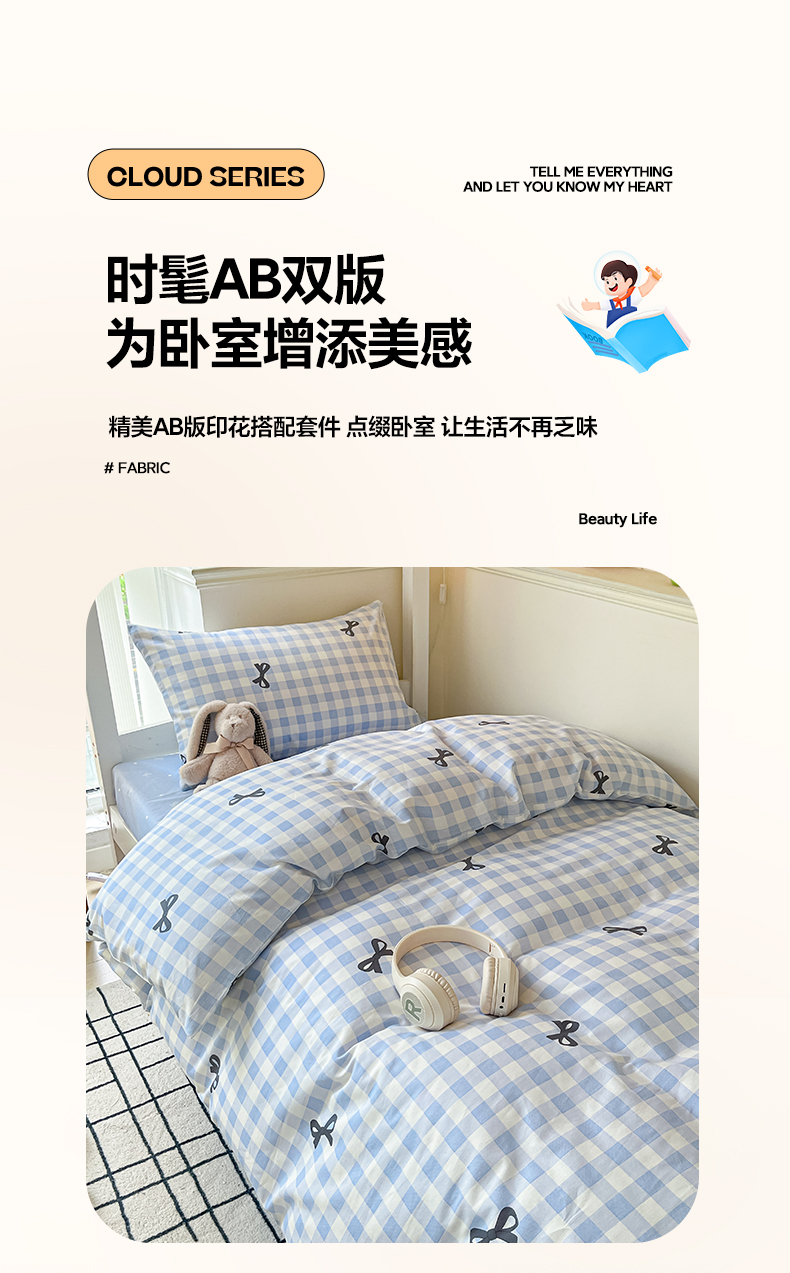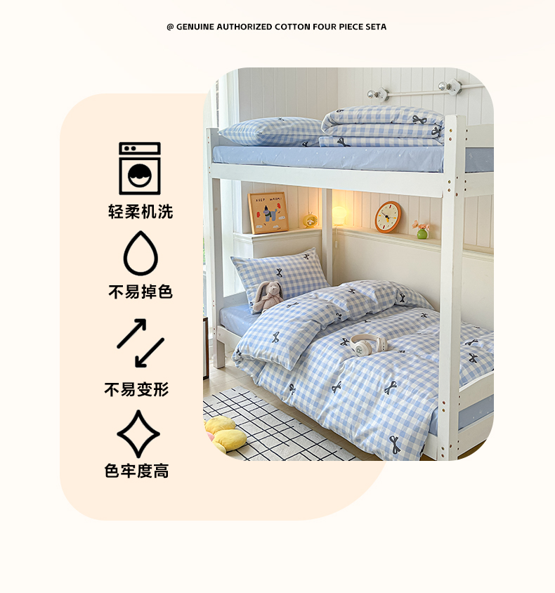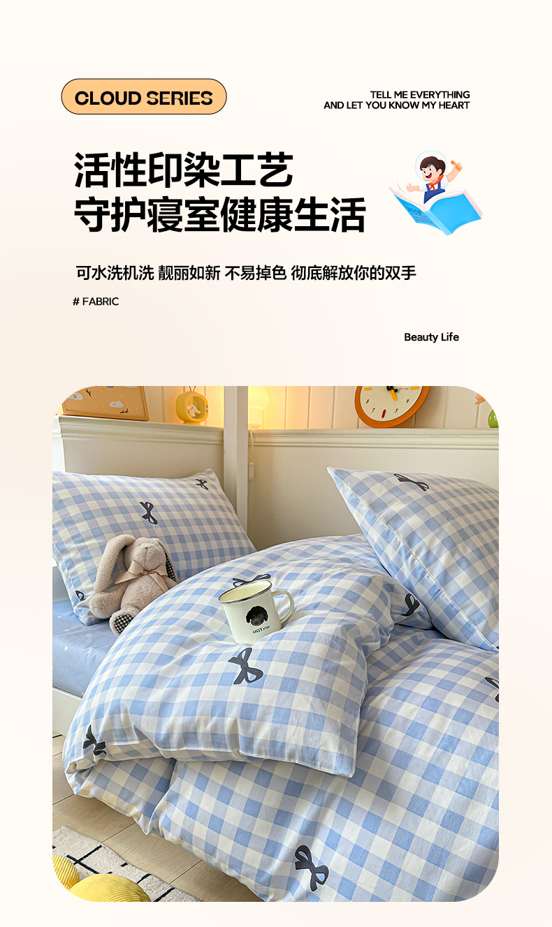 当前位置: 91家纺网 > 商品网购 > 床品套件 > 三件套 > 雅居纺家纺 2025新款全棉纯棉印花系列学生宿舍三四件套上下铺三件套 蓝格子蝴蝶结