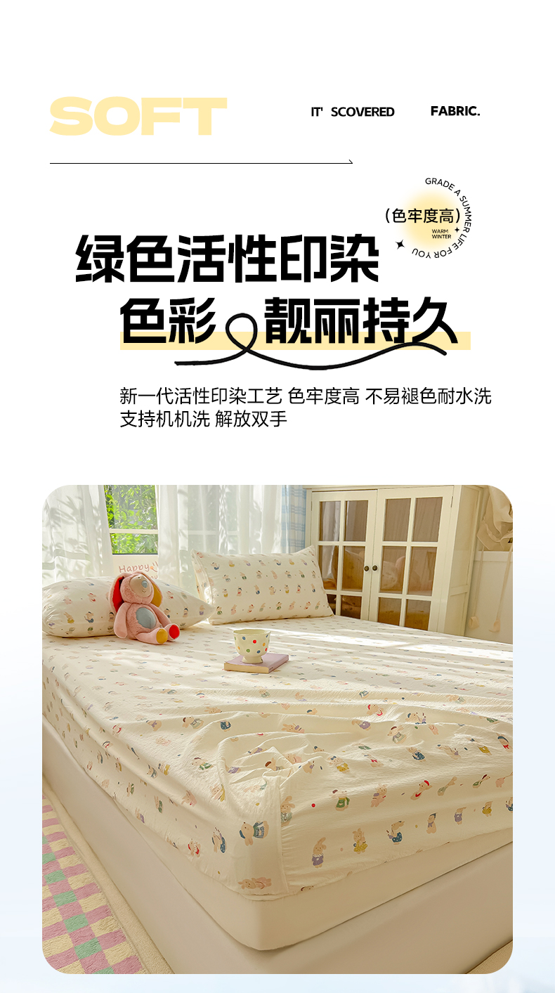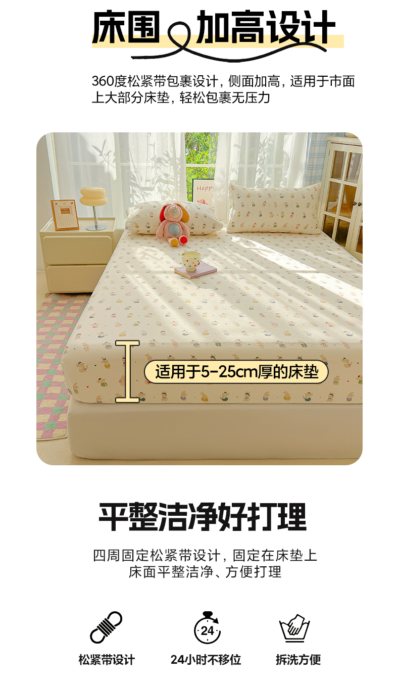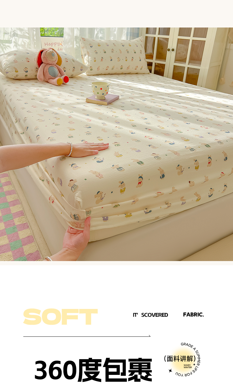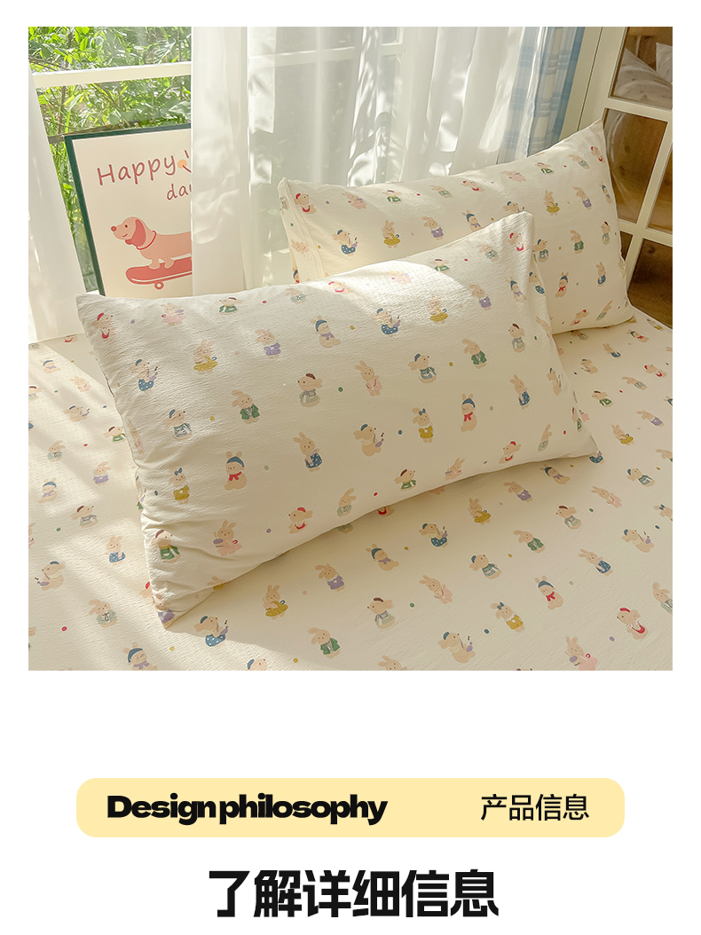 • 91家纺网 家纺一手货源 找家纺 韩巢家纺 2025新款卡通双层纱床笠单品床笠床笠单件热销款防滑床单床套枕套三件套 兔子集合